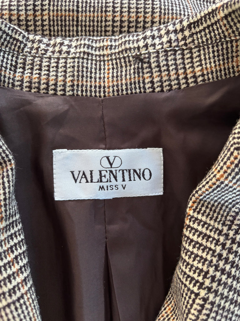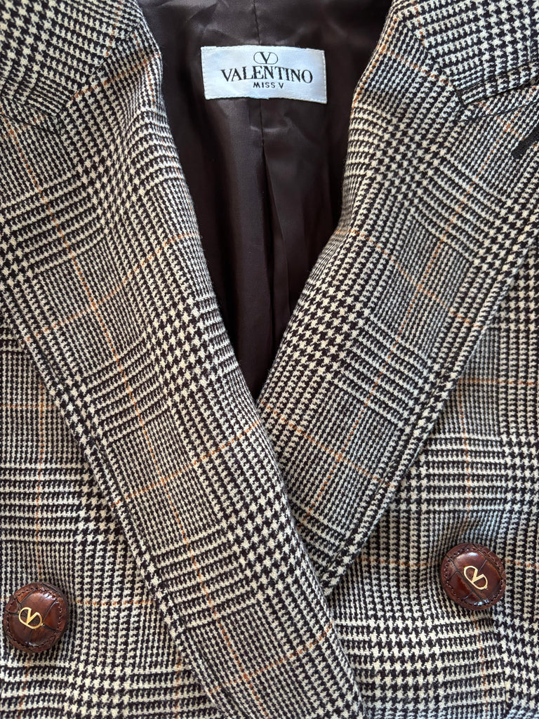 Blazer en laine à l’imprimé Prince de Galles dans des couleurs crème, marron et camel. Coupe légèrement ajustée à la taille, 2 petites épaulettes et fermeture croisée par boutons recouverts de cuir façon alligator et monogrammés d’un V doré. Petit col plat et grands revers en pointe avec détail de boutonnière décorative. 2 poches décoratives avec rabat, 2 fentes d’aisance à l’arrière (avec cordon de maintien). Doublé.