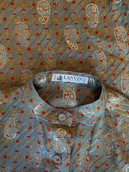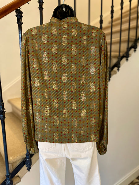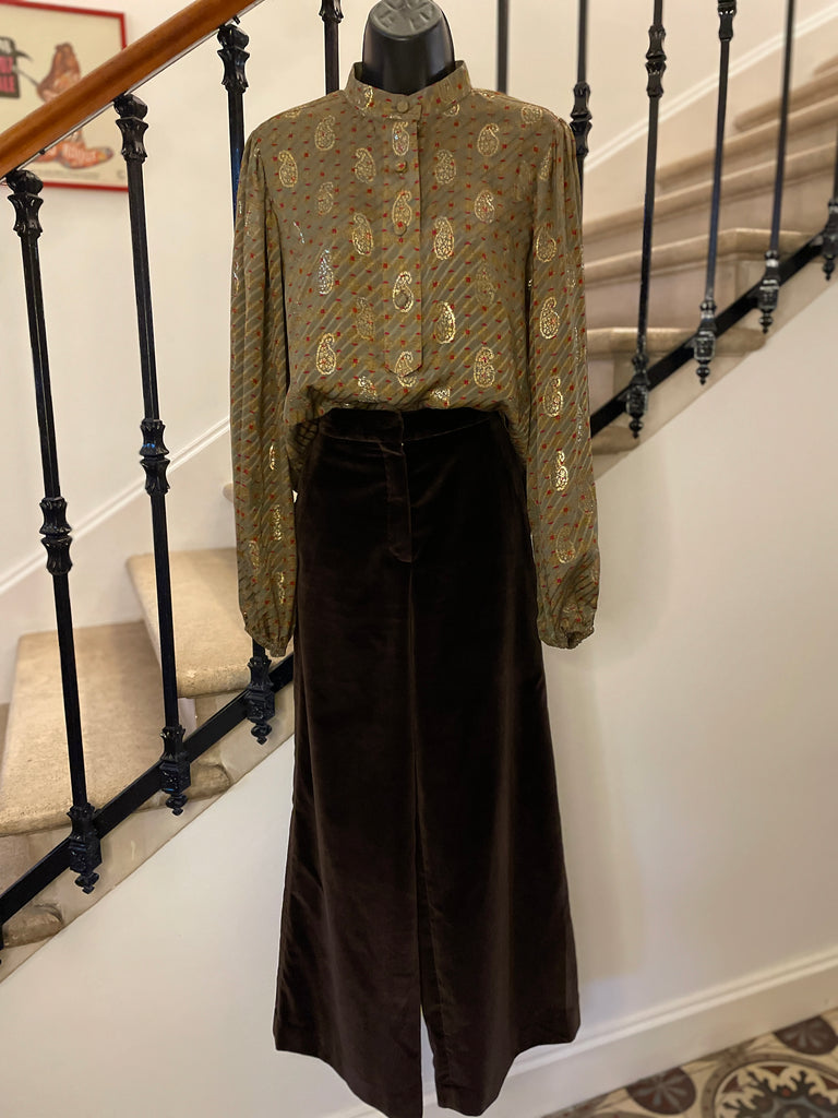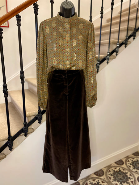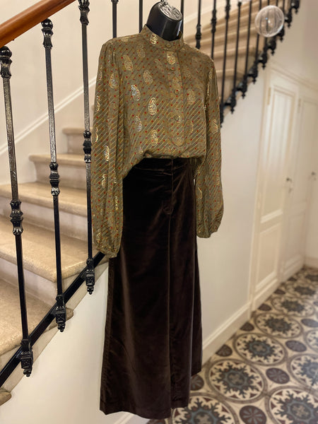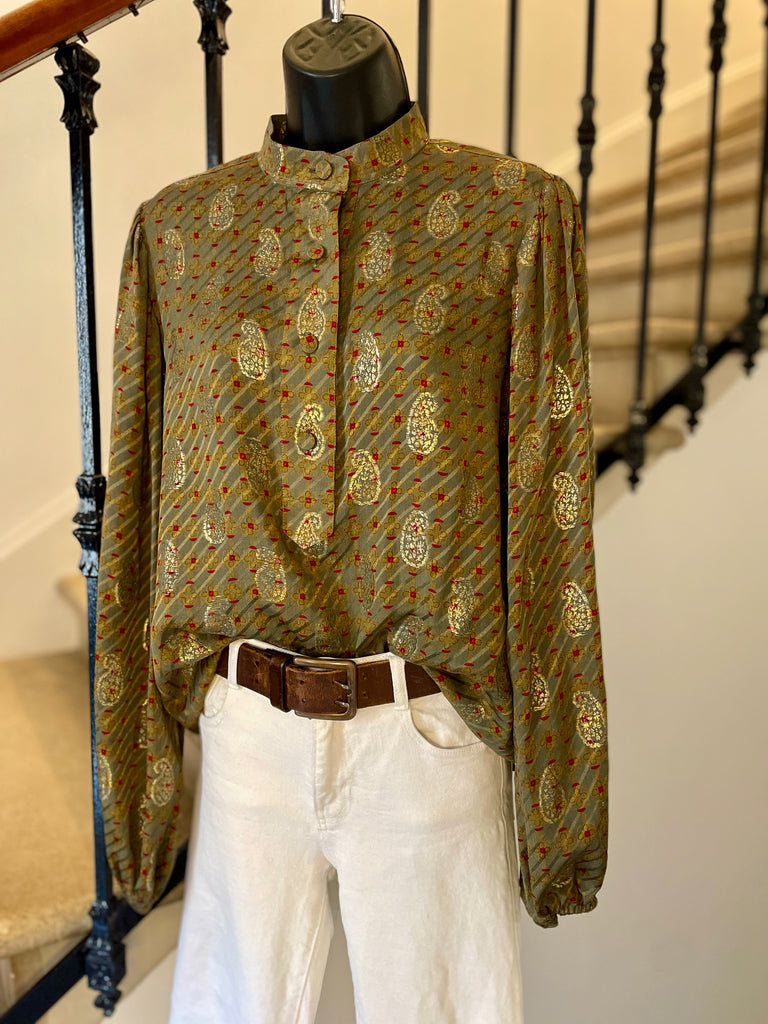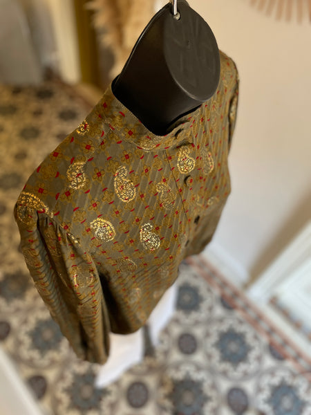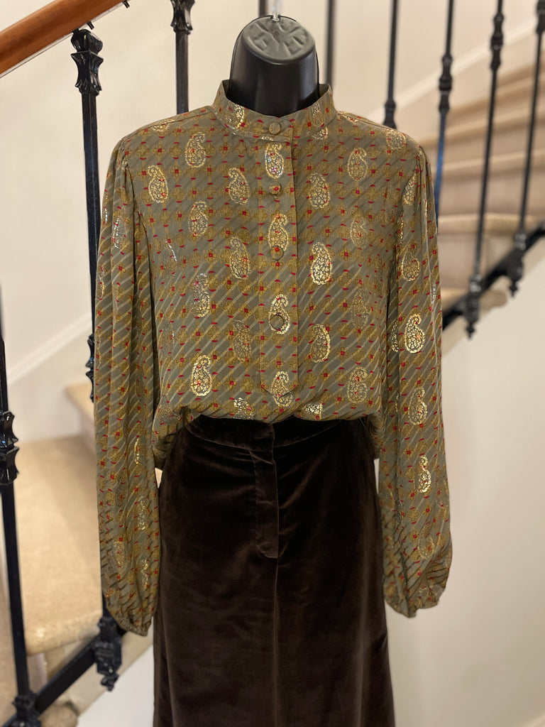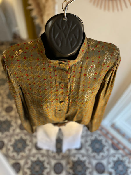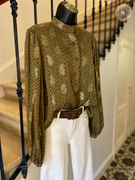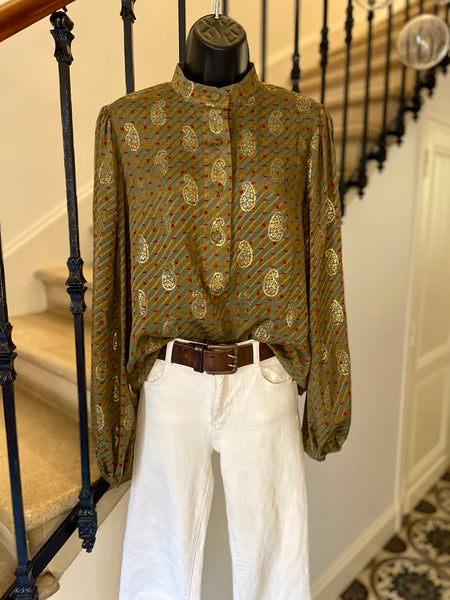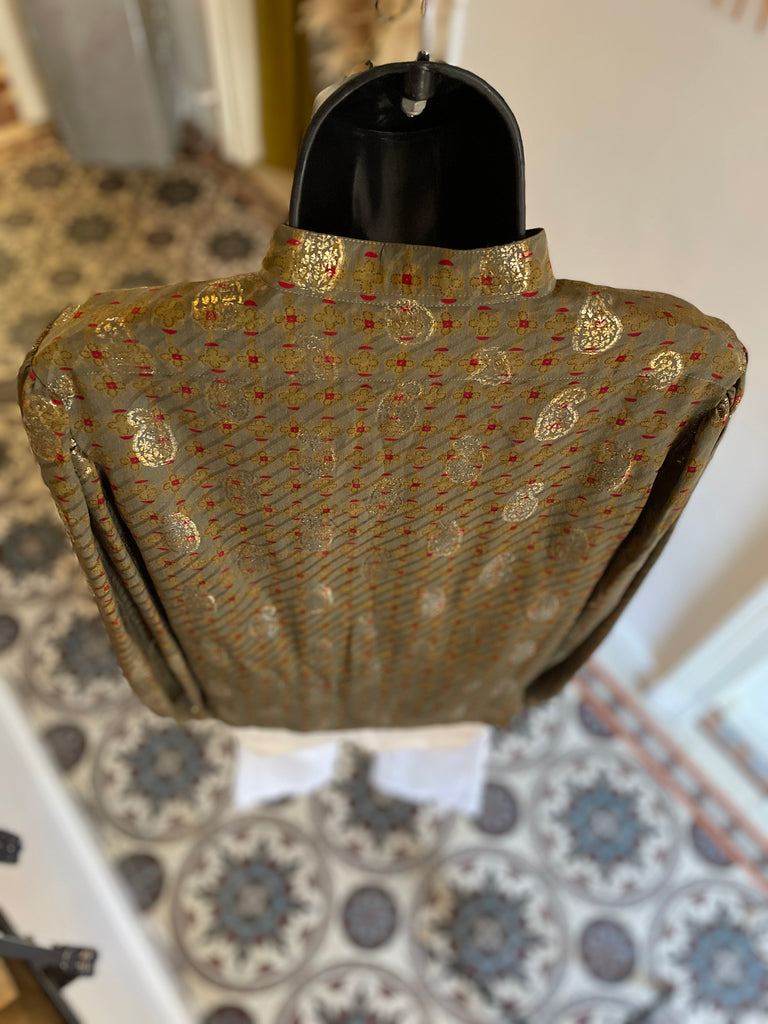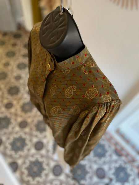 Blouse en soie façonnée de rayures en diagonale de couleur bronze irisé et brodée d’un motif cachemire en lurex doré sur fond de kaki avec imprimé figuratif bronze et bordeaux. Coupe droite et ample, col officier avec fermeture par boutons recouverts jusqu’à la poitrine et manches bouffantes par jeu de plis aux épaules et poignets elastiqués.
