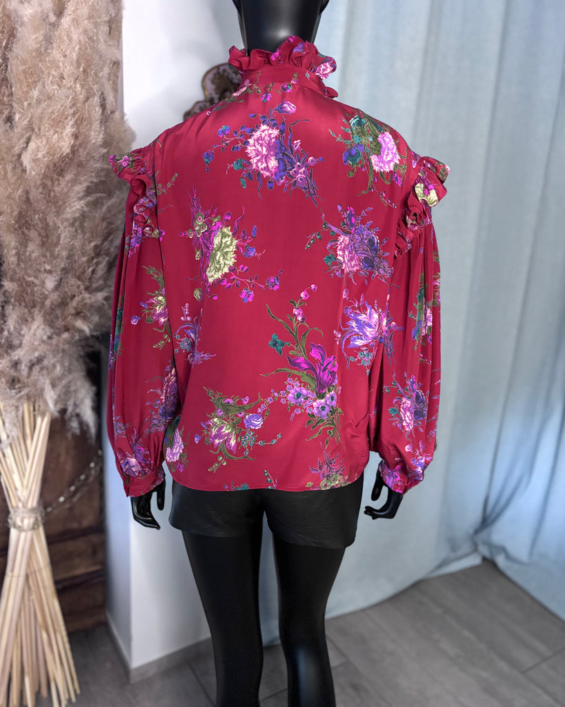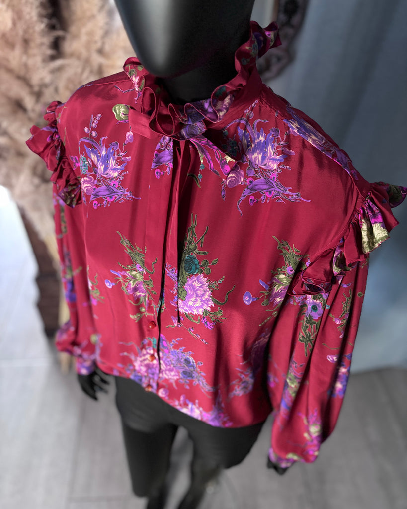 Blouse en soie à l’imprimé floral sur fond rouge-bordeaux. Coupe droite, col montant avec volant et lavallière, épaules bordées d’un volant, manches bouffantes avec poignets fermés par 1 bouton. Fermeture par petits boutons perles orangés.