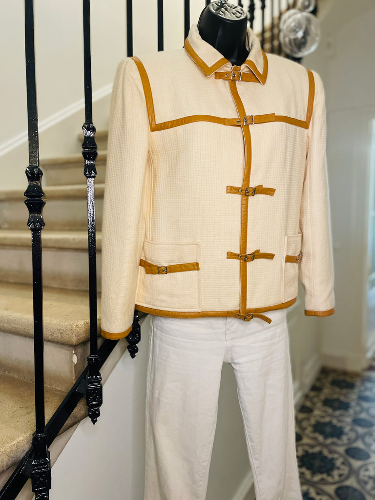 Blouson en laine (tissage façon piqué de coton ou nid d'abeille) de couleur crème avec détails en simili cuir camel. Fermeture par 4 petites lanières avec boucle. 2 poches avec détails simili cuir et boucle. Epaulé.