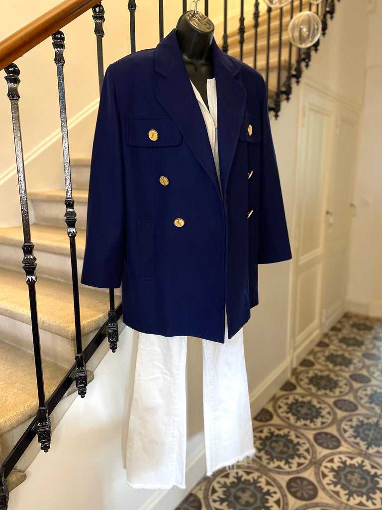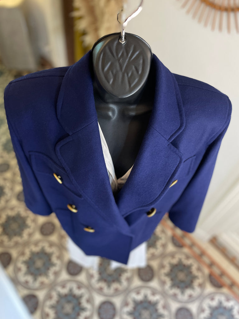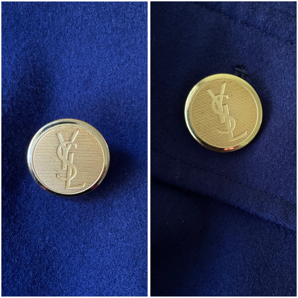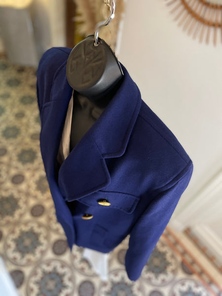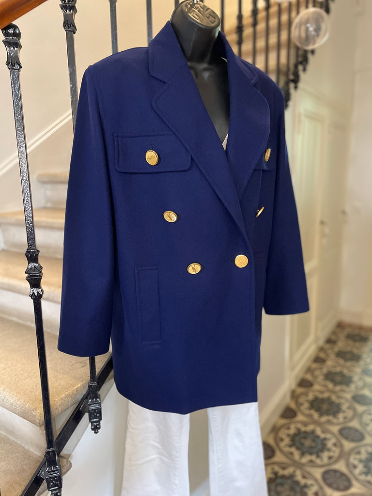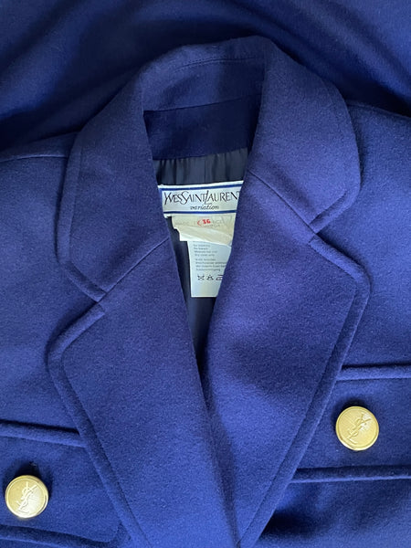Caban de couleur bleu marine tirant sur le violet. Coupe structurée par des épaulettes épaisses. Fermeture croisée par boutons dorés, striés et monogrammés YSL. 2 pochettes poitrine factices avec rabat et 2 poches latérales passepoilées. Doublé.