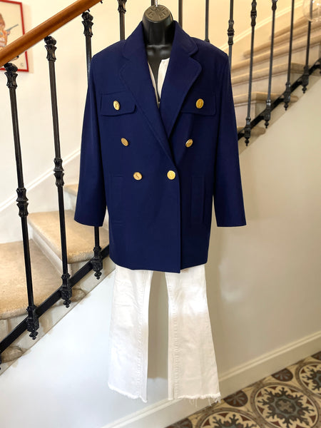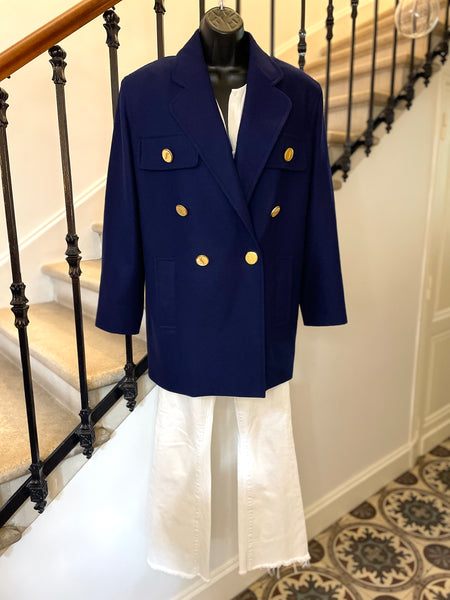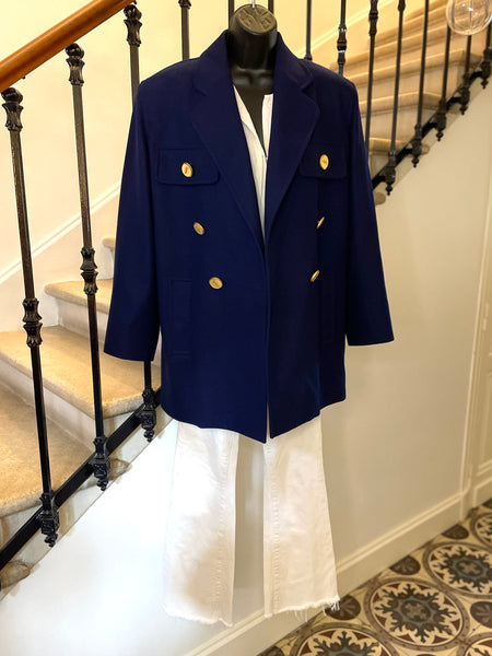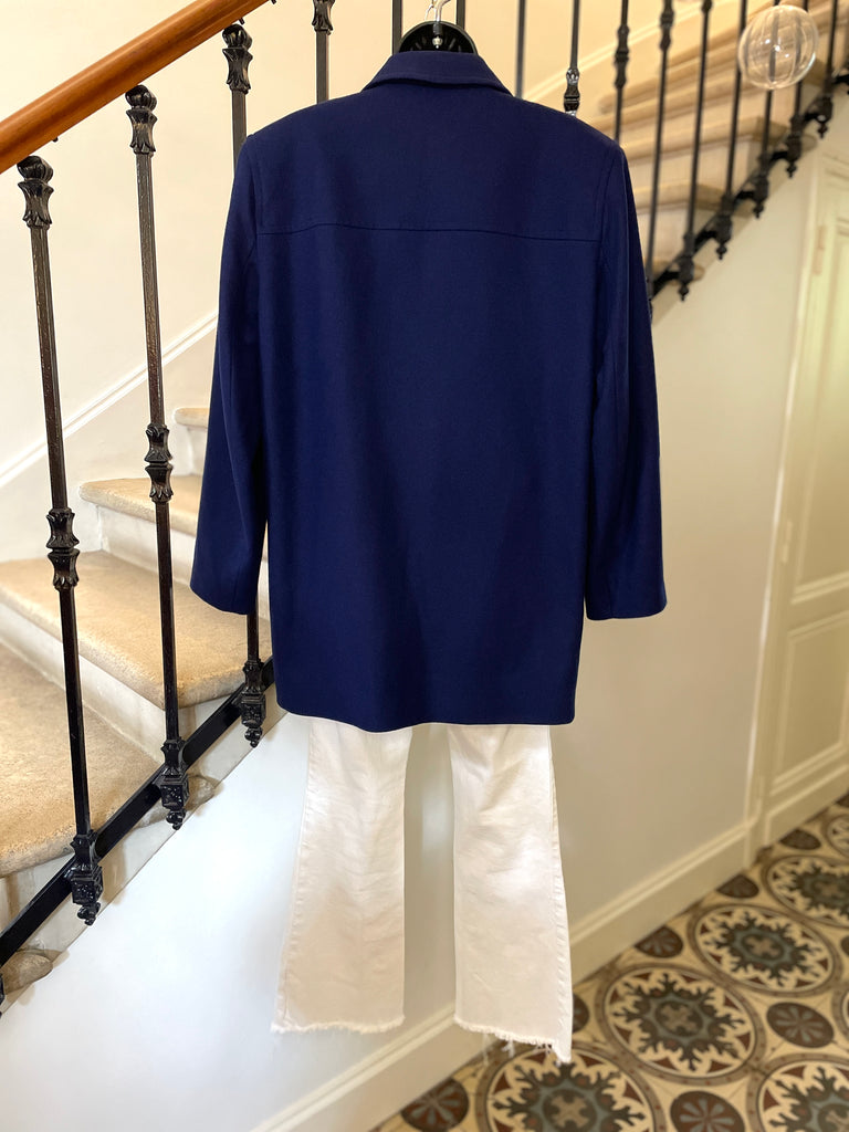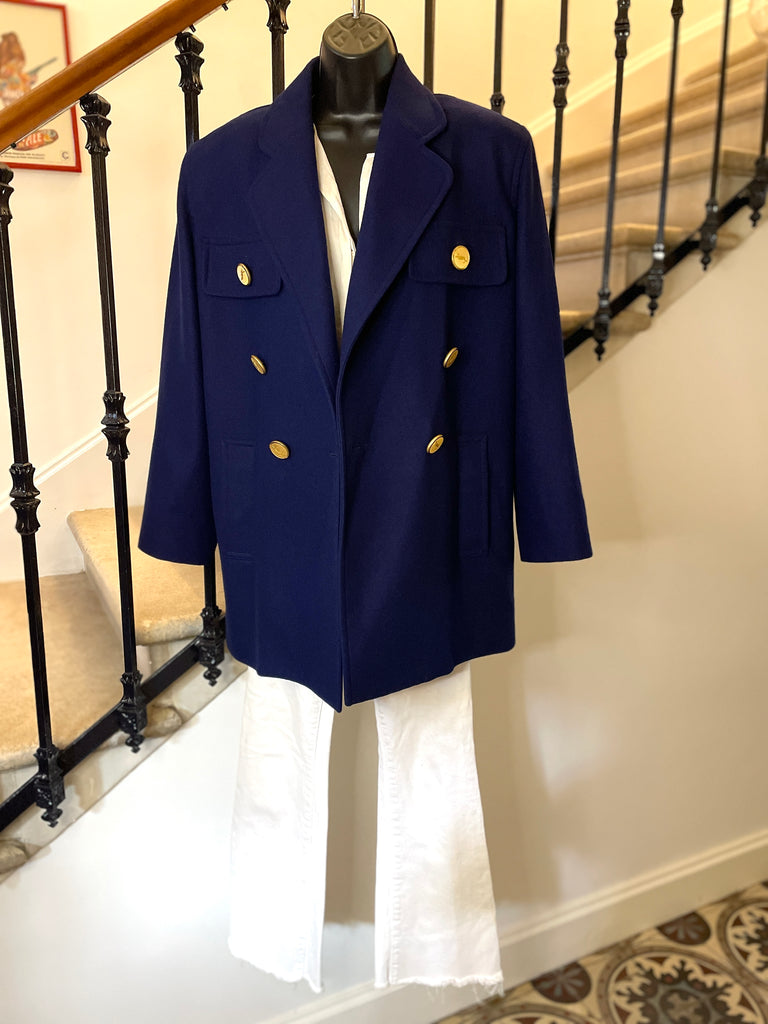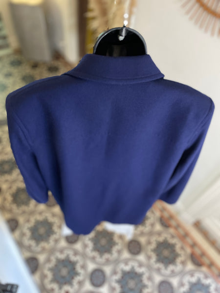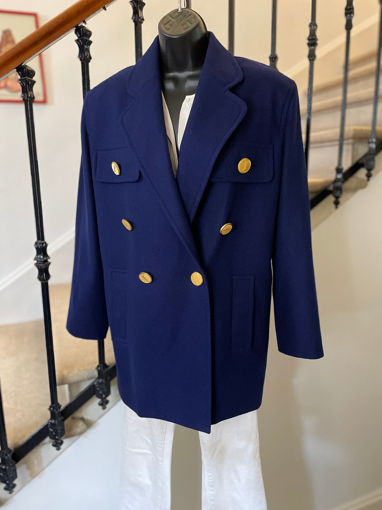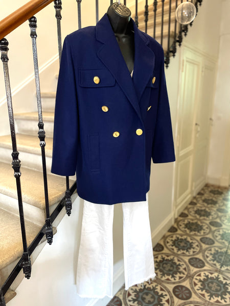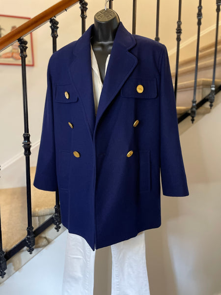 Caban de couleur bleu marine tirant sur le violet. Coupe structurée par des épaulettes épaisses. Fermeture croisée par boutons dorés, striés et monogrammés YSL. 2 pochettes poitrine factices avec rabat et 2 poches latérales passepoilées. Doublé.