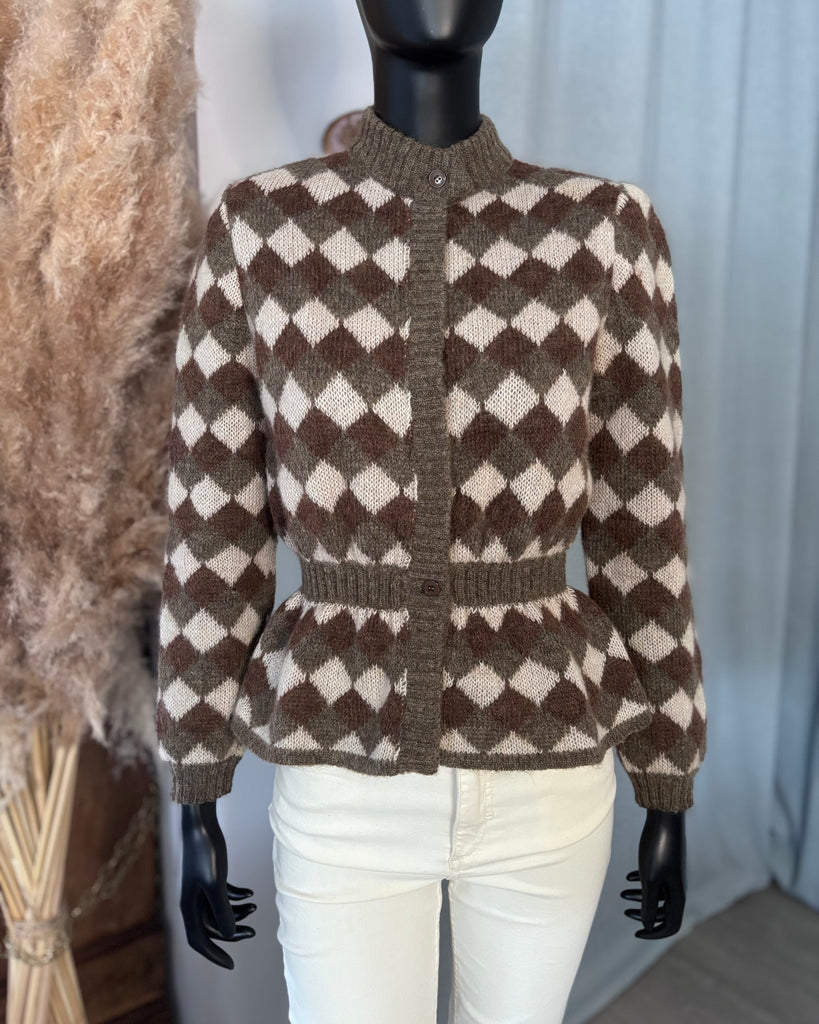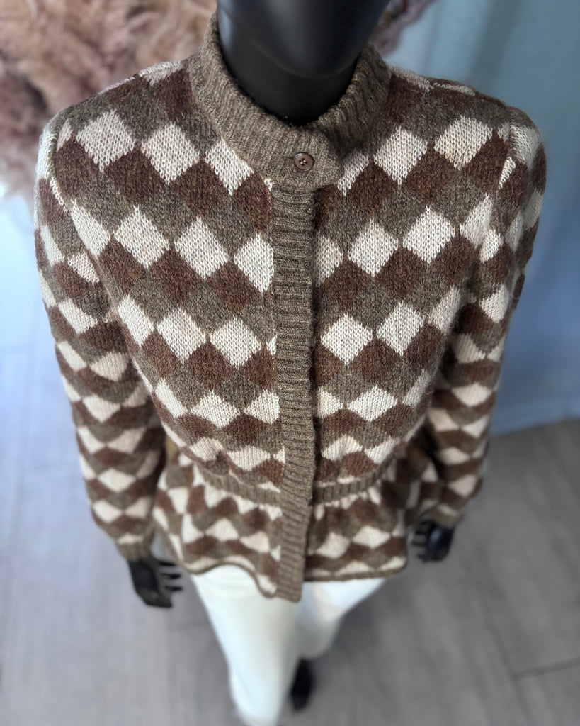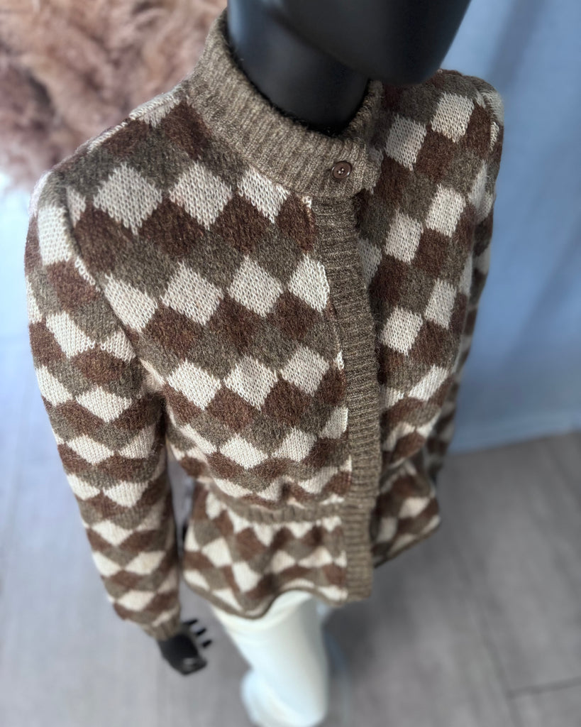 Cardigan en laine au motif triangle dans des couleurs crème, kaki et marron. Coupe resserrée à la taille qui est légèrement élastique, petit col montant et épaulettes (qui peuvent être retirées. Fermeture partiellement masquée par boutons