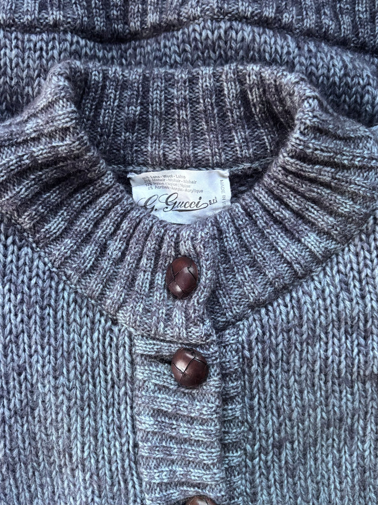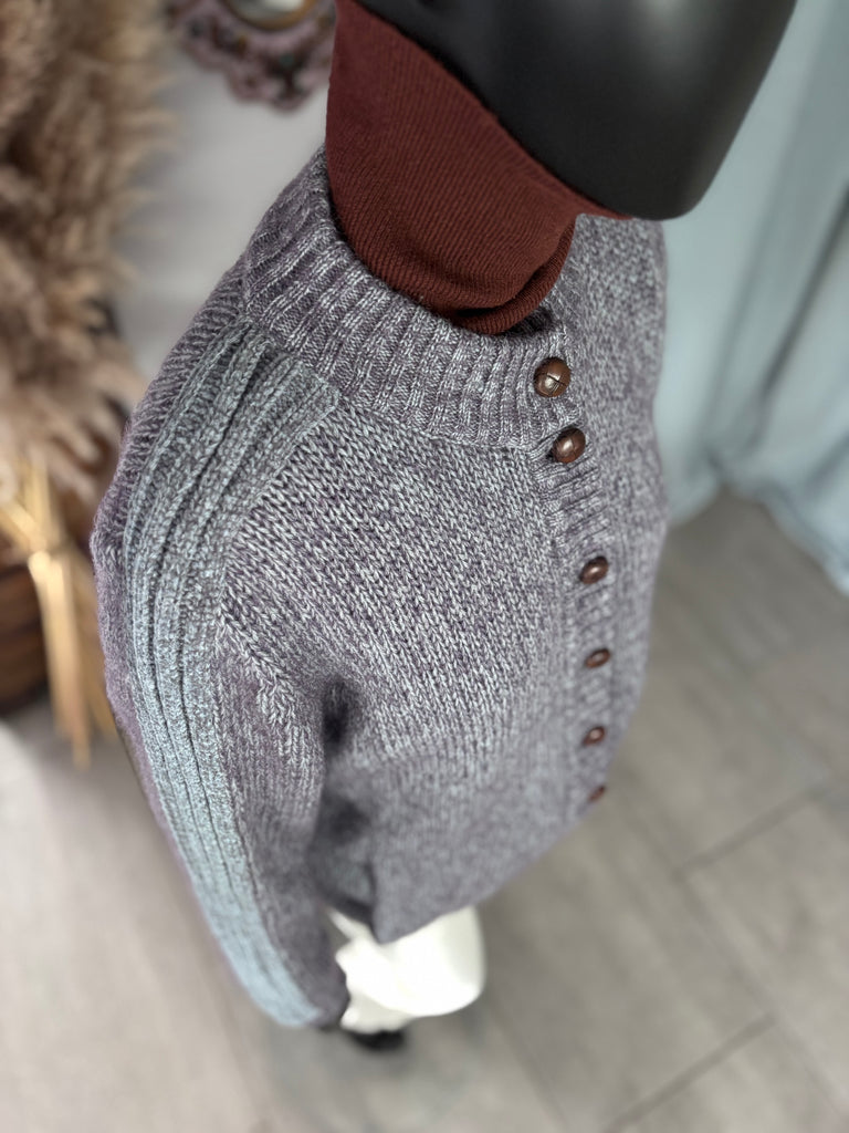 Cardigan en laine mélangée et chinée gris foncé et gris-bleu. Coupe droite, col, patte de boutonnage, poignets et ceinture en grosses côtes. Fermeture par boutons en cuir. Bras avec très grosses côtes en laine chenille de couleur bleu-gris. 2 grandes poches latérales.