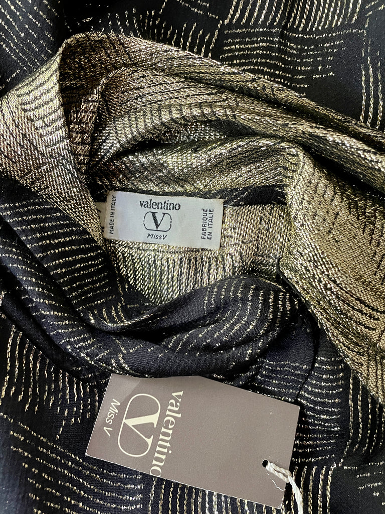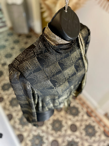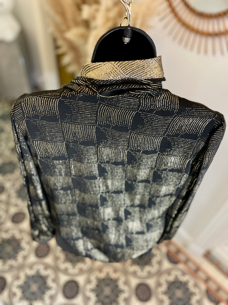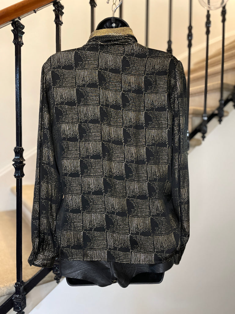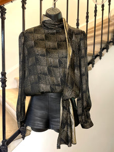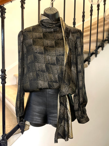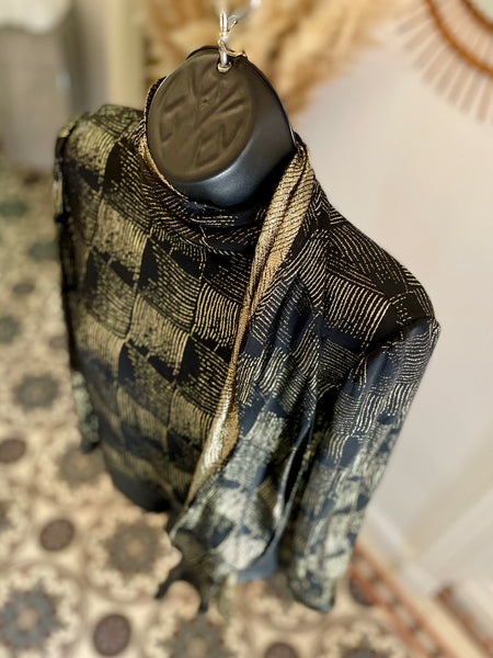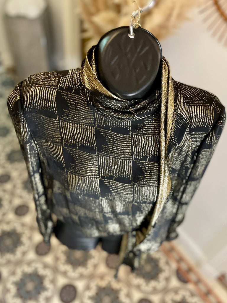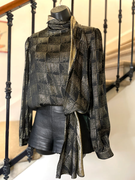Chemisier en soie et lurex de couleur noire et dorée. Fermeture par simple boutonnage masqué sur le côté, col lavallière large et long sur le côté gauche avec passant au bas de la blouse. Manches très légèrement ballon par jeu de plis aux épaules et poignets fermés par 1 bouton.