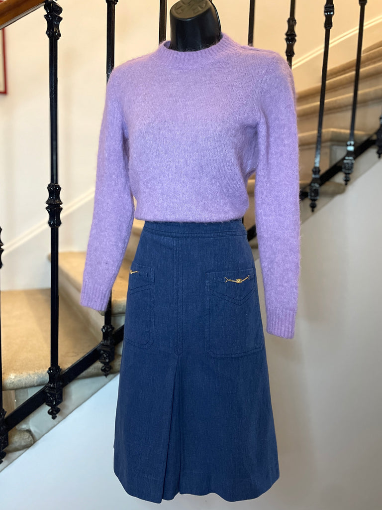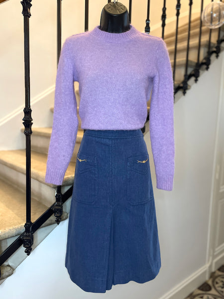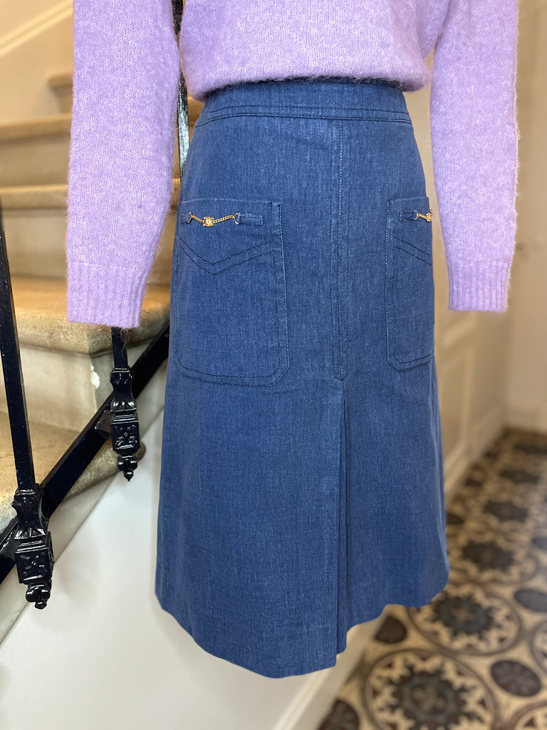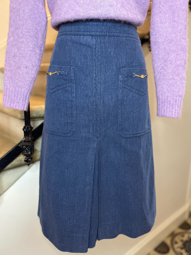 Jupe en coton façon jeans de couleur bleue jeans. Coupe évasée, taille haute et longueur midi avec grandes poches plaquées décorées de chaînettes dorées avec monogramme Triomphe. Grand plis creux à l’avant et à l’arrière. Fermeture dans le dos par zip masqué et 2 petits crochets intérieurs.