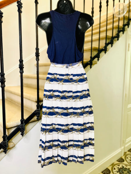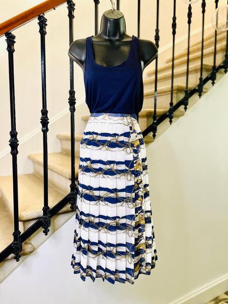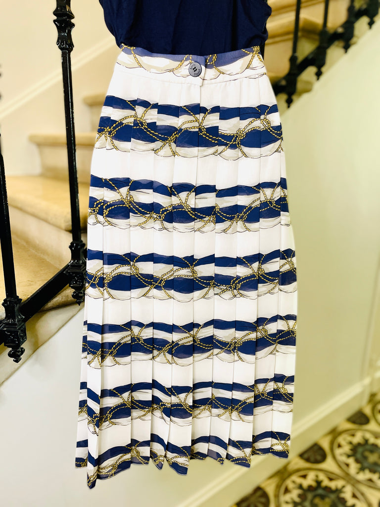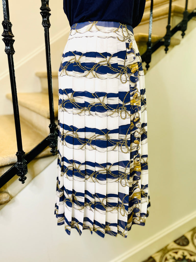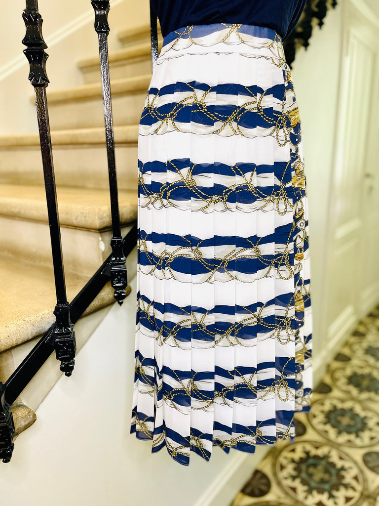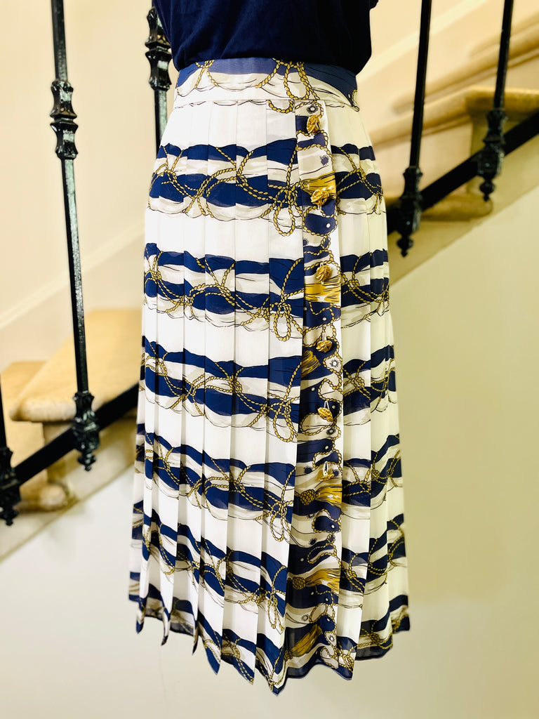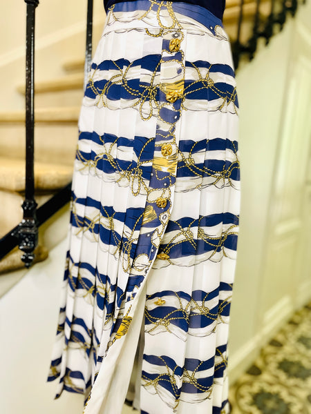 Jupe en polyester à l’imprimé d’inspiration Hermès dans des couleurs blanc, bleu marine et doré. Coupe taille haute ajustée sur les hanches grâce aux plis surpiqués qui se fondent ensuite en plis plats. Ouverture sur le côté fermée par des boutons dorés façon corde. Fermeture dans le dos par zip masqué et 1 bouton bleu marine siglé. Entierement doublée.