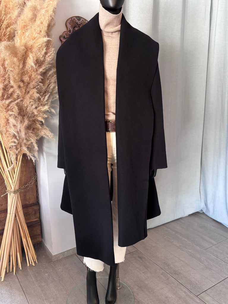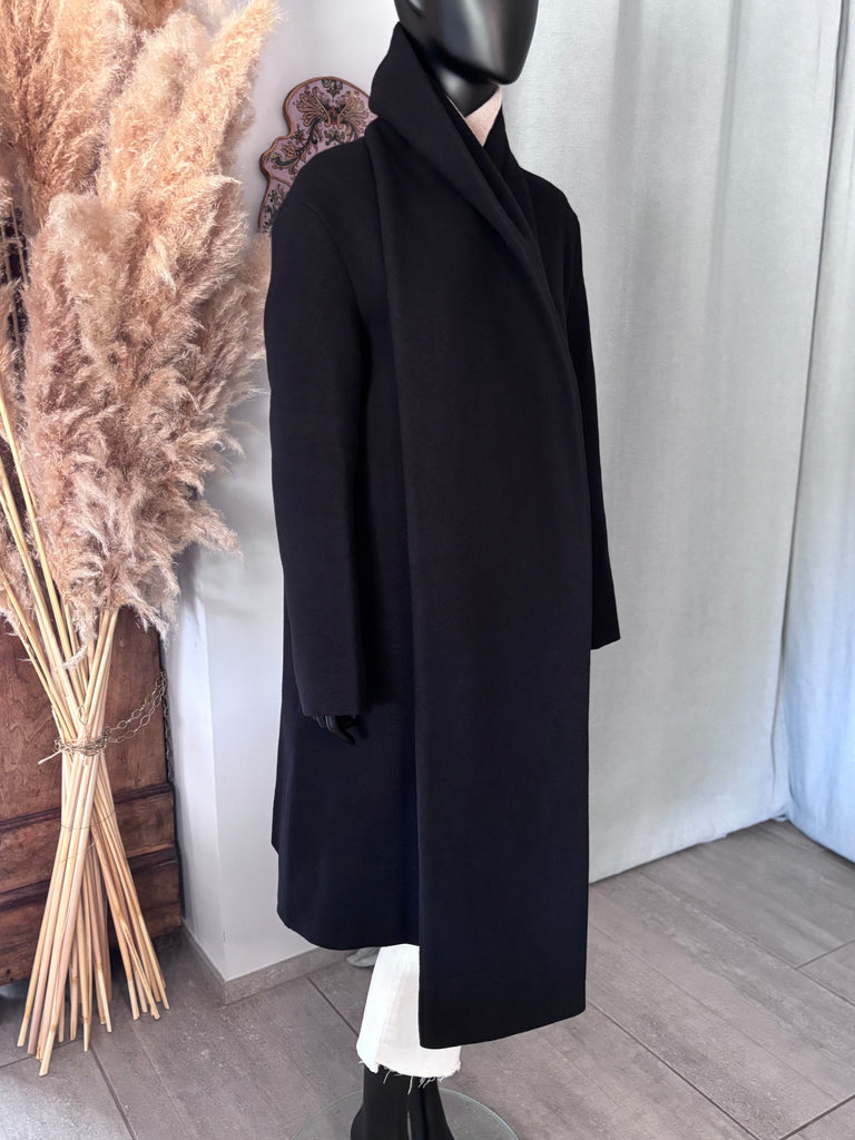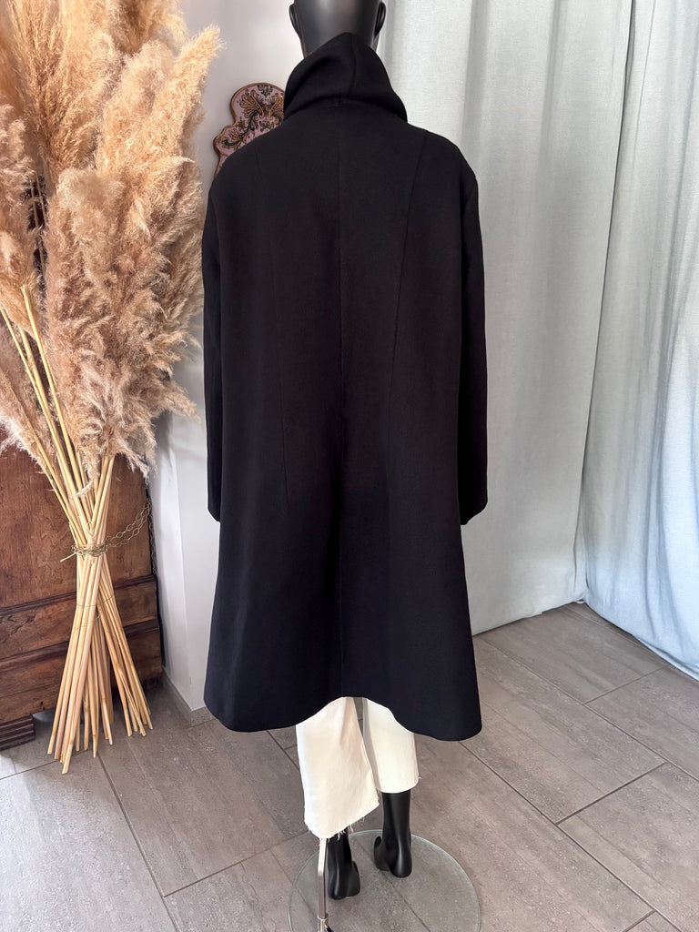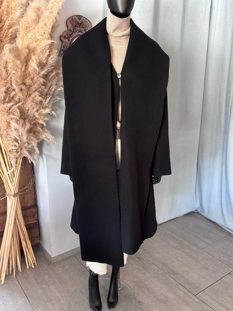 Manteau en laine bouillie épaisse de couleur noire. Coupe légèrement évasée, col structuré par une longue et large écharpe d’un côté et un large revers de l’autre, encolure en V et fermeture par un bouton siglé. 2 grandes poches dans le biais. Non doublé.