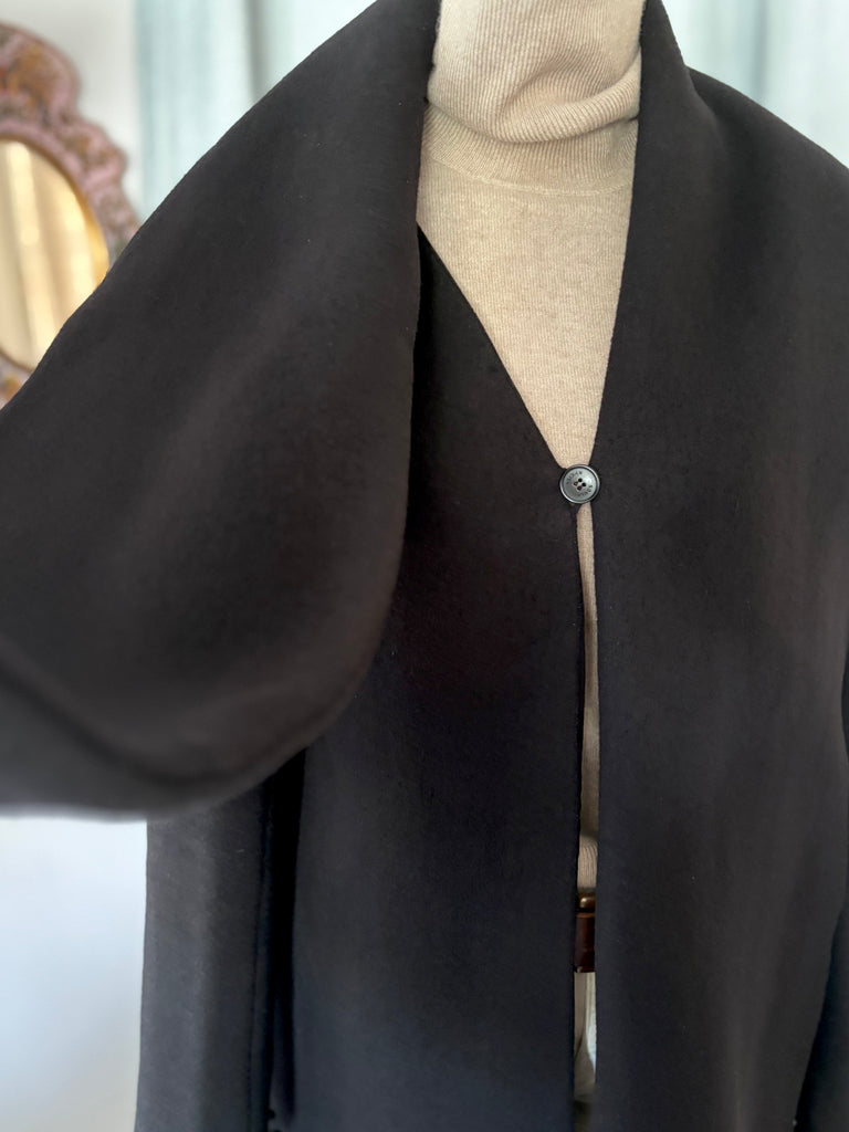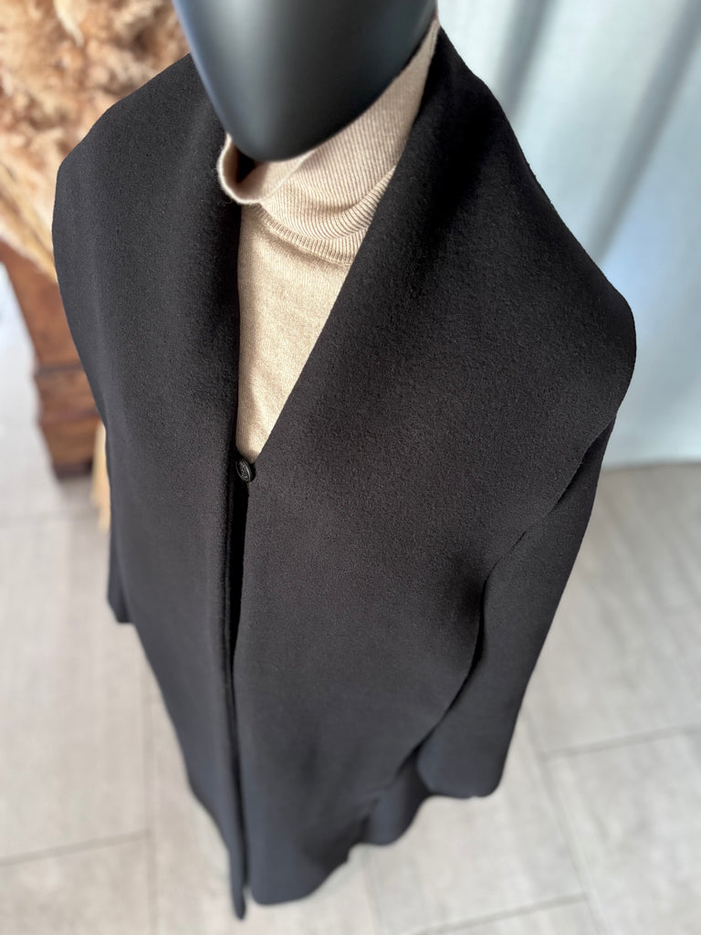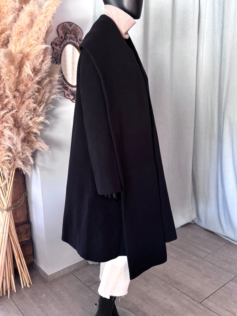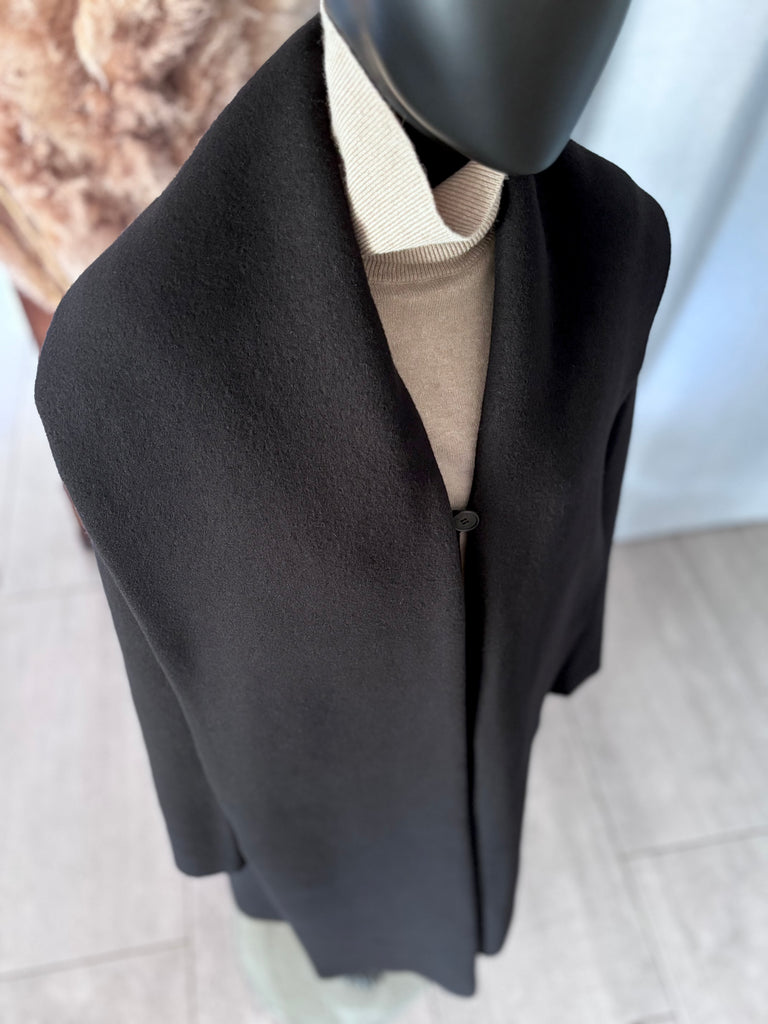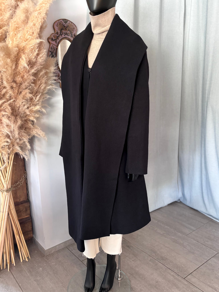 Manteau en laine bouillie épaisse de couleur noire. Coupe légèrement évasée, col structuré par une longue et large écharpe d’un côté et un large revers de l’autre, encolure en V et fermeture par un bouton siglé. 2 grandes poches dans le biais. Non doublé.