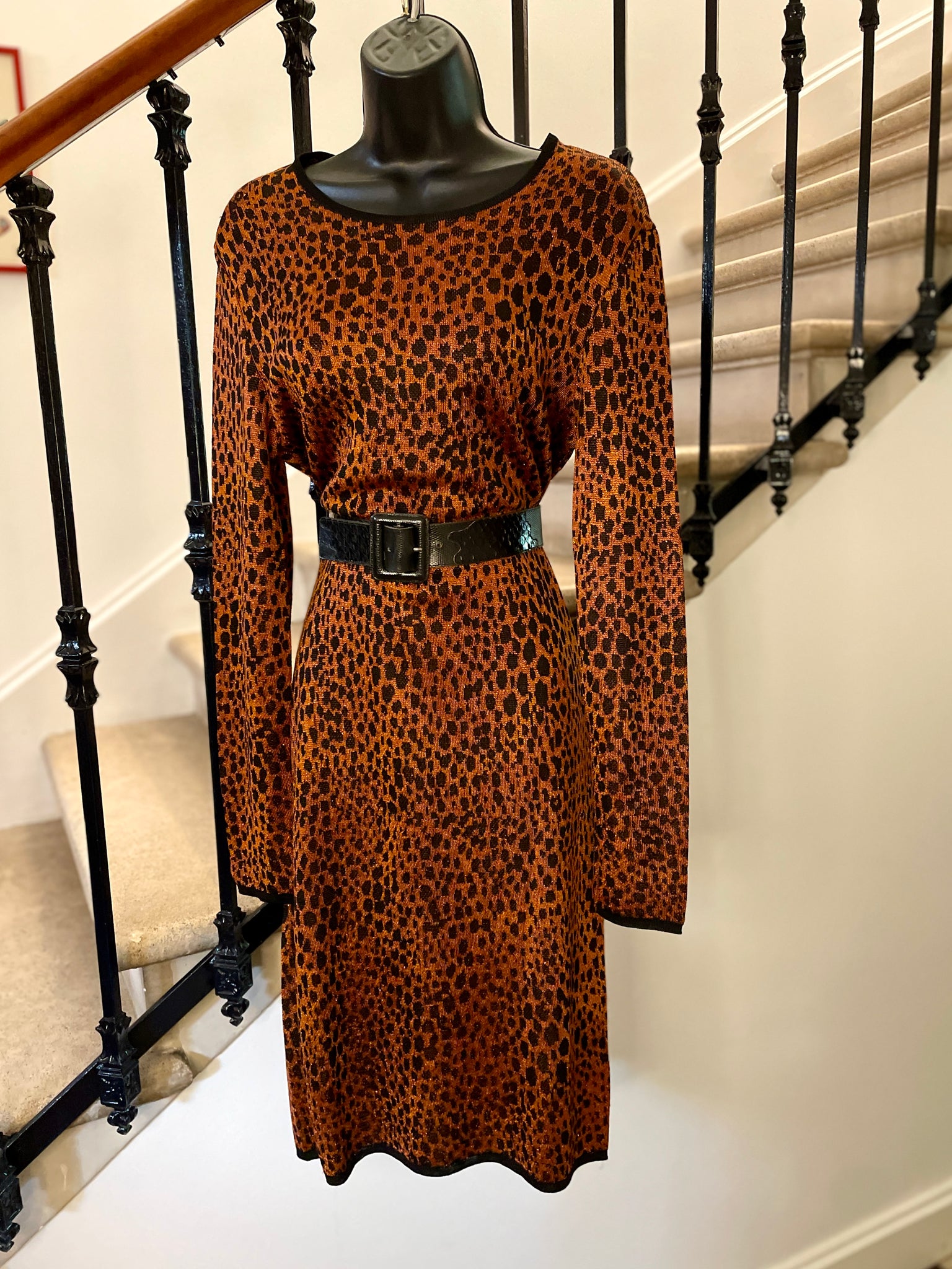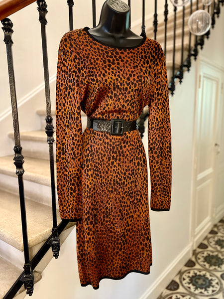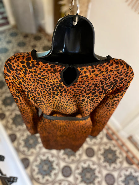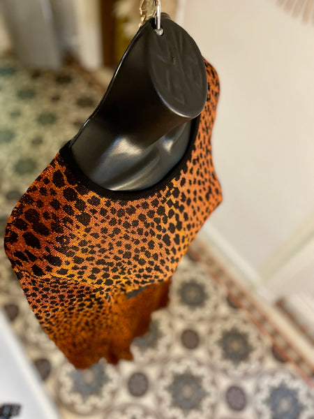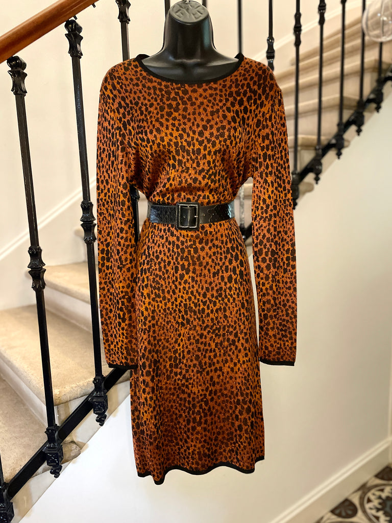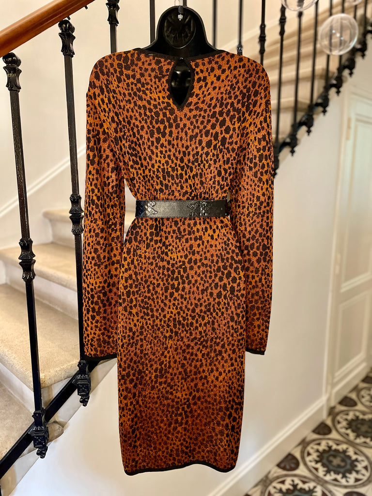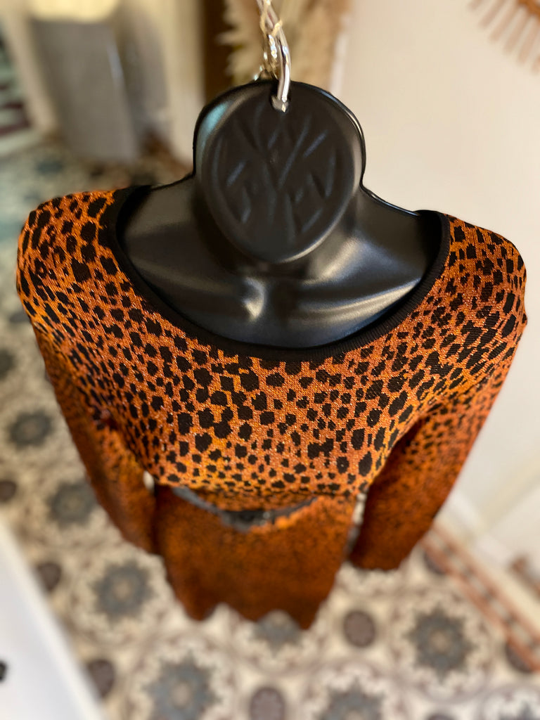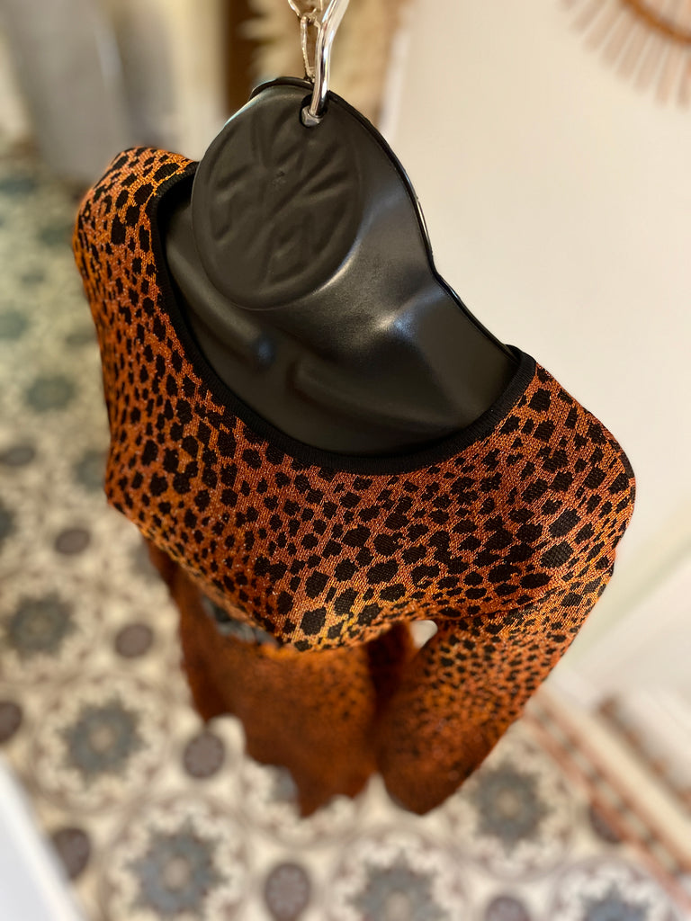 Robe pull à l’imprimé léopard noir sur fond cuivre irisé. Encolure ronde légèrement dégagée, fermeture dans le dos par petit bouton noir avec petite fente.