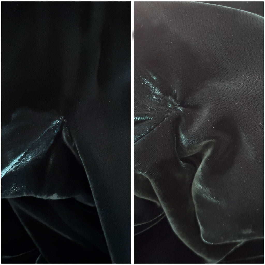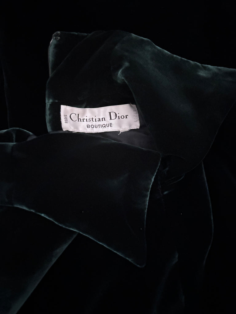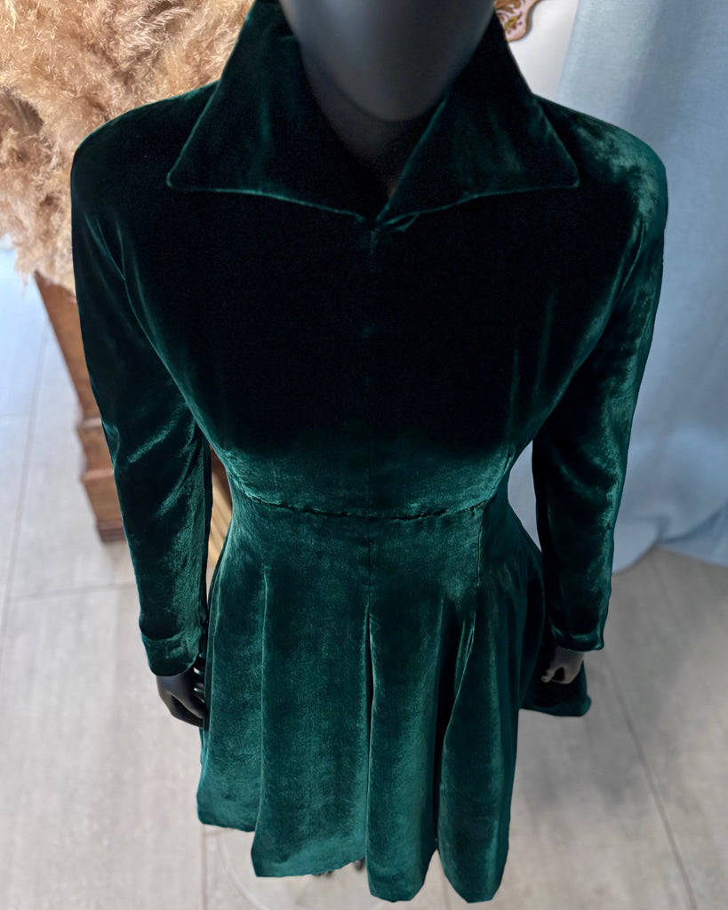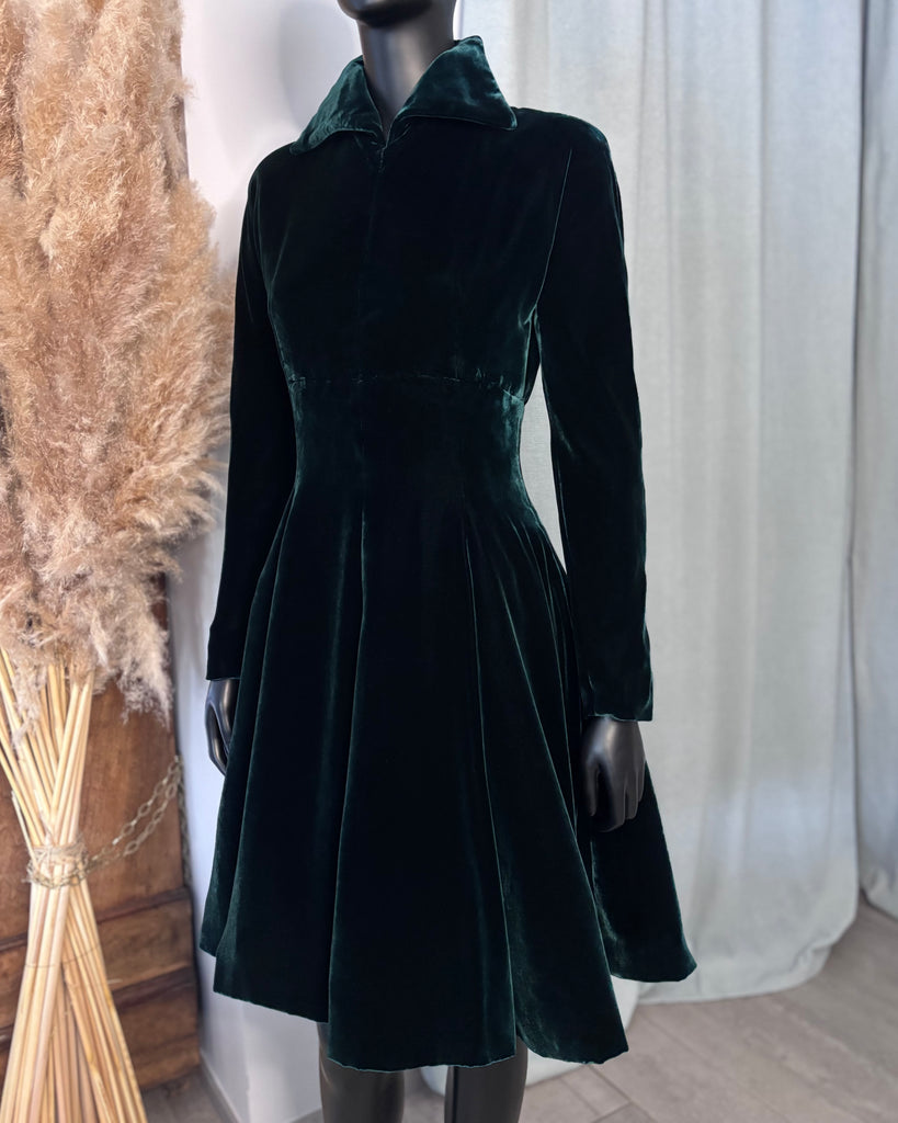 Robe en velours ras épais de couleur vert forêt intense. Coupe façon patineuse avec couture sous la poitrine et grand plis creux à partir des hanches, d’inspiration 50’s. belle envergure sur la partie jupe pour un très beau tombé. Grand col façon col cassé, épaules structurées par des épaulettes et manches étroites. Fermeture dans le dos par zip masqué. Entièrement doublée avec un fond de jupe en plus, le tout monogrammé.
