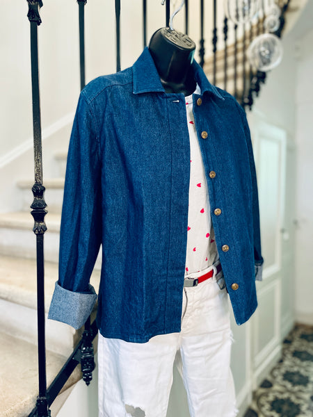Surchemise ou chemise en jeans brut. Coupe droite. Petit col cassé et Fermeture par simple boutonnage masqué avec boutons siglés.