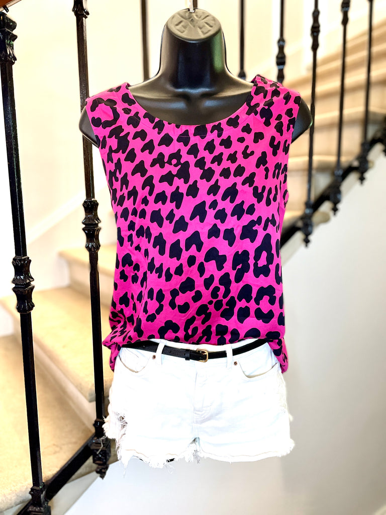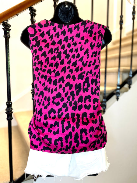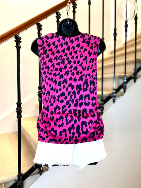 Top sans manches en coton de couleur fuchsia et à l’imprimé léopard. Encolure ronde et coupe droite.