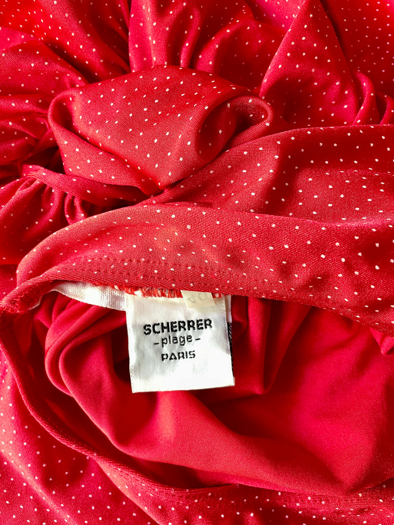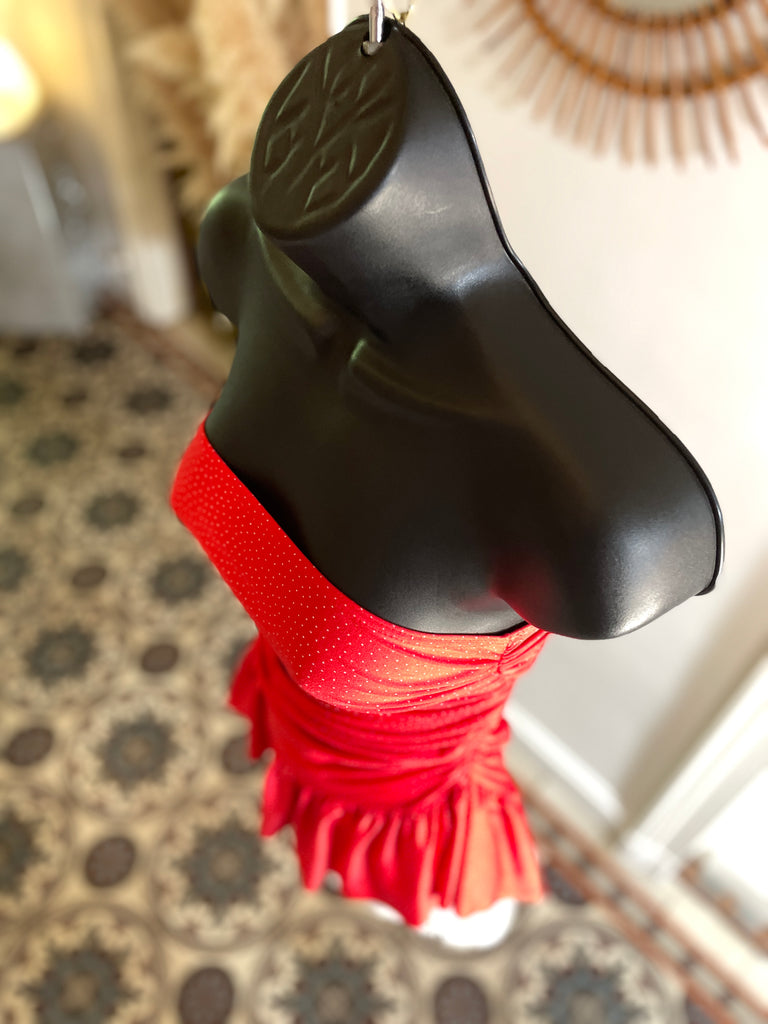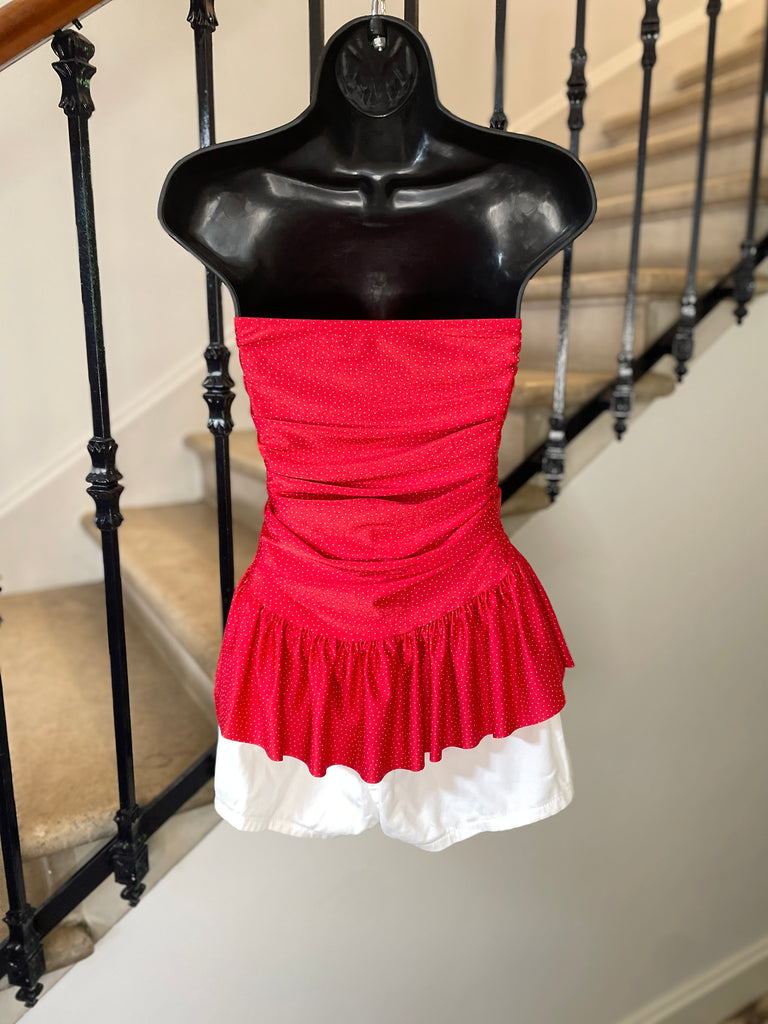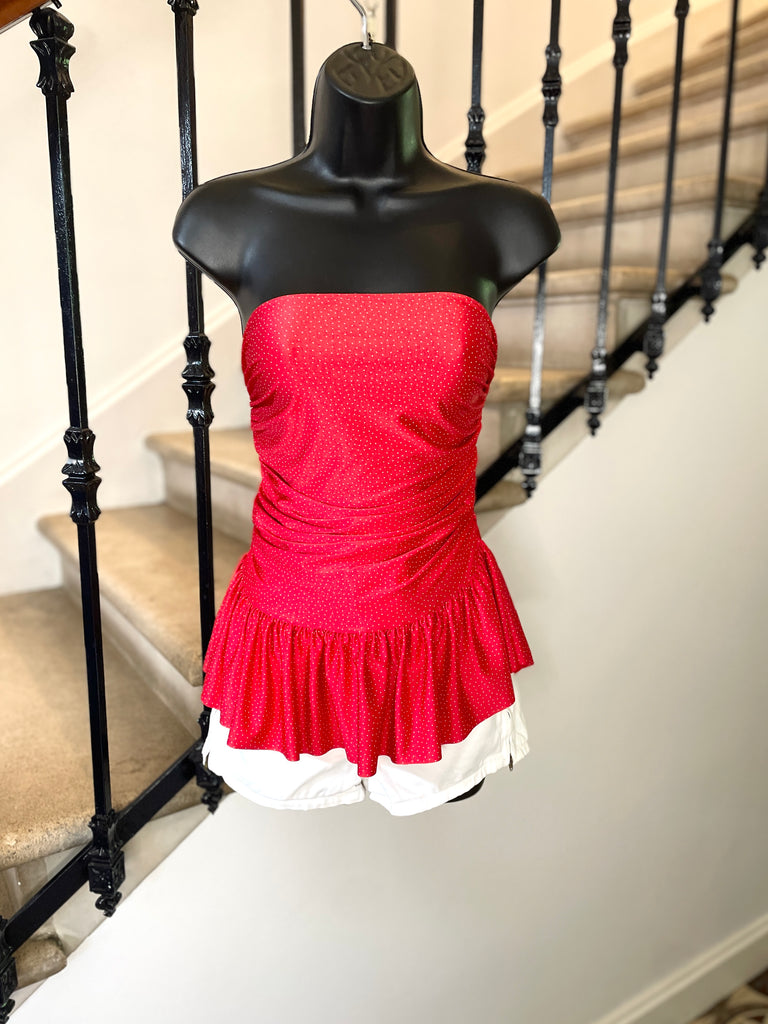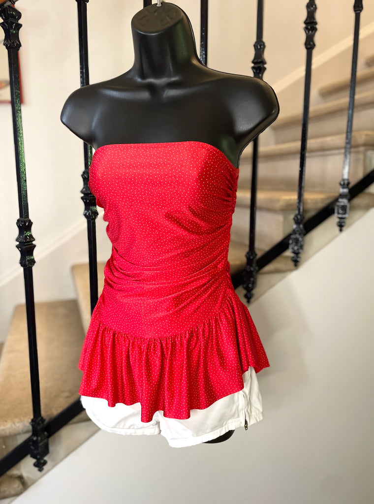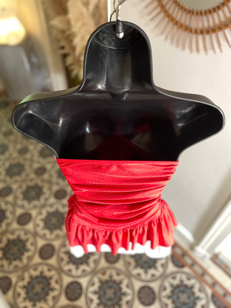 Top bustier en matières synthétique façon lycra à l’imprimé petits pois blanc sur fond rouge. Décolleté droit, jeu de fronces sur les côtés avec jeu de pliet volant légèrement asymétrique sur les hanches.