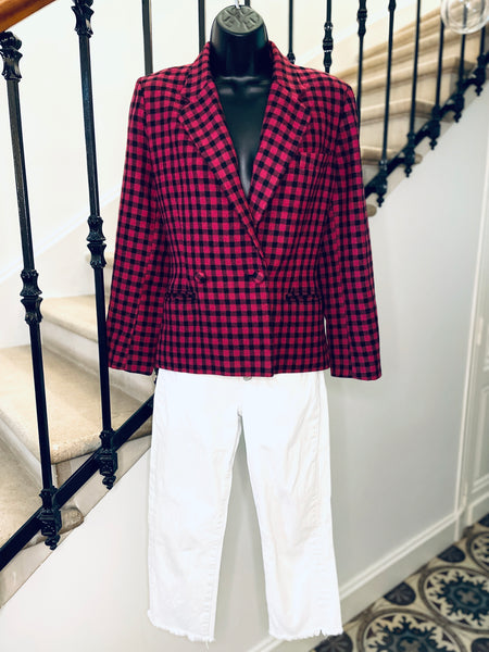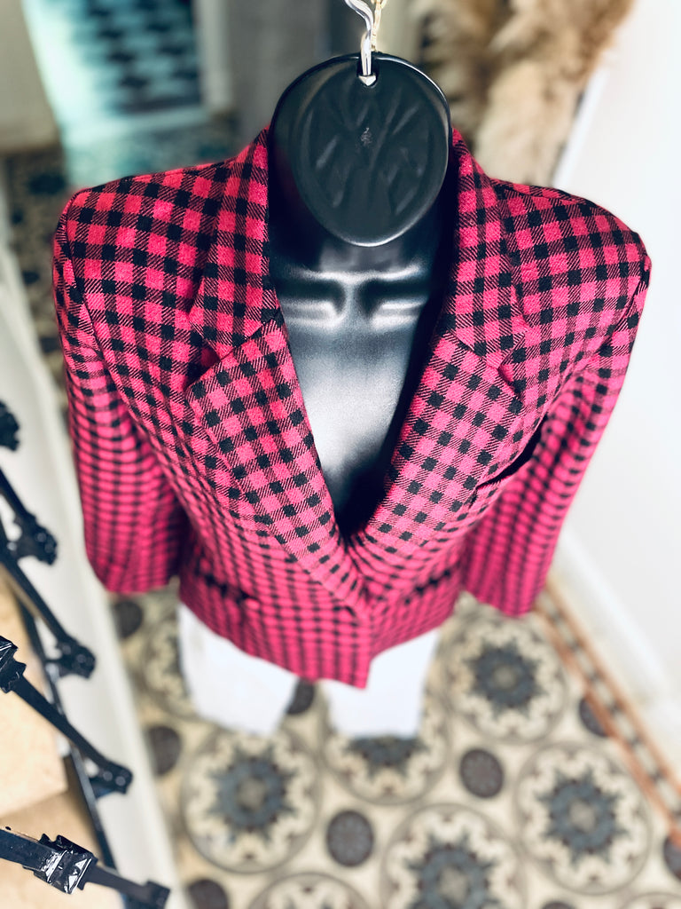 Blazer en laine à l’imprimé Vichy de couleur fuchsia et noir. Fermeture double boutonnage avec boutons recouverts. Coupe très légèrement cintrée. Poignets avec 3 petits boutons décoratifs. 2!0oches latérales passepoilées.