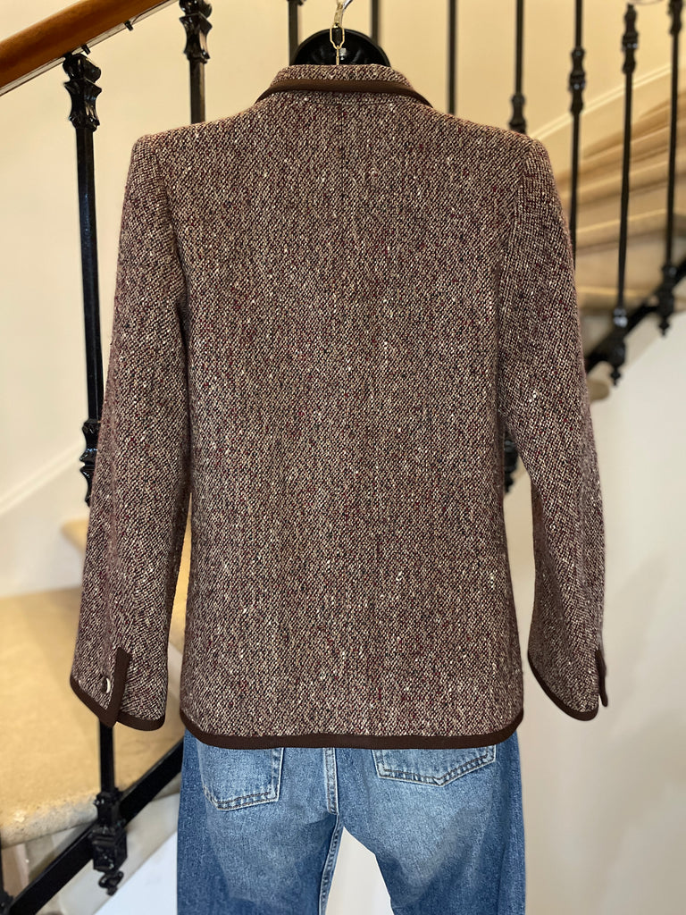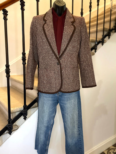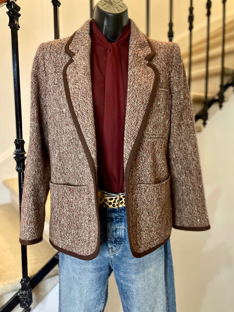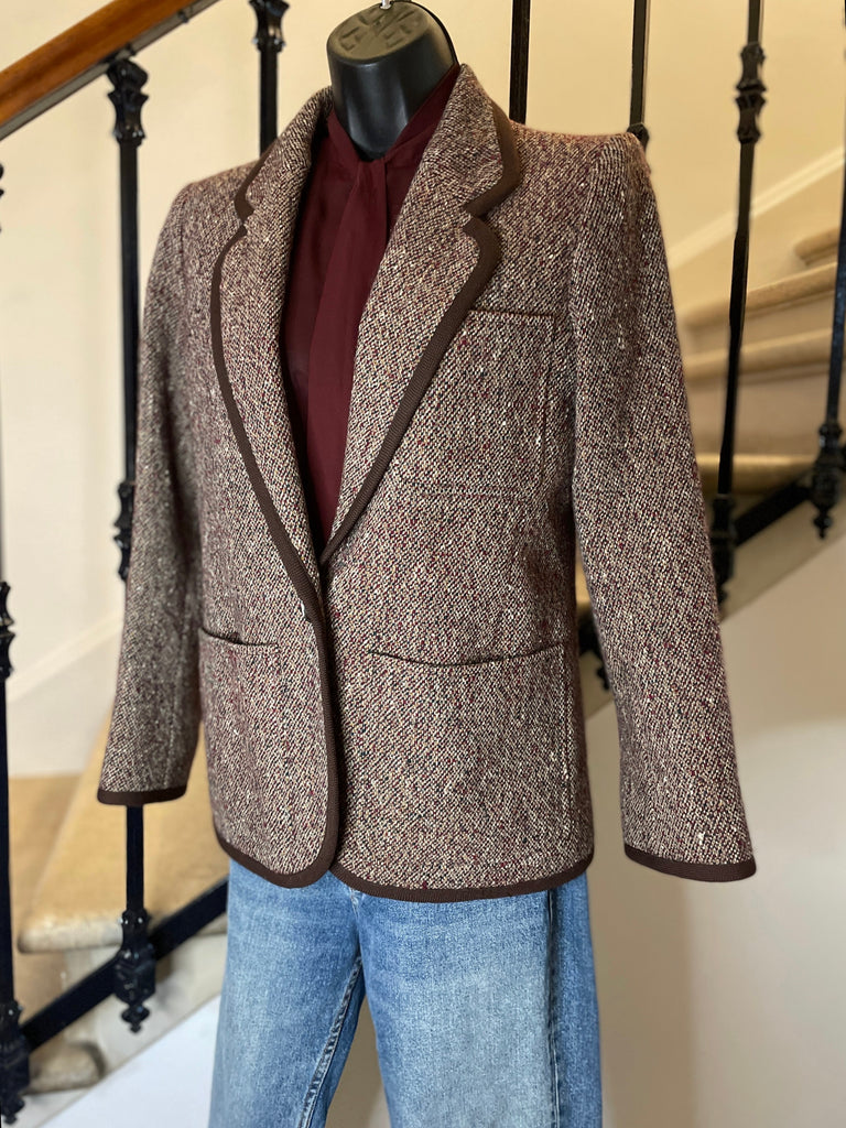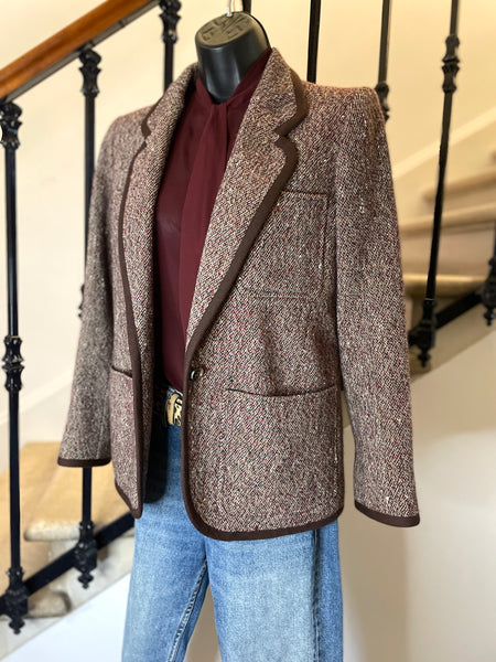 Veste en laine chinée dans des couleurs bordeaux, vert, moutarde et blanc et gansée d’un galon en laine de couleur marron tirant sur le bordeaux. Coupe droite, col plat, revers avec arrondi, légères épaulettes et fermeture un bouton façon écaille. 1 poche plaquée sur la poitrine et 2 poches plaquées latérales. Poignets avec 1 bouton décoratif.
