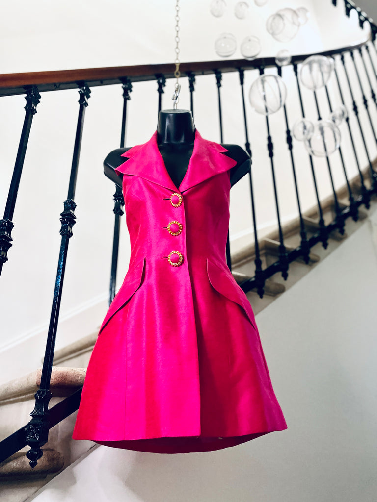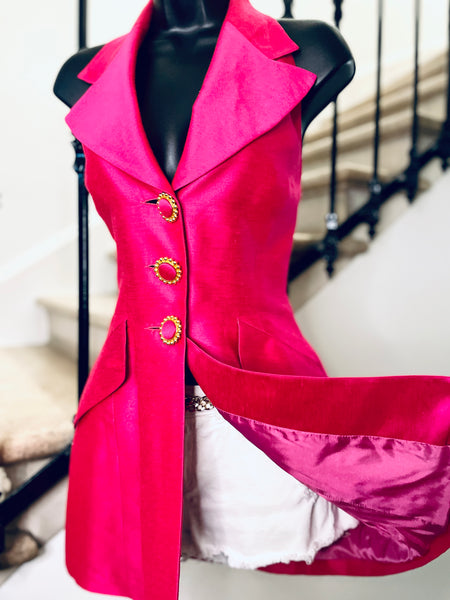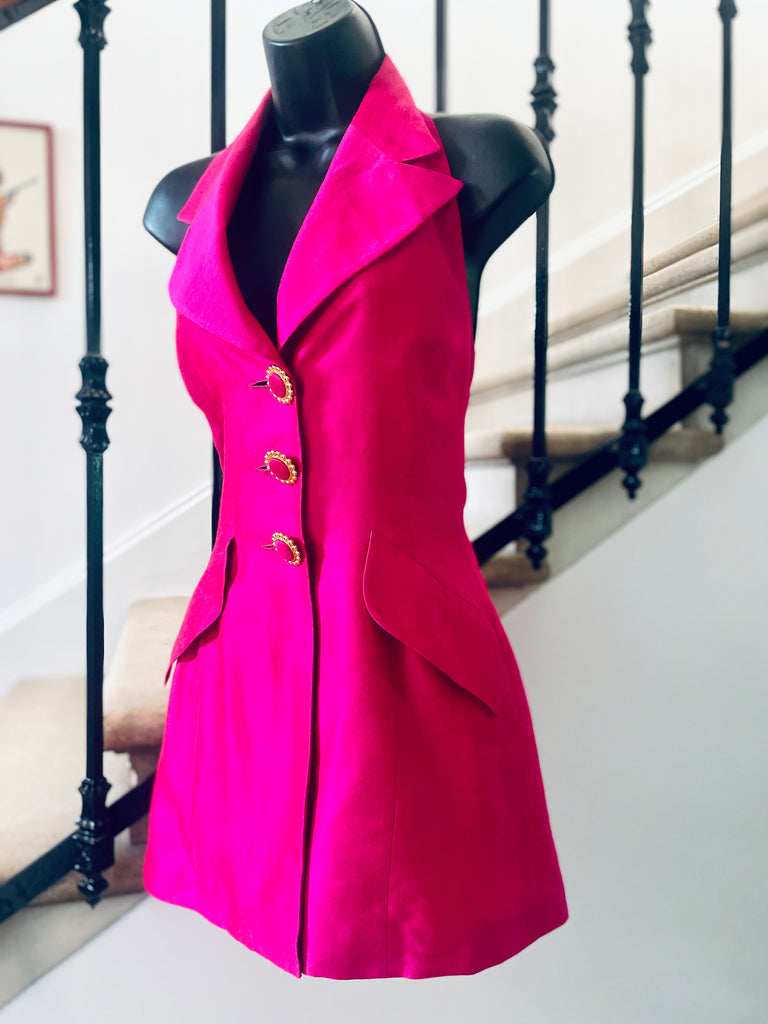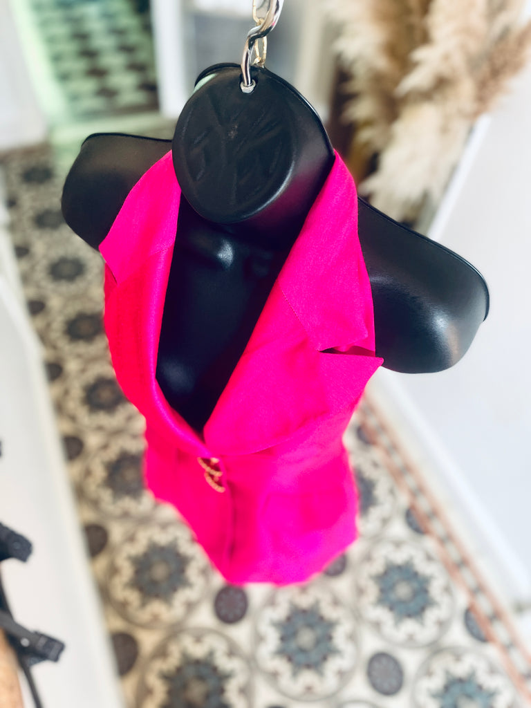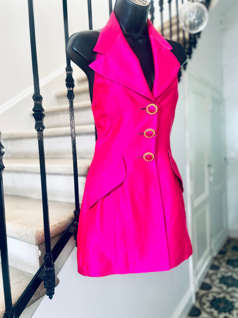 Veste en acrylique et soie mélangés de couleur fuchsia. Coupe cintrée et longue avec un sublime dos nu. Col avec un large revers et un décolleté profond. Fermée par 3 boutons bijoux recouverts et dorés. 2 poches avec rabat.