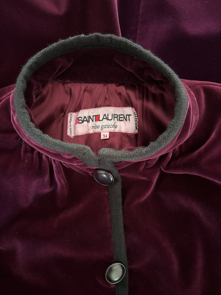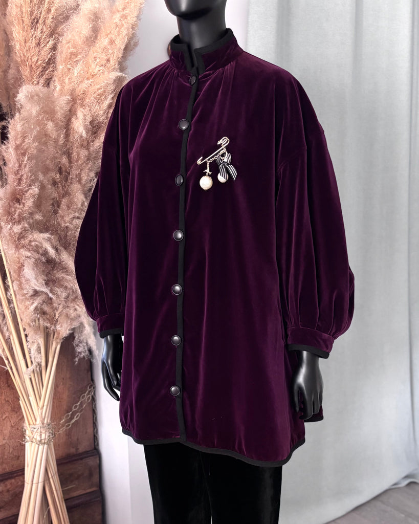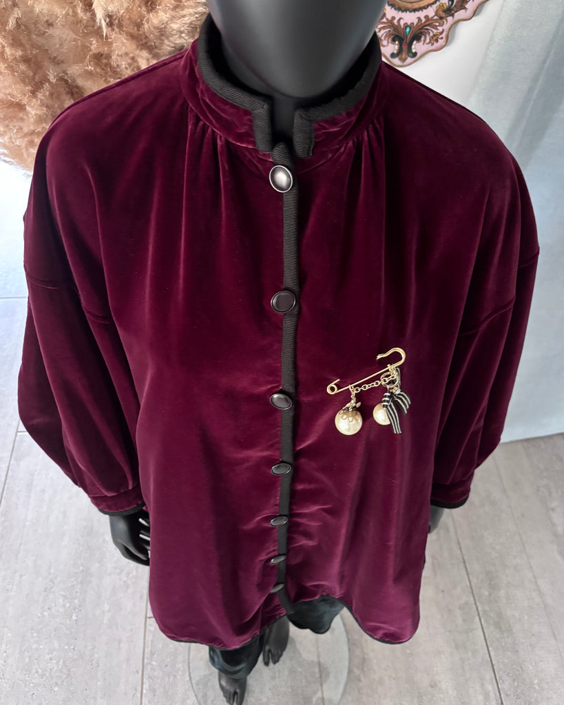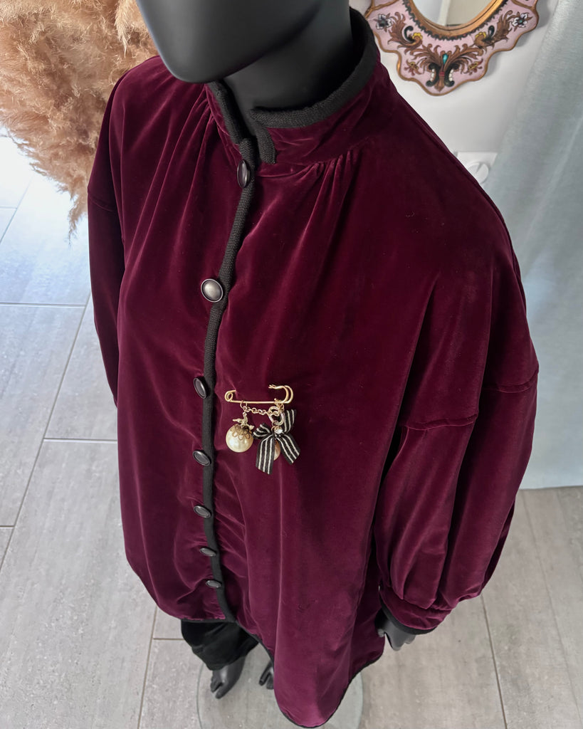 Veste longue ou manteau de soirée en velours ras de couleur bordeaux profond gansée d’un galon en laine noire et décorée d’une broche fantaisie. Coupe oversize légèrement évasée, épaules basses, manches bouffantes avec poignets resserrés, petit col montant et jeu de plis dans le dos. Fermeture par boutons noirs, 2 poches passepoilées. Doublée.