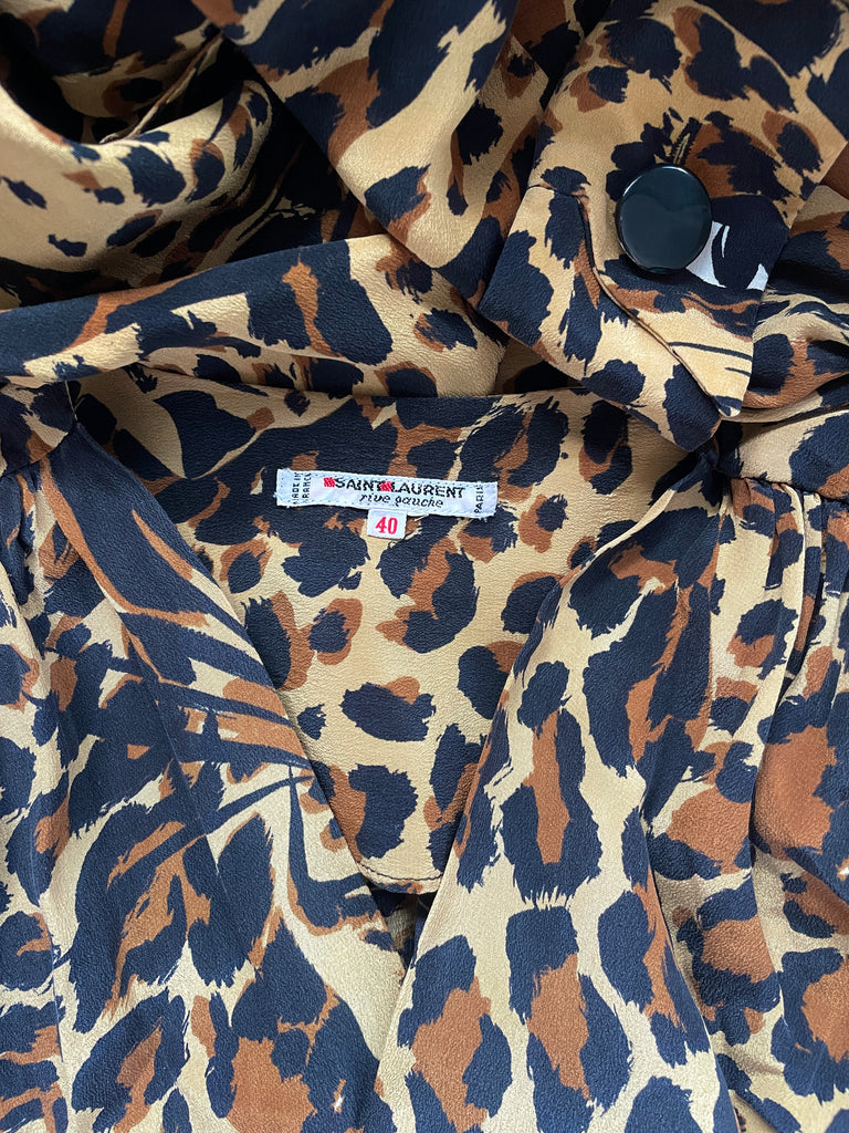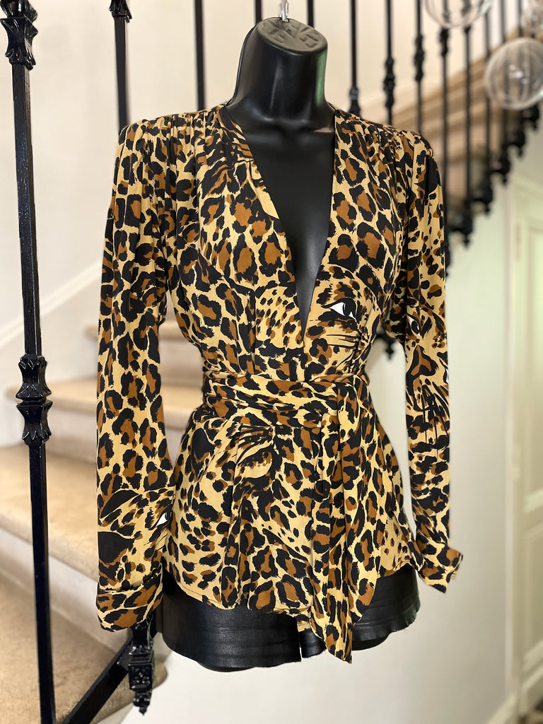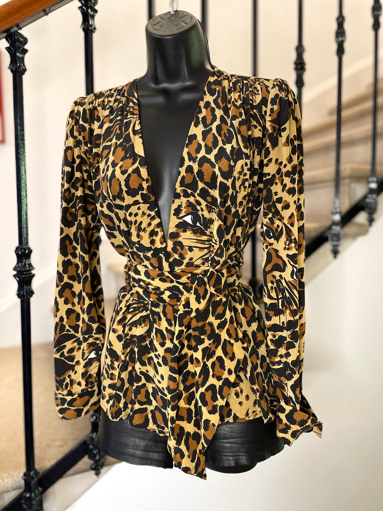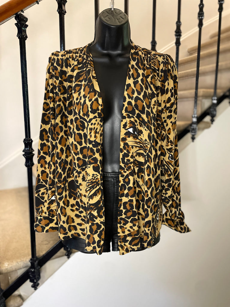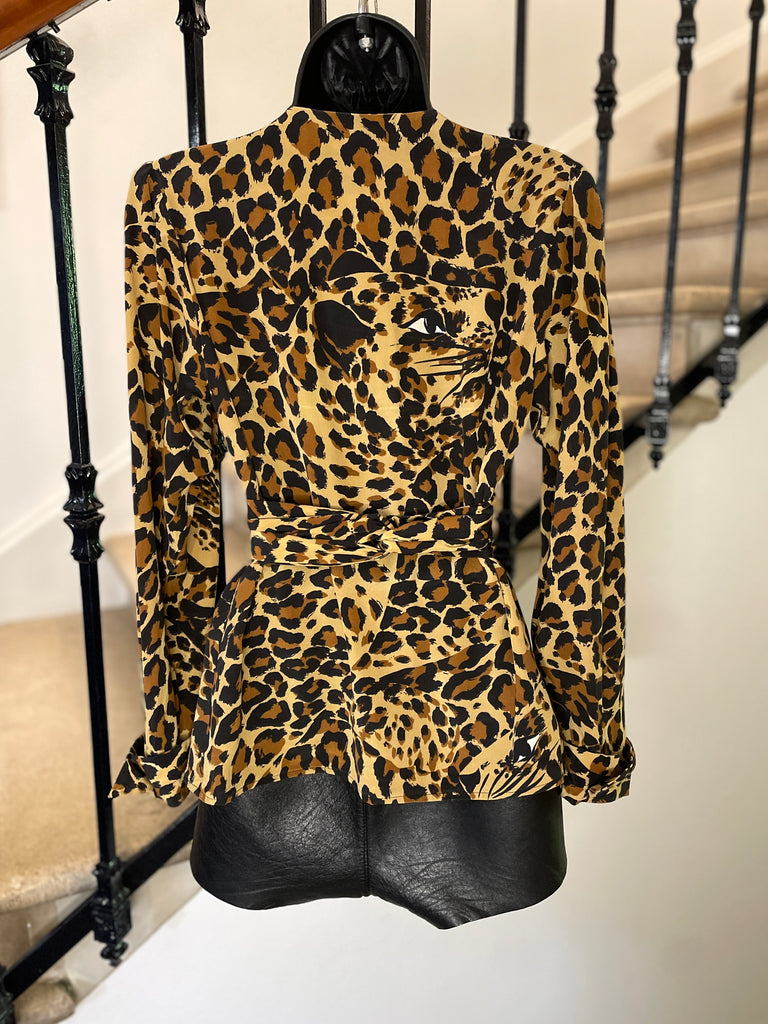 Blouse en soie Ă lâimprimĂ© lĂ©opard emblĂ©matique de la collection hiver 86-87. Coupe cache-coeur avec large et longue ceinture amovible. Poignets avec revers fixes fermĂ©s par un bouton en nacre.Â