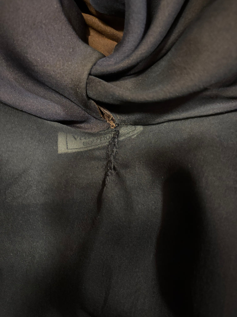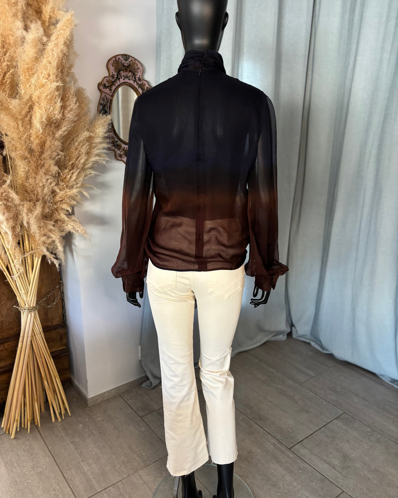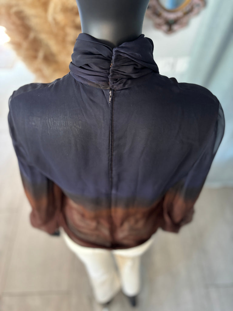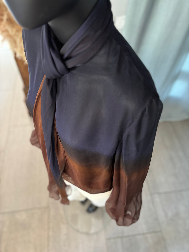 Blouse en voile de soie dans un dégradé de bleu marine, de noir et de marron. Coupe droite, col avec longue et large cravate et fermeture dans le dos pas zip masqué et petits crochets. Manches bouffantes et poignets fermés par 2 boutons. Double épaisseurs de soie sur le buste.