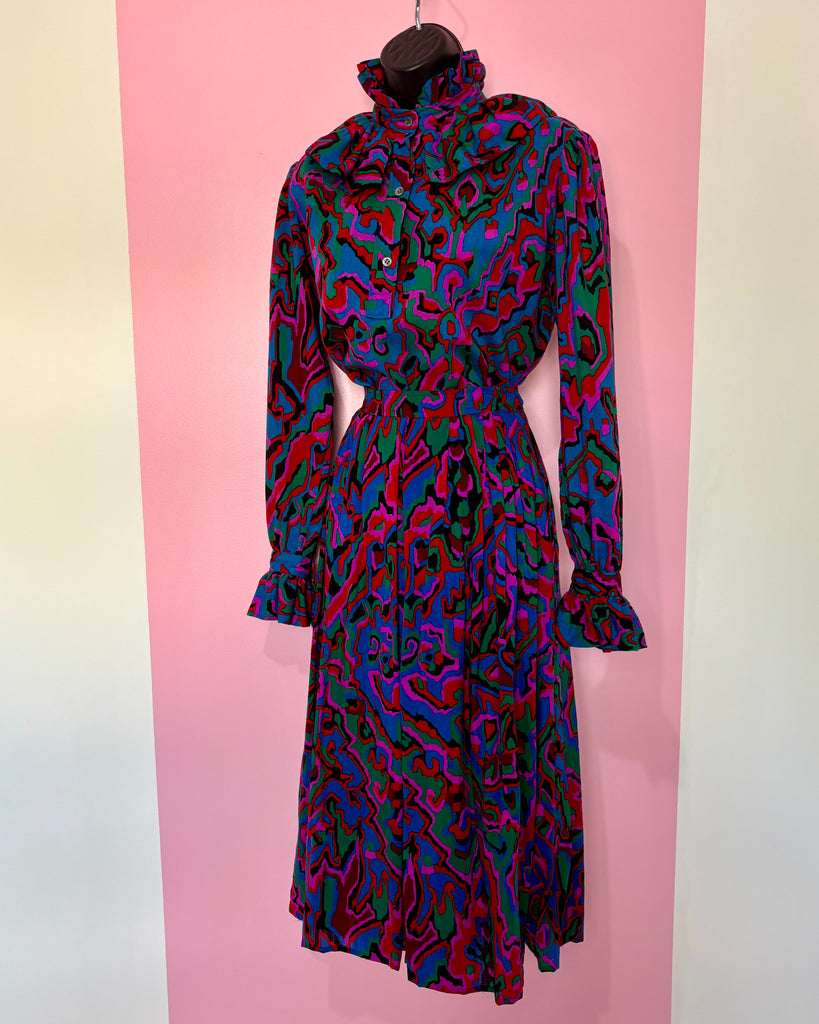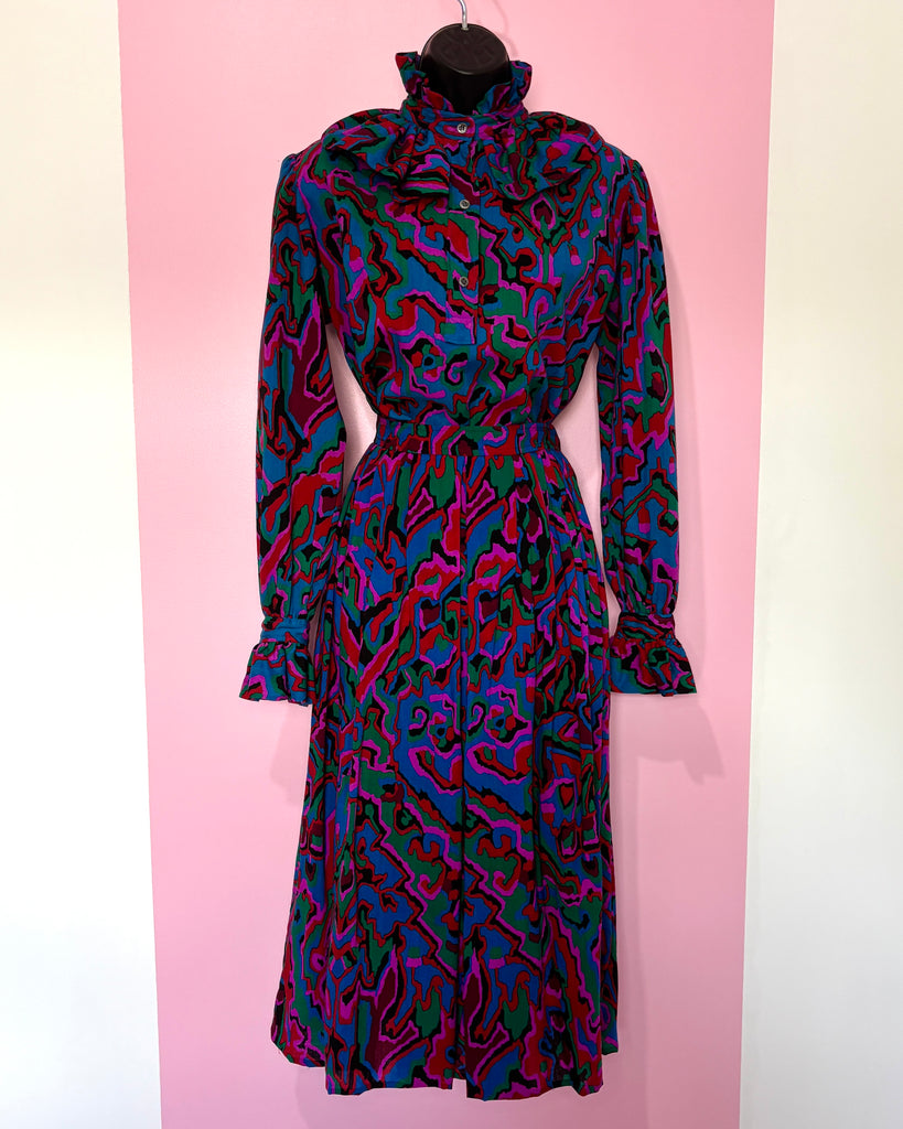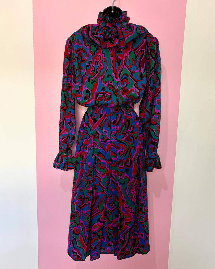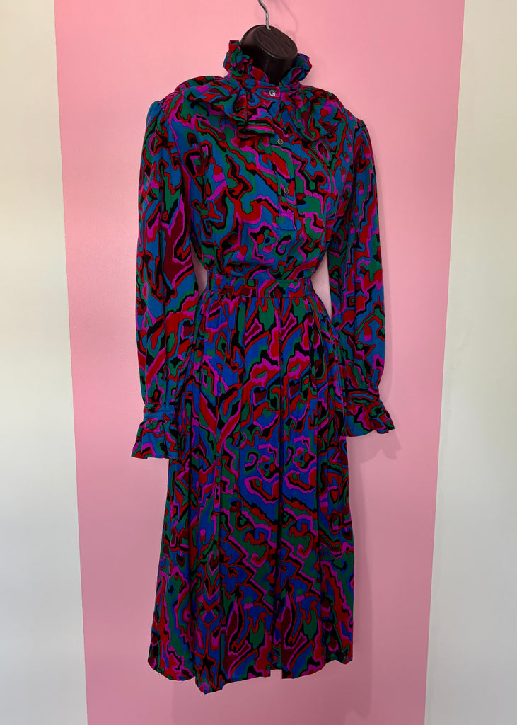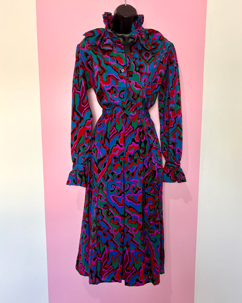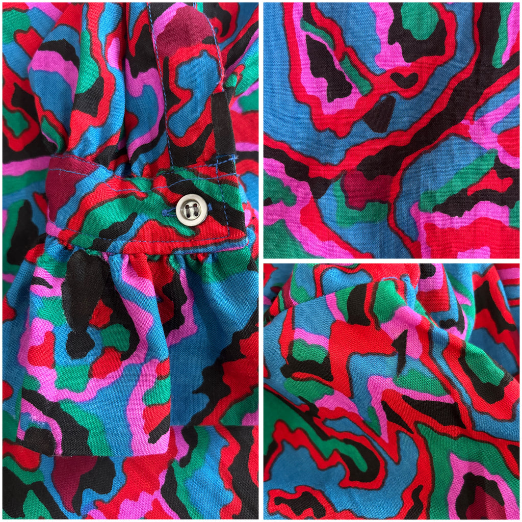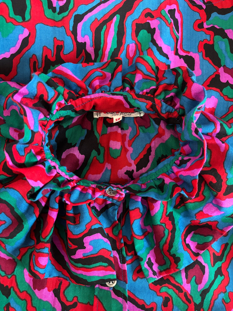 BLouise en étamine de laine à l’imprimé graphique dans des couleur rose, rouge, bordeaux, bleu, vert et noir. Col pierrot avec petit volant montant et grand volant retombant. Fermeture par boutons jusque sous la poitrine. Poignets avec volant fermés par 1 bouton.