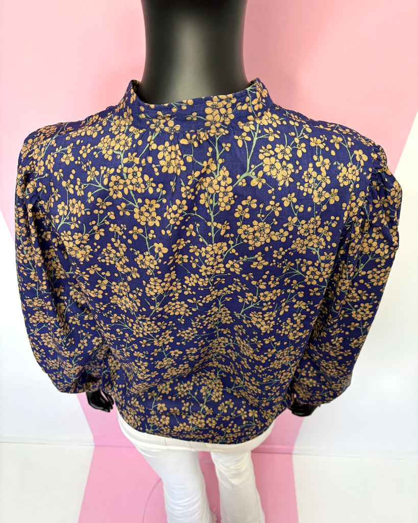 Blouse en étamine de laine à l’imprimé floral beige rosé et vert sur fond bleu violet. Coupe droite, petit col montant avec fermeture par boutons jusqu’à la poitrine. Manches bouffante et poignets fermés par un bouton.