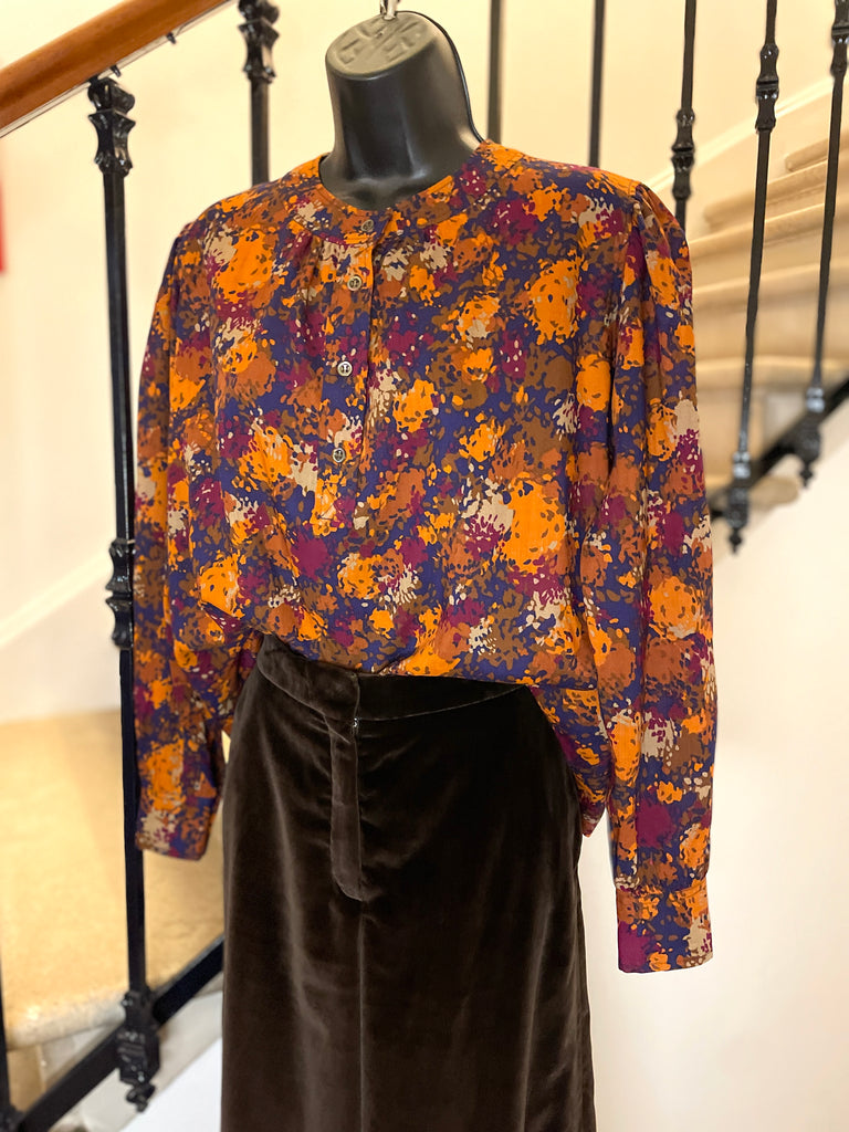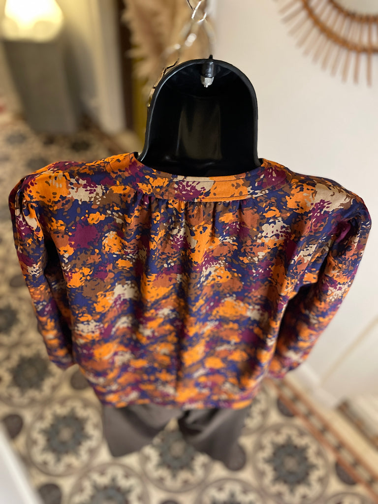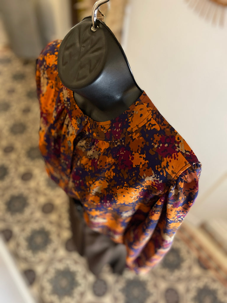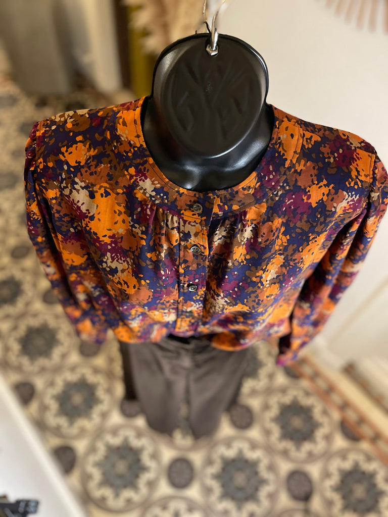 Blouse en étamine de laine à l’imprimé floral impressionniste dans des couleurs violet, orange, prune, camel et beige. coupe légèrement évasée, encolure ronde, fermeture par simple boutonnage jusqu’à la poitrine avec 4 petits boutons. Manches fermées par 1 bouton.