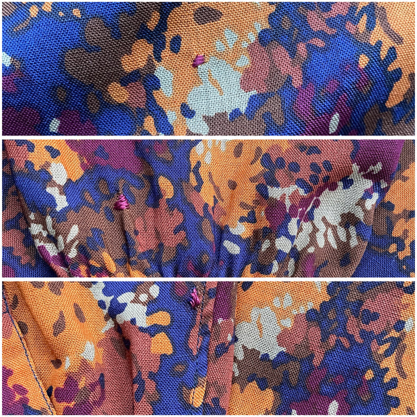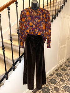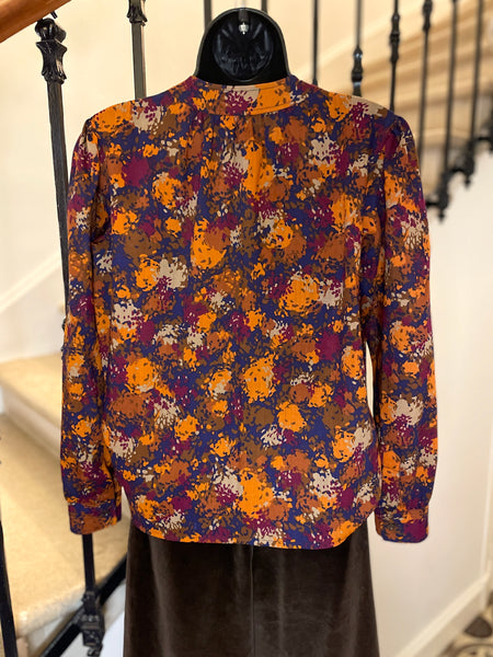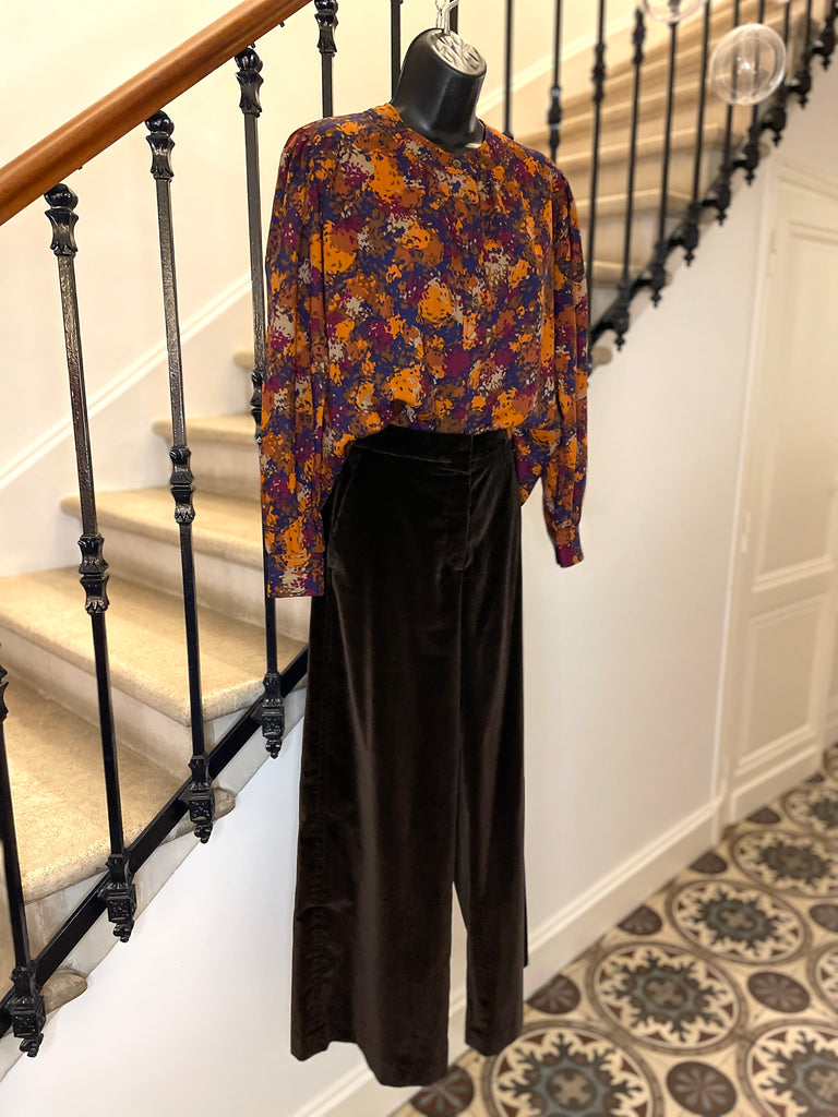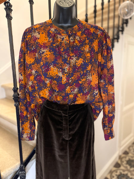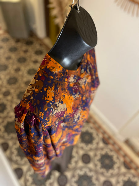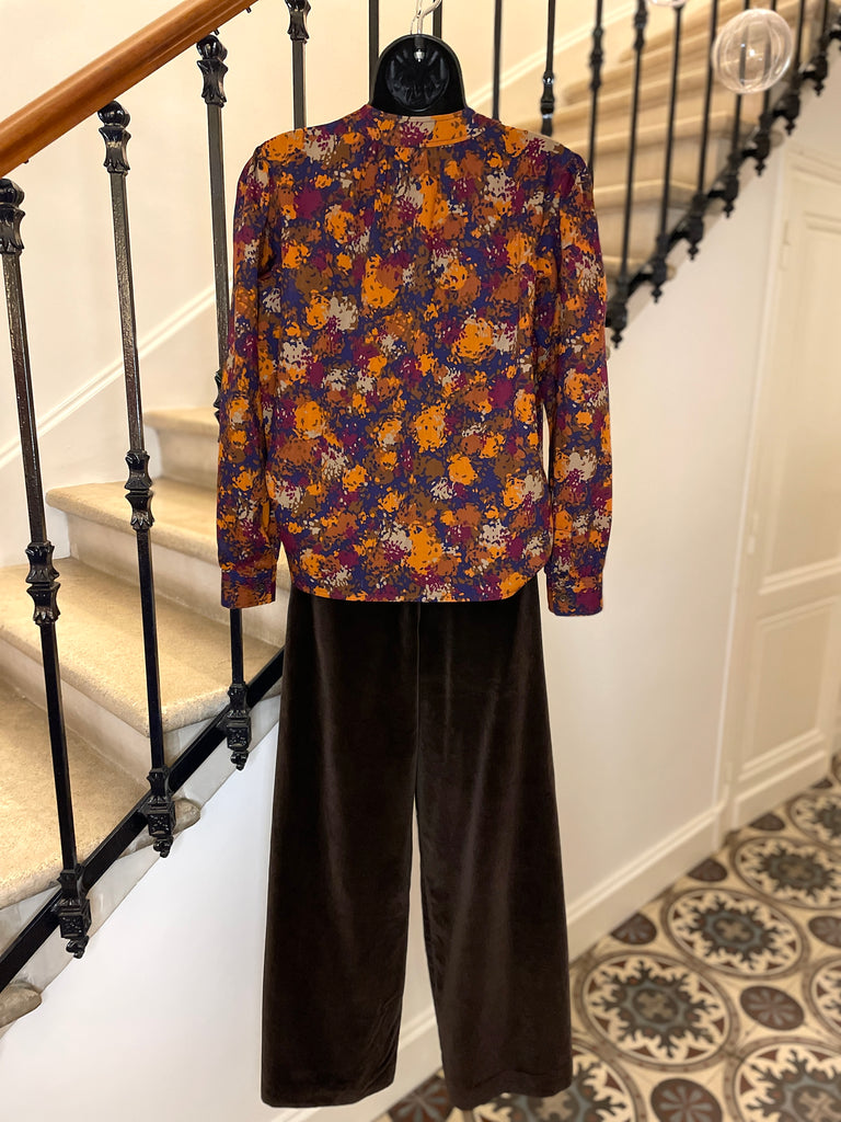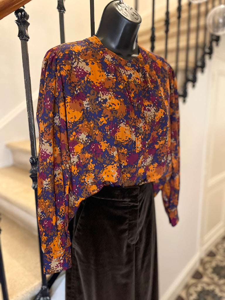 Blouse en étamine de laine à l’imprimé floral impressionniste dans des couleurs violet, orange, prune, camel et beige. coupe légèrement évasée, encolure ronde, fermeture par simple boutonnage jusqu’à la poitrine avec 4 petits boutons. Manches fermées par 1 bouton.