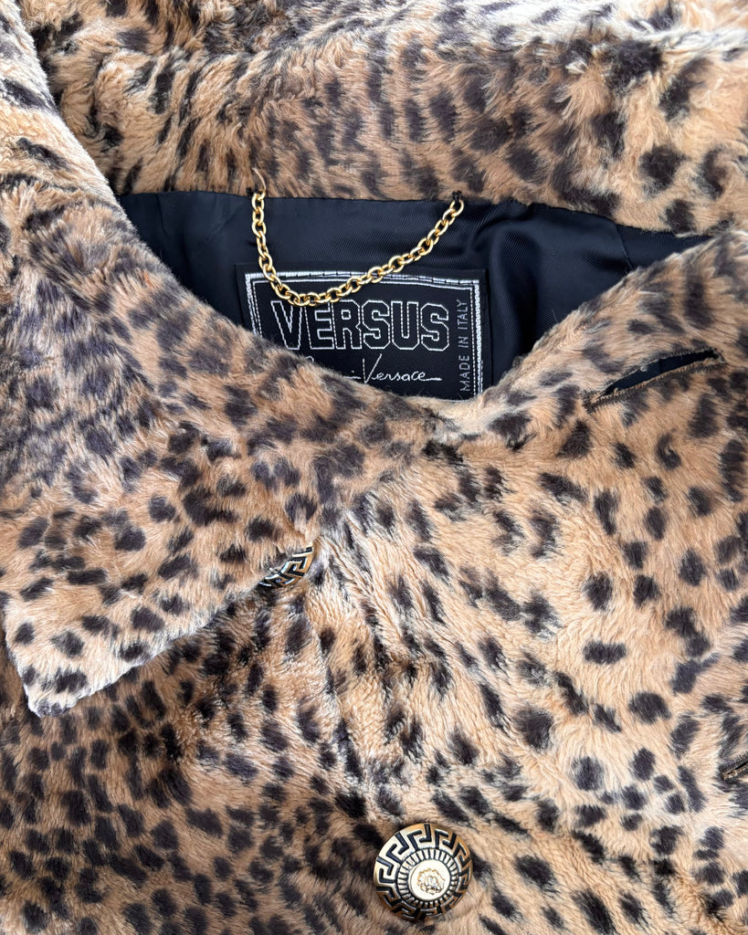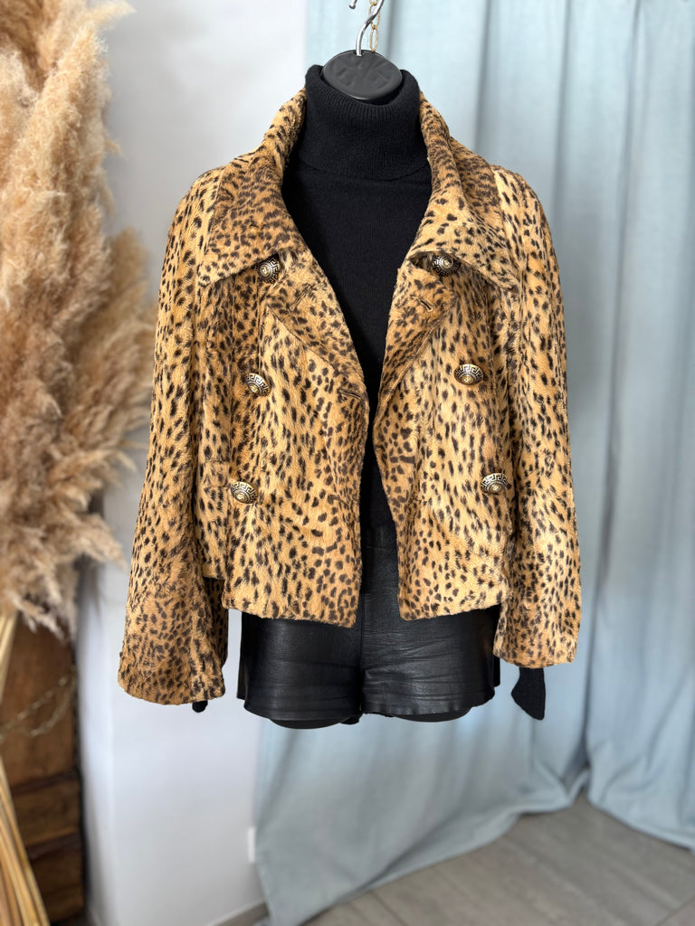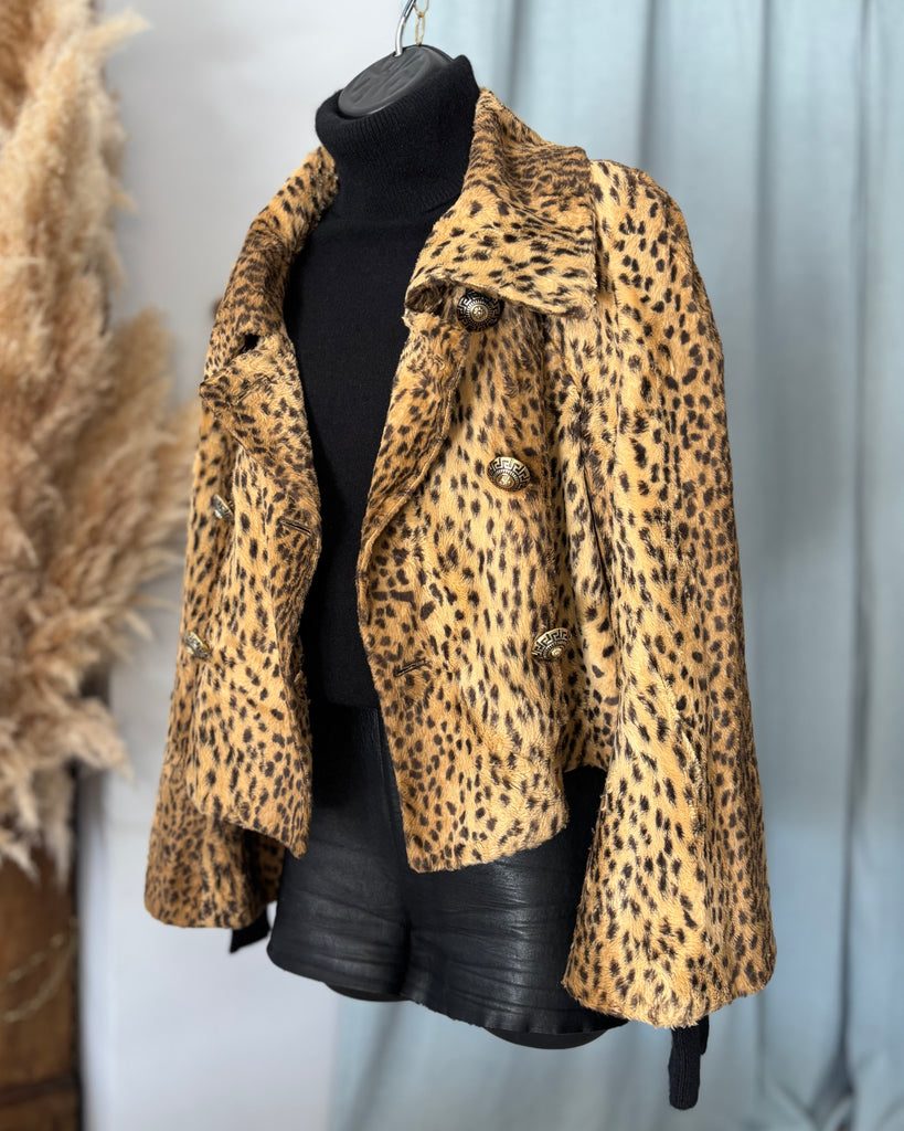 Manteau court et léger à l’imprimé léopard en velours peluche. Coupe très évasée, grand col plat avec encolure dégagée et fermeture croisée avec gros boutons. Manches raglan et cloches et 2 poches factices passepoilées. Doublé