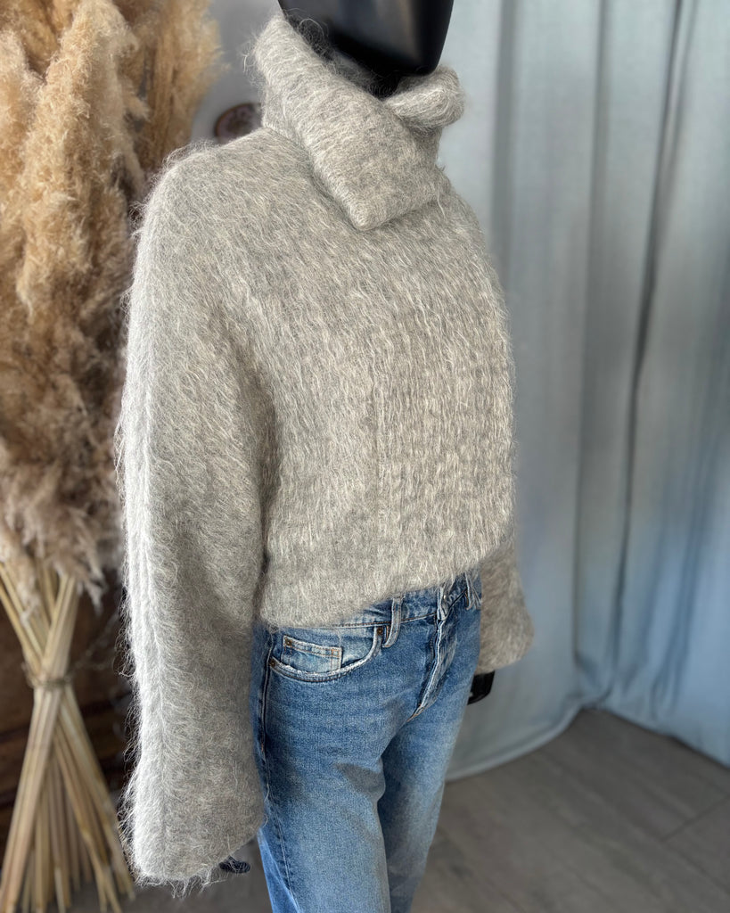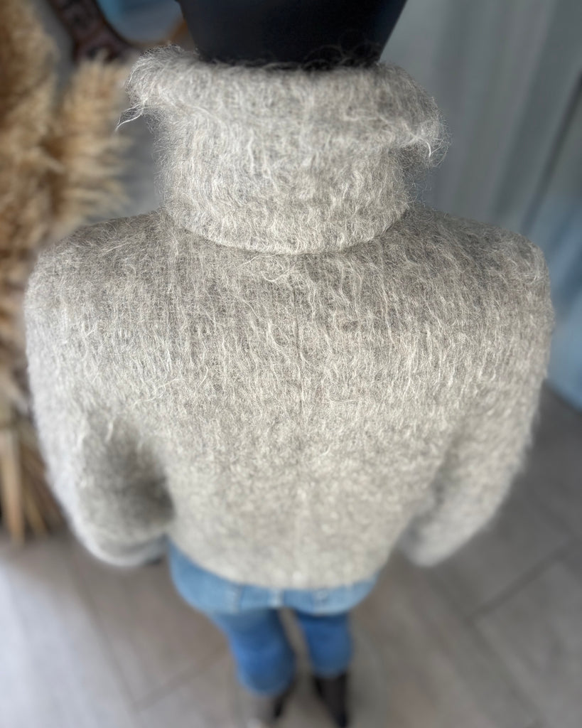 Blouson en laine à poils long de couleur gris silver. Coupe cropped avec manches raglan façon chauve souris. Grand col mou et fermeture croisée par pressions. Doublé.