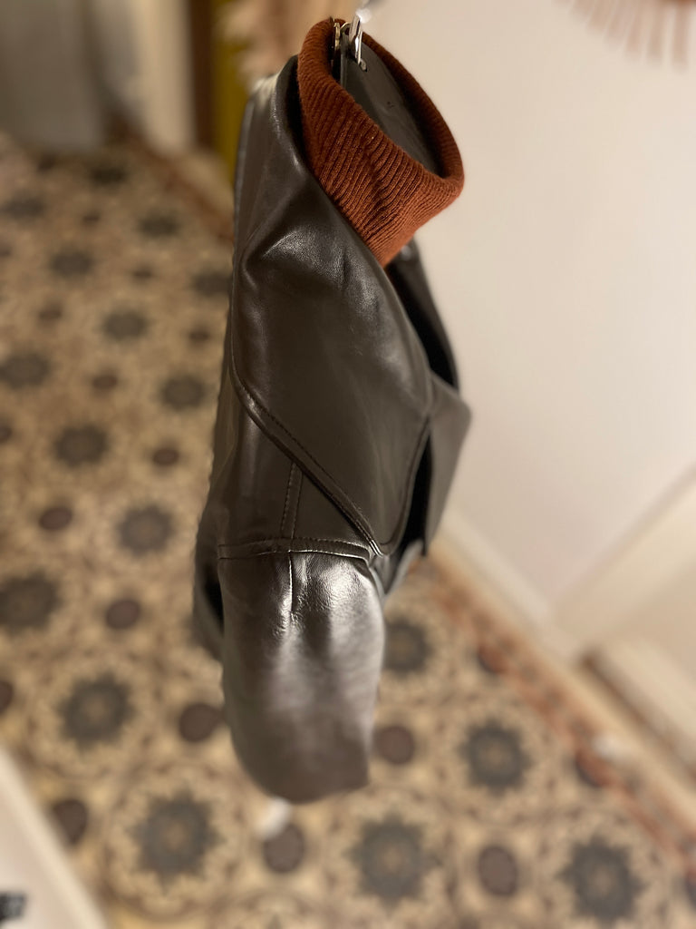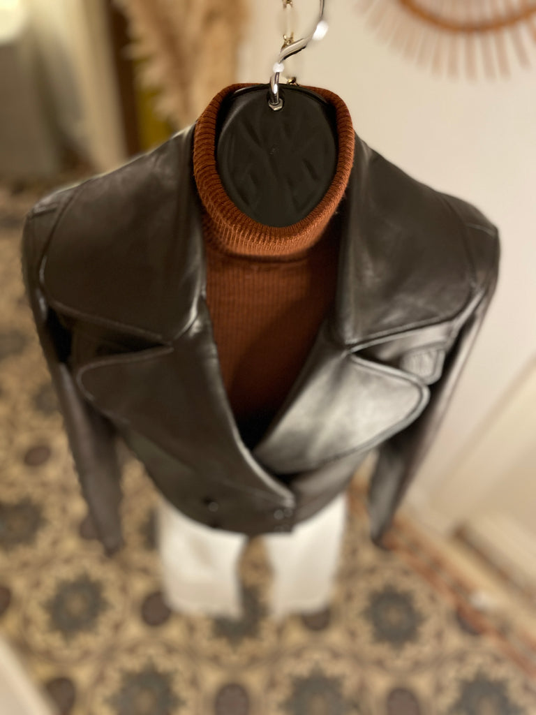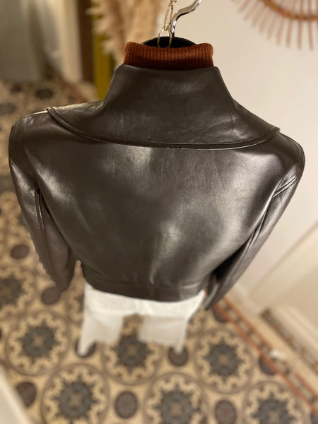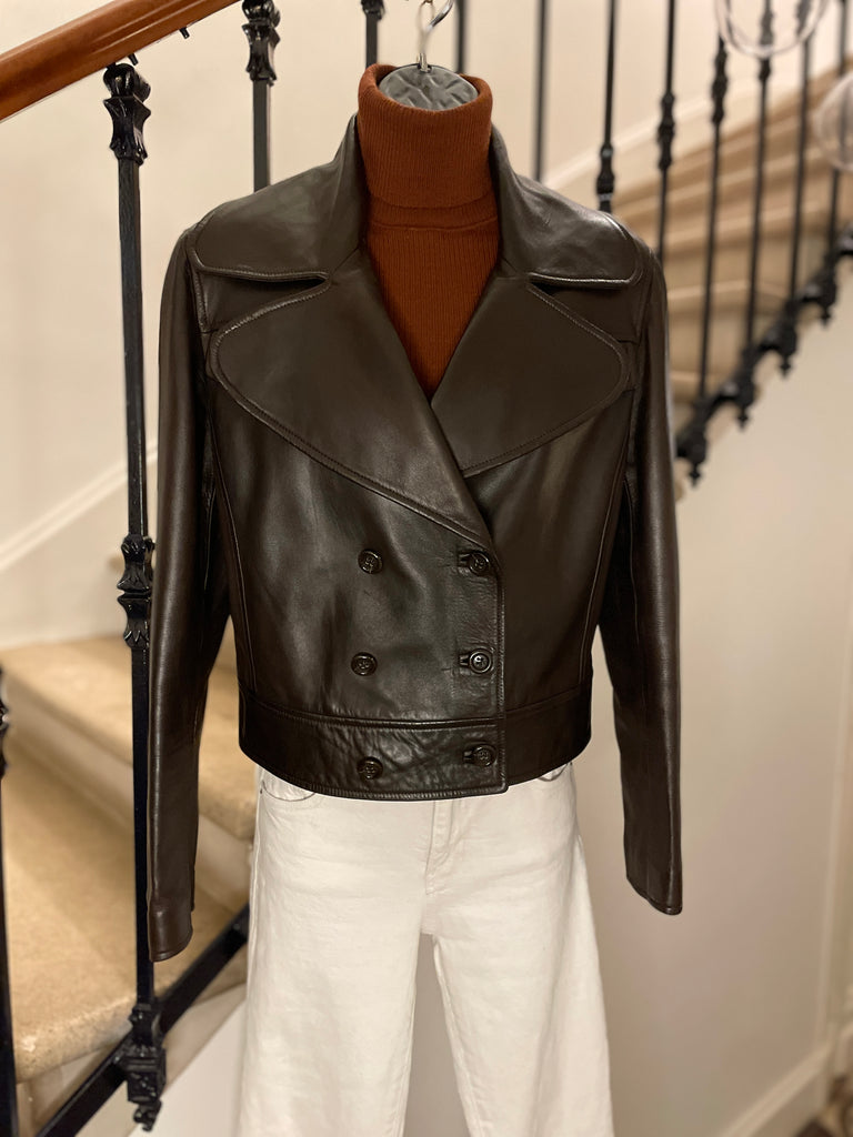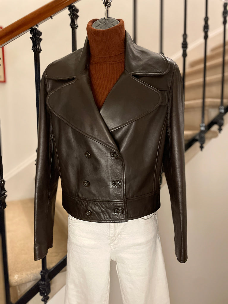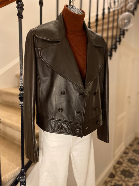 Blouson court en cuir de couleur marron cchaud et intense. Coupe lĂ©gĂšrement resserrĂ©e sur le bas et croisĂ©e par double boutonnage, Ă©paules avec Ă©paulettes discrĂštes et pinces. Grand col et larges revers avec dĂ©coupe en arrondi, 2 pochettes factices avec rabat et manches droites. DoublĂ©Â