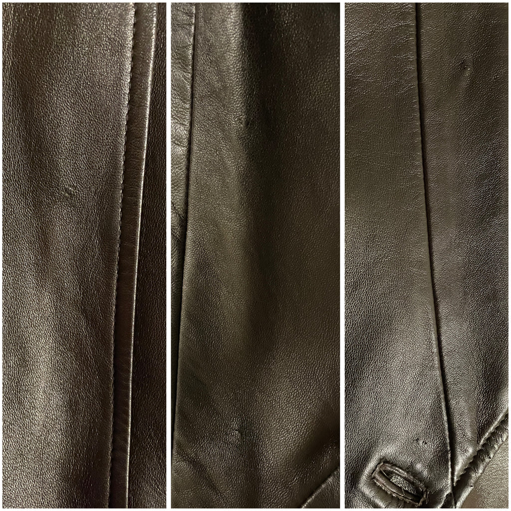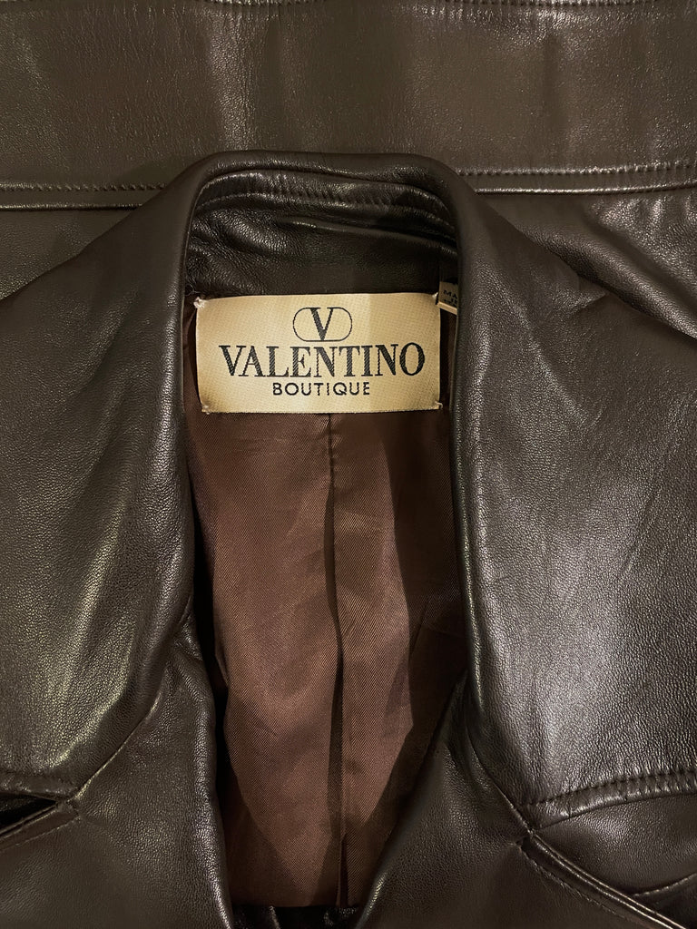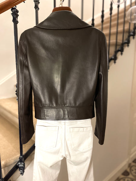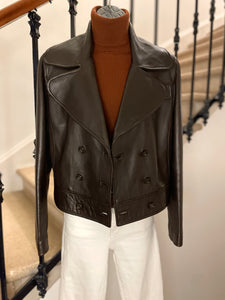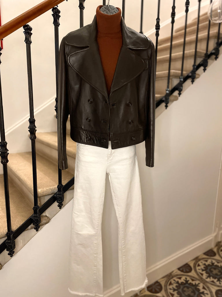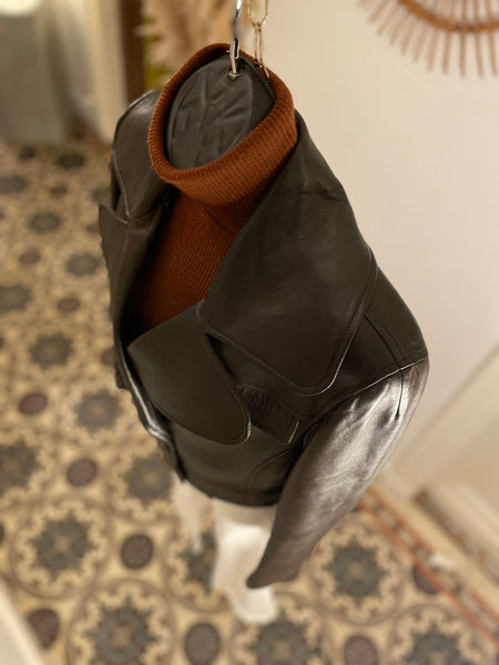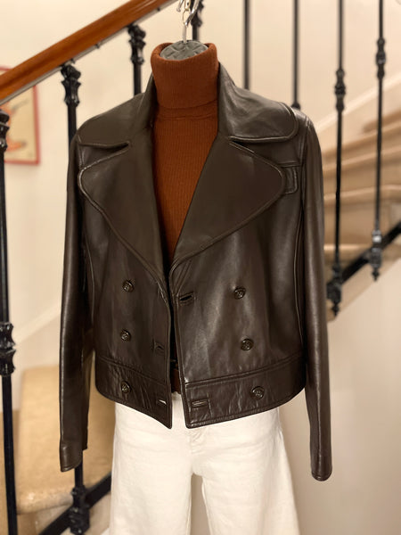 Blouson court en cuir de couleur marron cchaud et intense. Coupe lĂ©gĂšrement resserrĂ©e sur le bas et croisĂ©e par double boutonnage, Ă©paules avec Ă©paulettes discrĂštes et pinces. Grand col et larges revers avec dĂ©coupe en arrondi, 2 pochettes factices avec rabat et manches droites. DoublĂ©Â