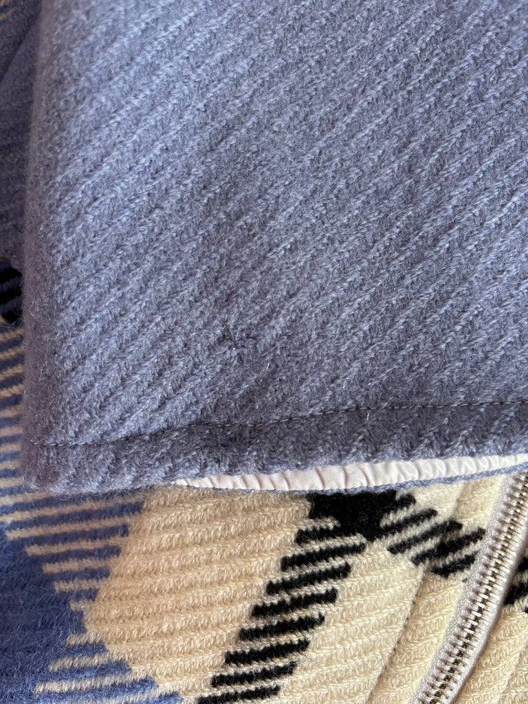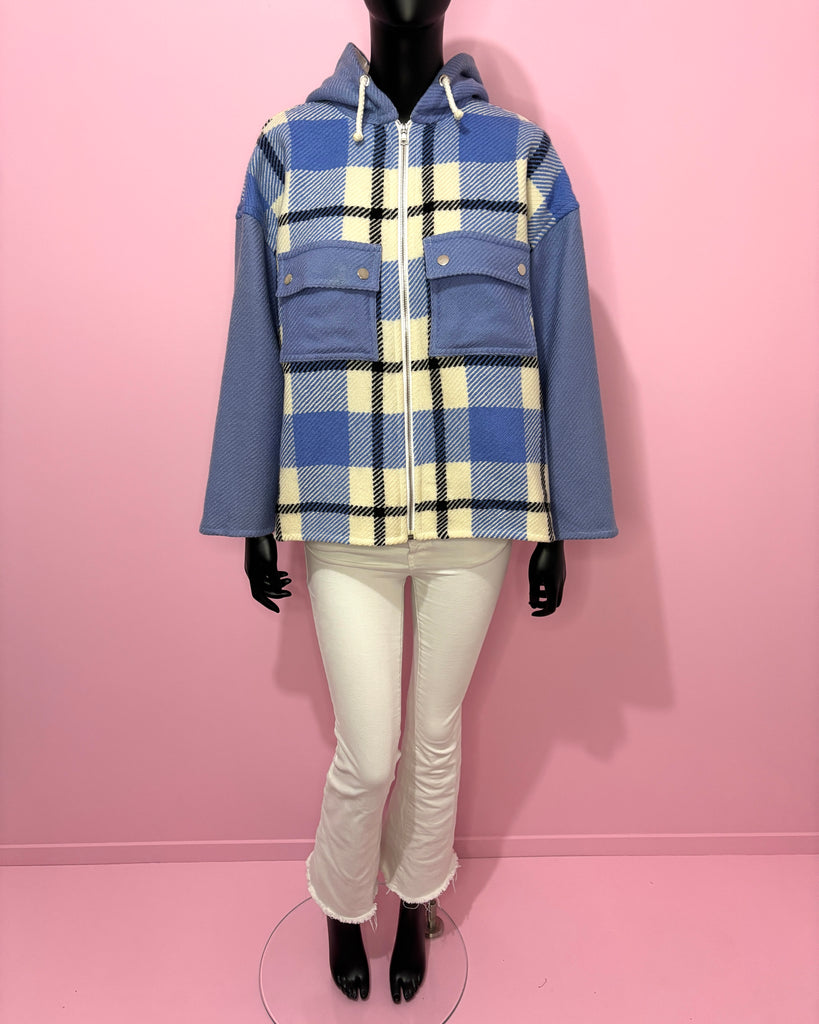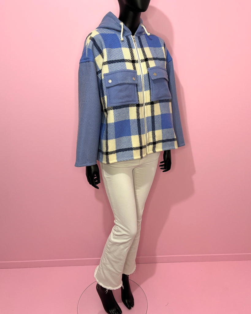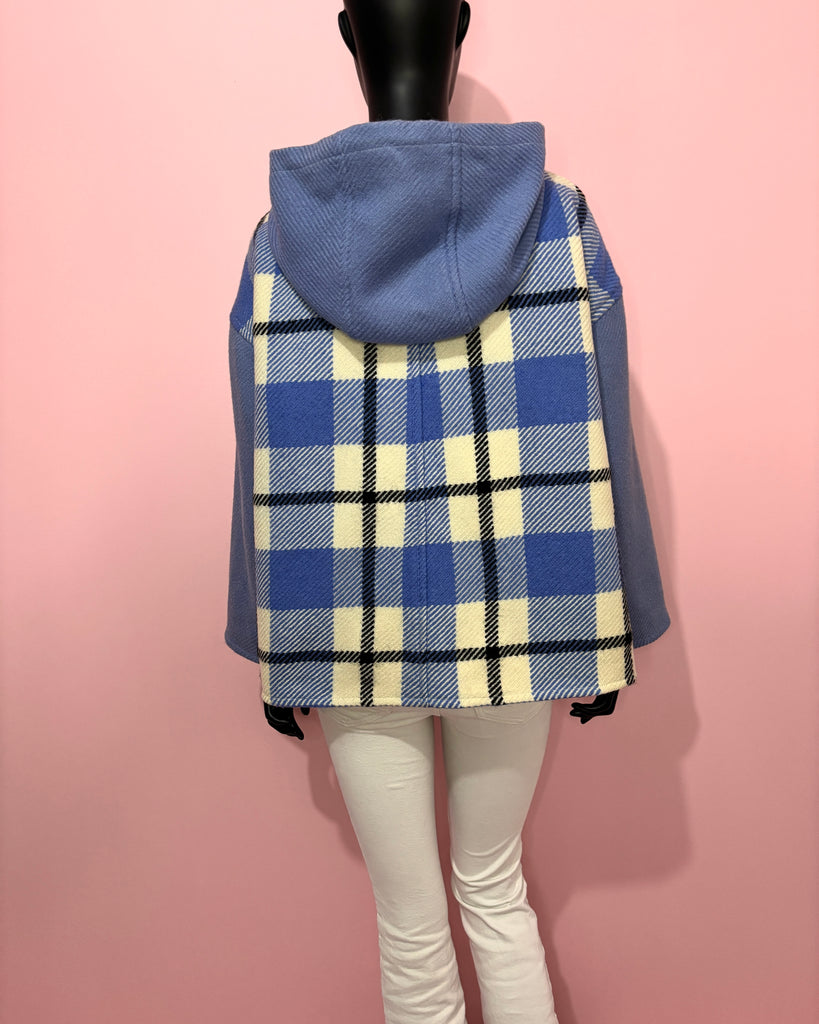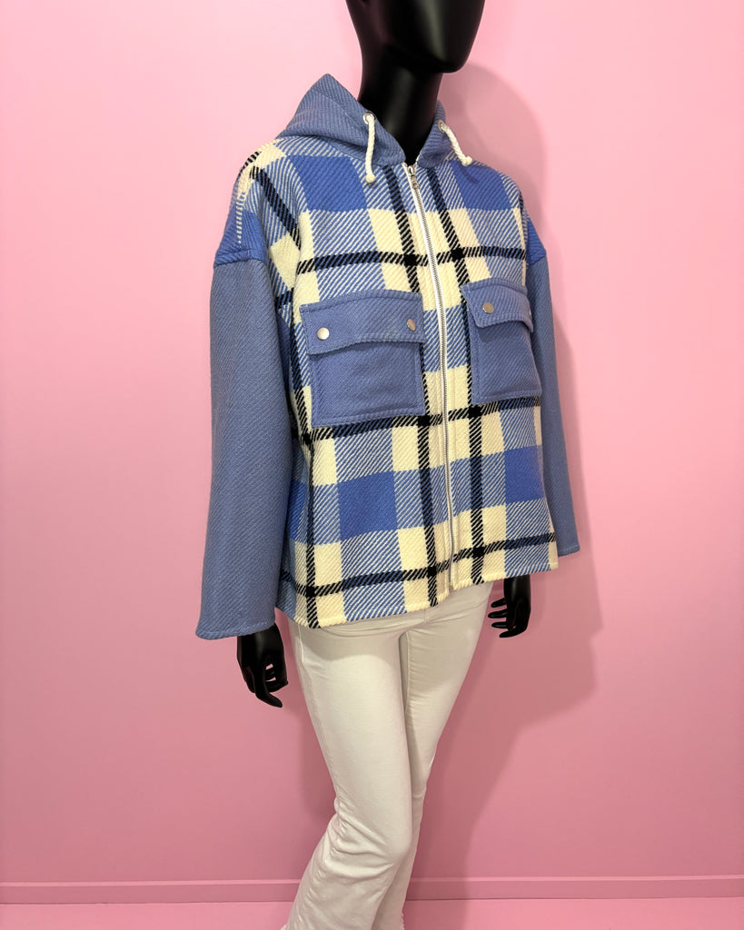 Blouson en laine avec motif tartan dans des couleurs bleu lavande, blanc crème et noir. Coupe oversize, épaules basses et manches, au tissage côtelé, légèrement resserrées aux poignets. Fermeture par zip, 2 grandes poches plaquées sur la poitrine avec rabat fermé par 2 boutons pression et une grande capuche avec lien de serrage. Doublé.