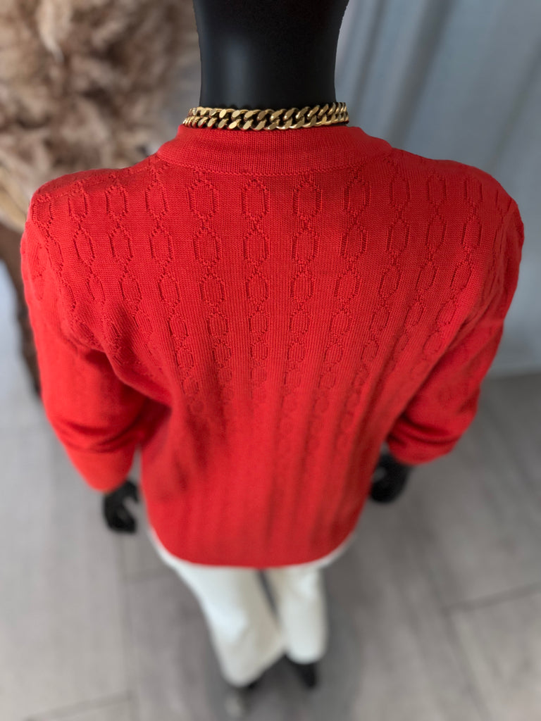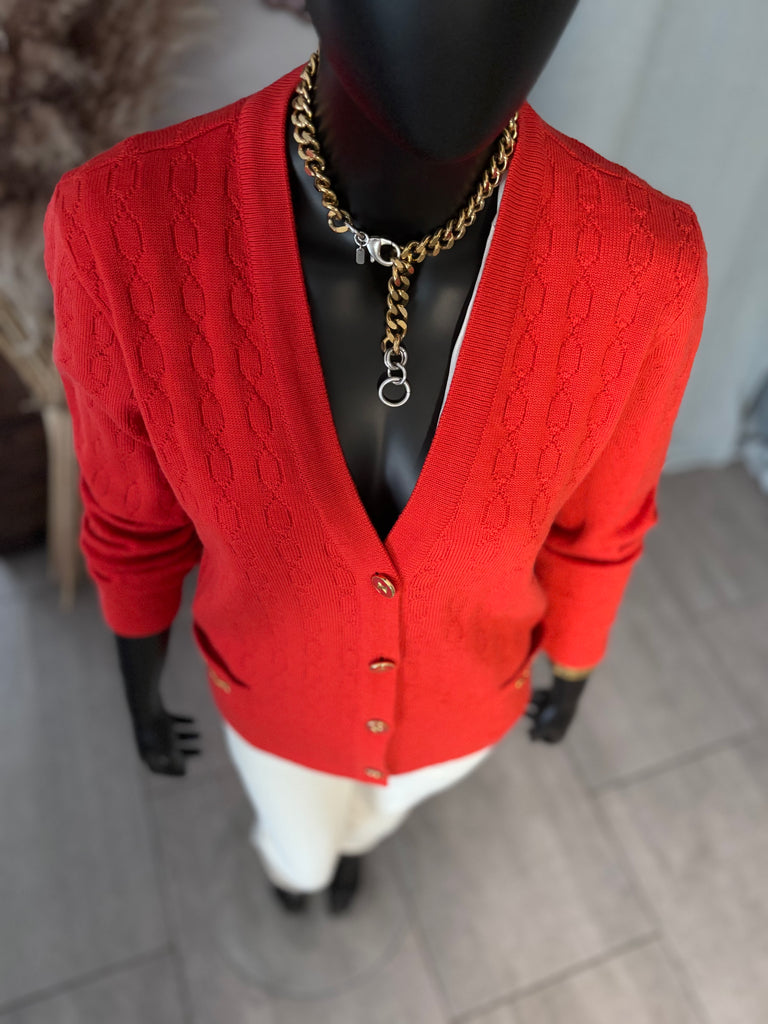 Cardigan en laine au tissage chaîne de couleur orange. Col en V fermé par boutons monogrammés Triomphe dorés et orange. Coupe droite. 2 petites poches plaquées avec chainette monogrammée.