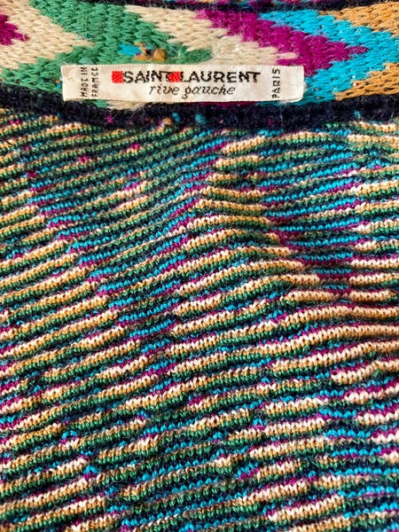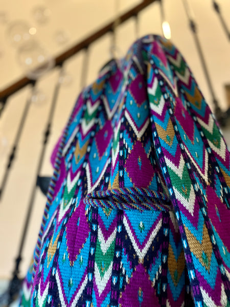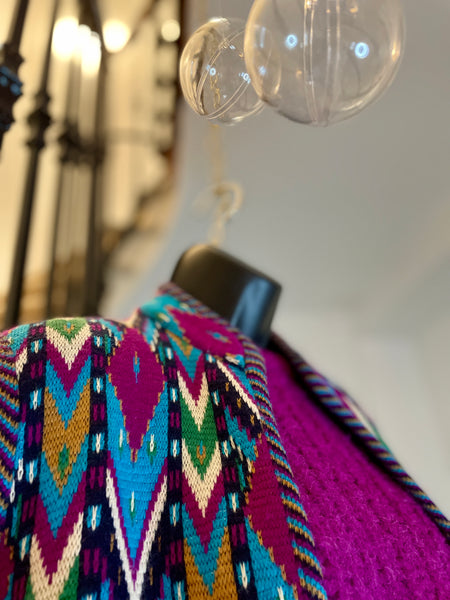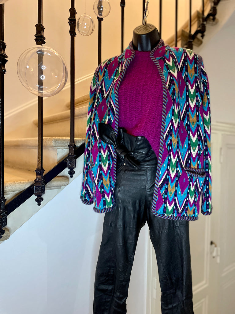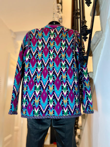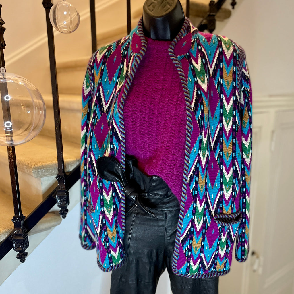 Cardigan à l'imprimé ethnique et aux couleurs éclatantes (turquoise, fuchsia, blanc, noir, vert et camel). 100% laine, il est épais et a beaucoup de tenue. Entièrement gansé d'une bordure en laine rayée fuchsia et bleu y compris les poches et les poignets. Col officier.