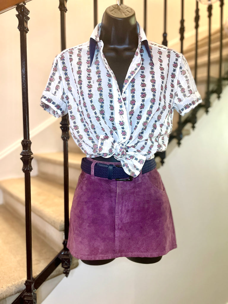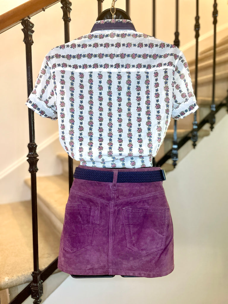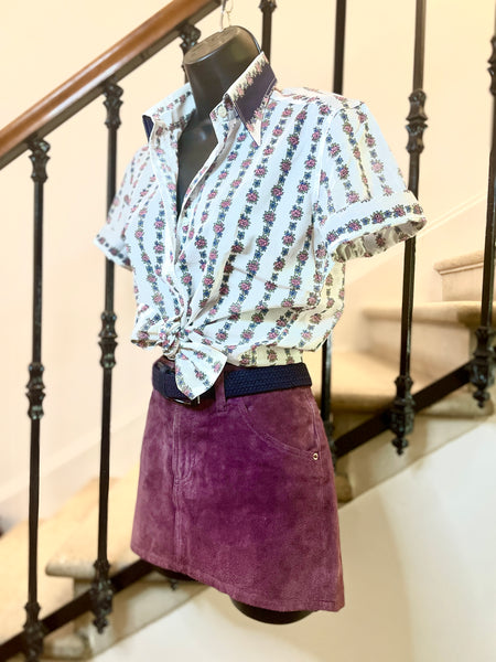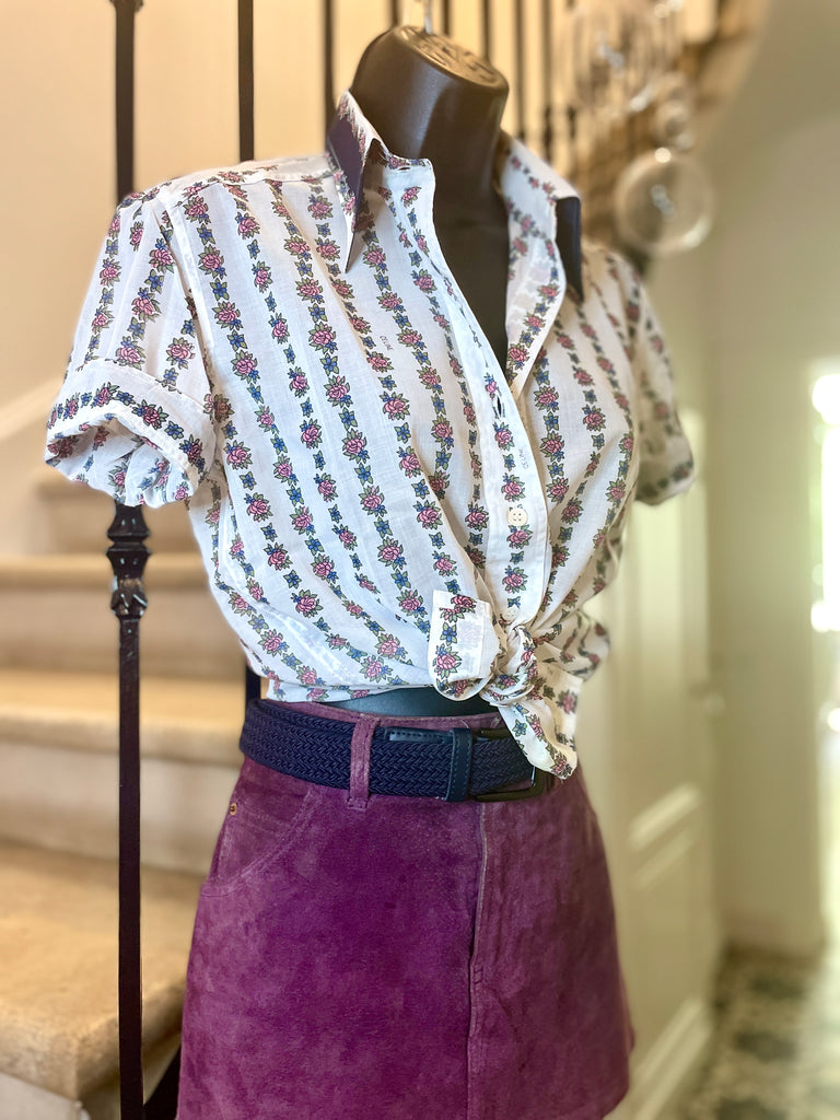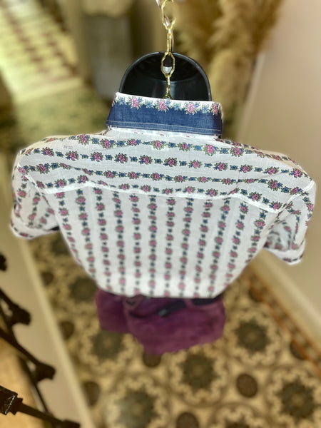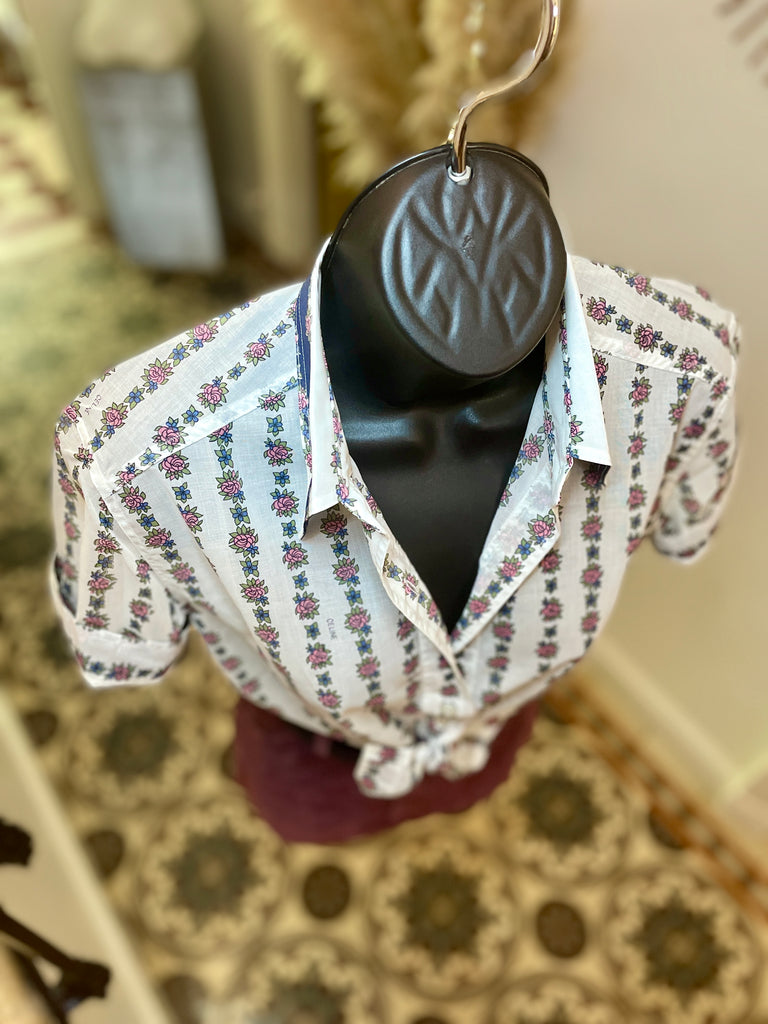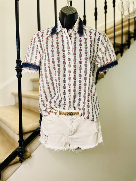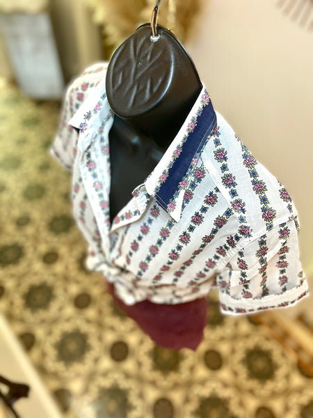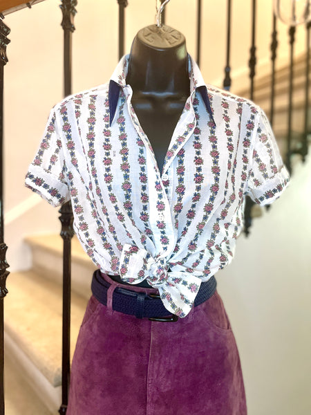 Chemise manches courtes en voile de coton à l'imprimé petites fleurs avec inscriptions « Céline ». Col en pointe bordé de bleu marine tout comme les manches. Fermeture par simple boutonnage