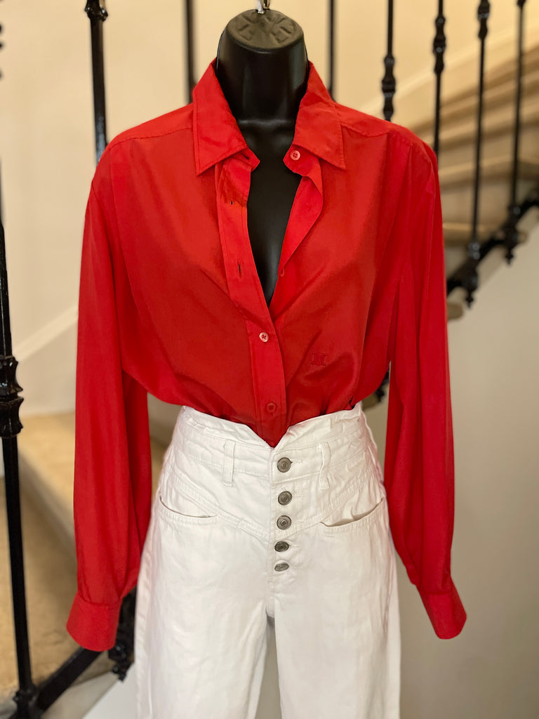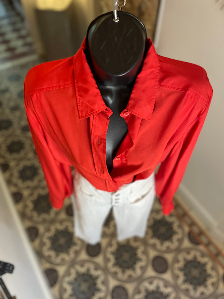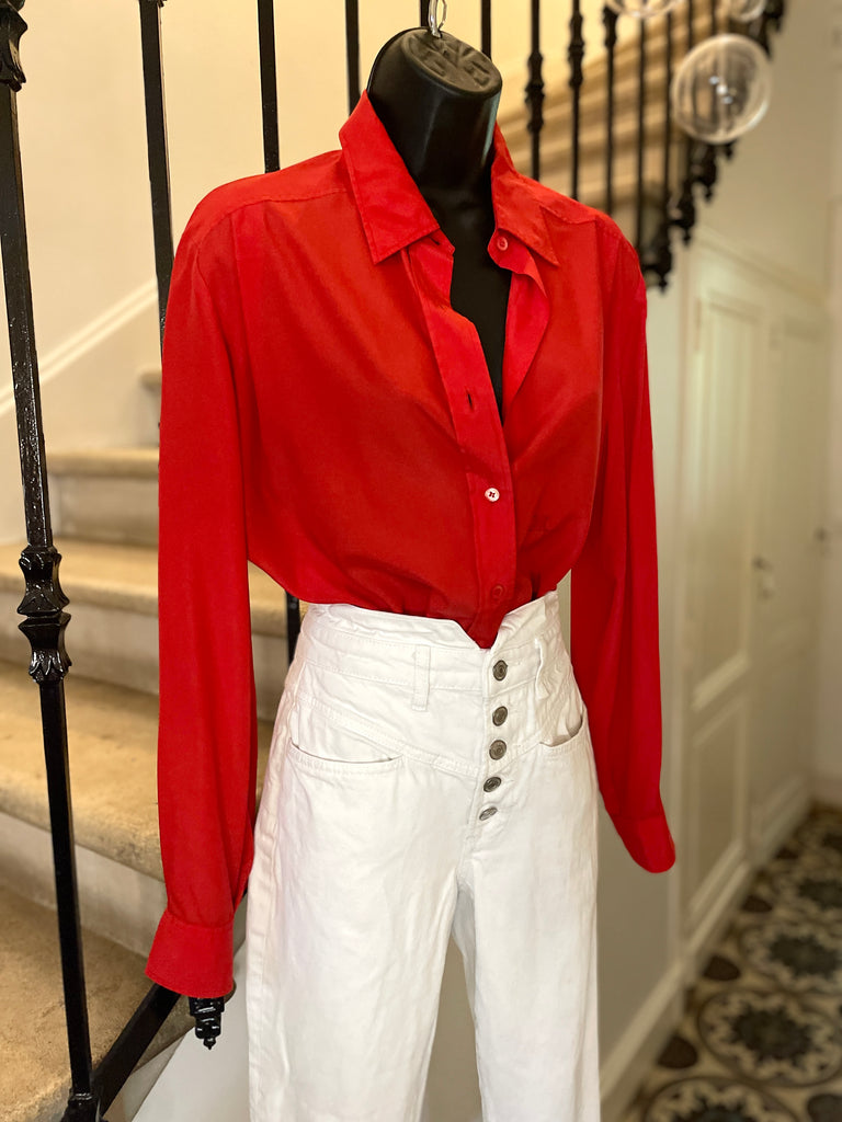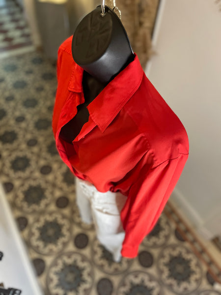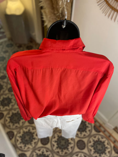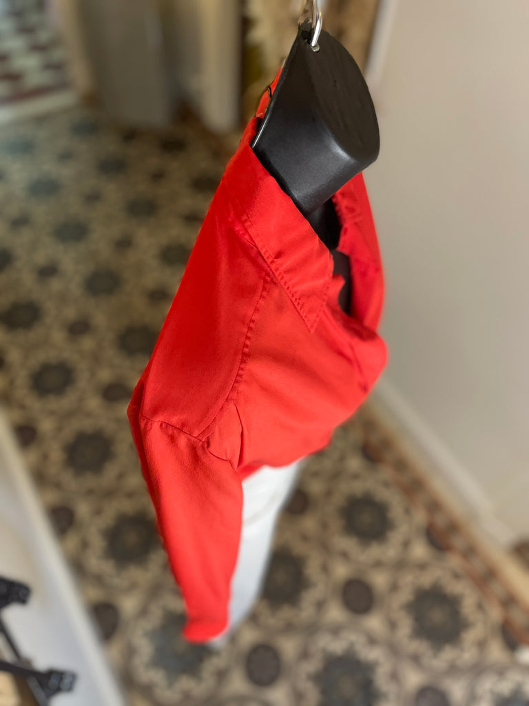 Chemisier en polyester de couleur rouge avec broderie Triomphe ton sur ton. Fermeture avec boutons rouges siglés. Coupe droite avec 2 plis à l’avant. Poignets fermés par 2 boutons.