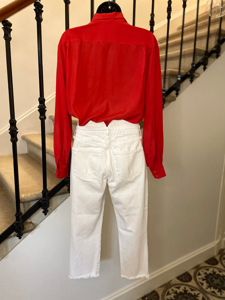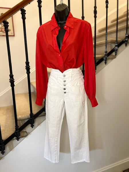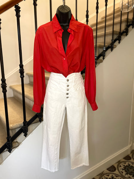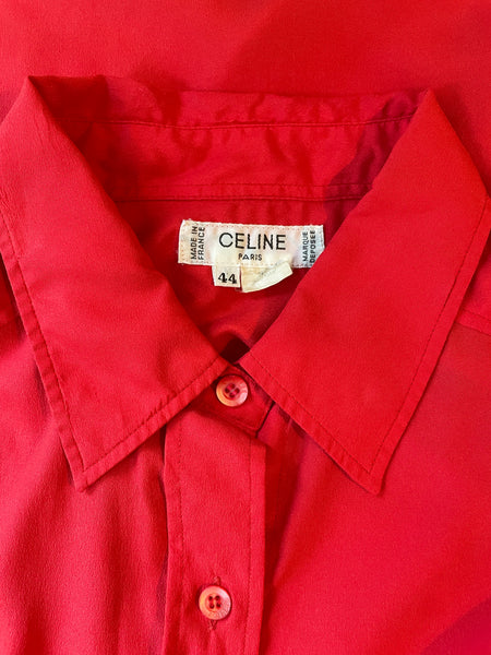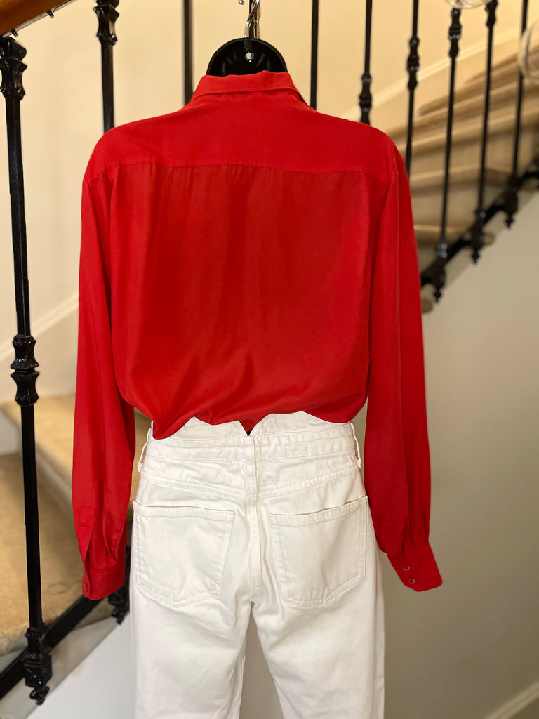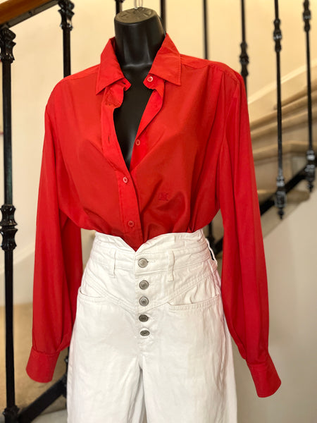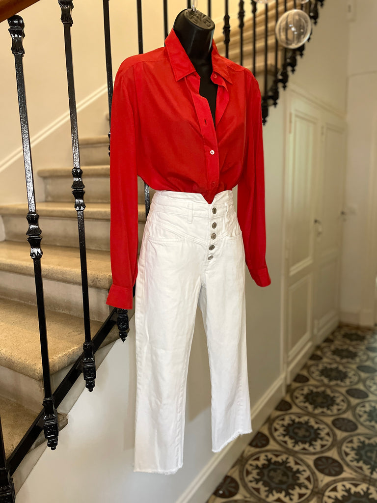 Chemisier en polyester de couleur rouge avec broderie Triomphe ton sur ton. Fermeture avec boutons rouges siglés. Coupe droite avec 2 plis à l’avant. Poignets fermés par 2 boutons.