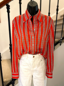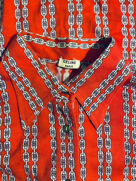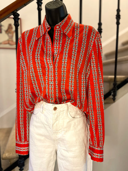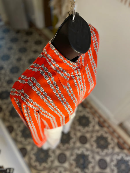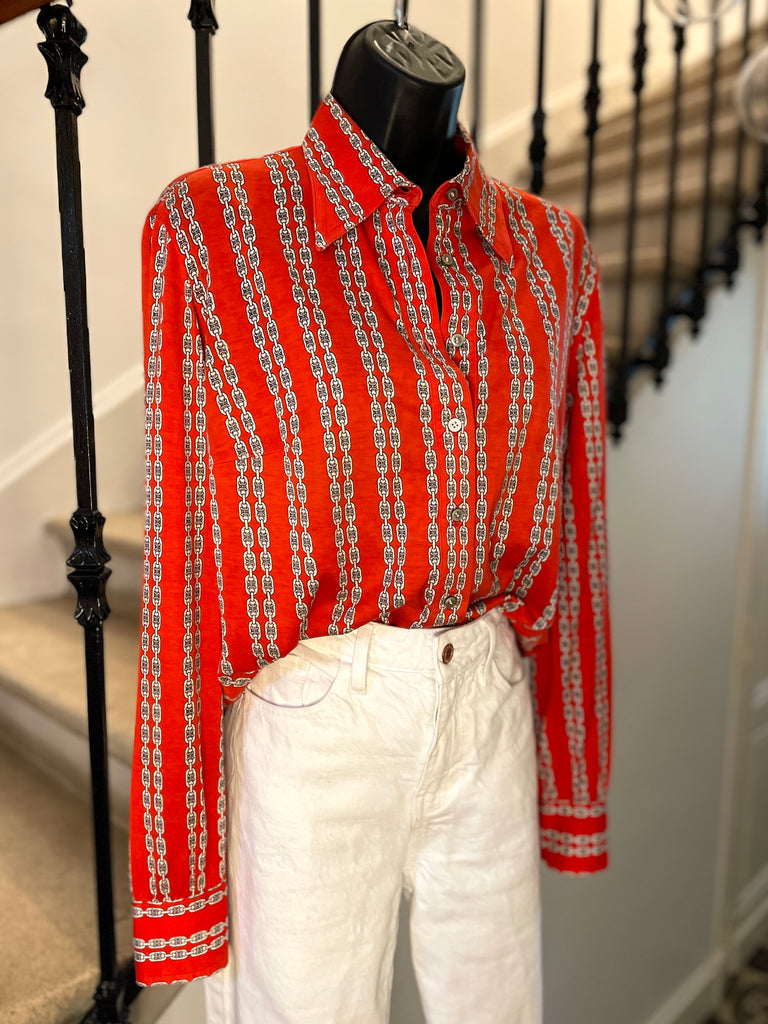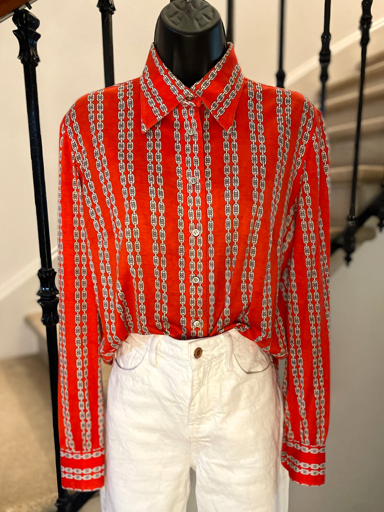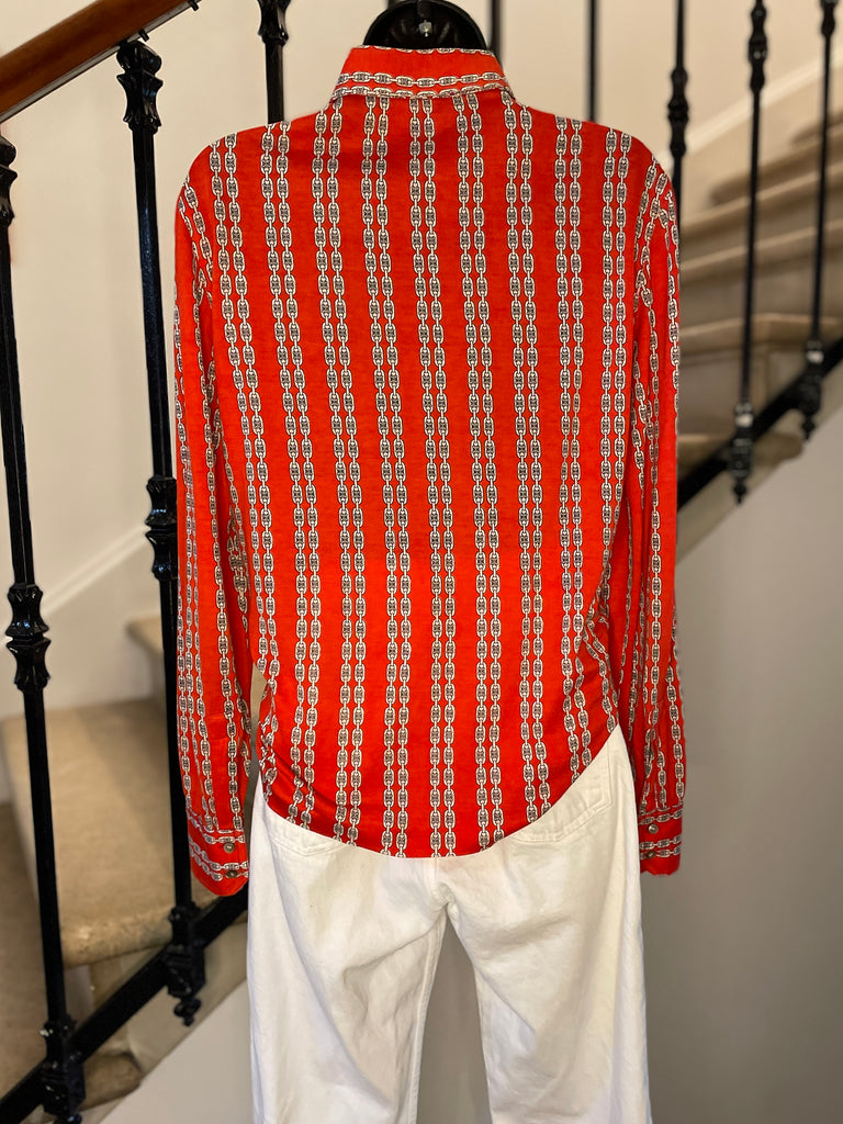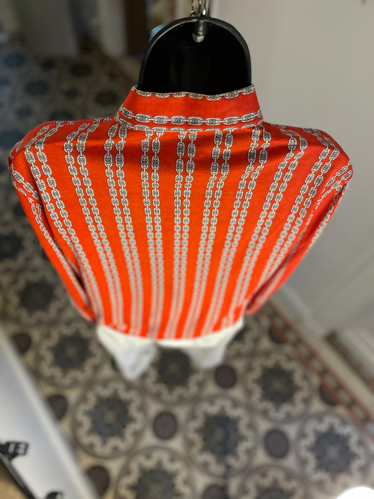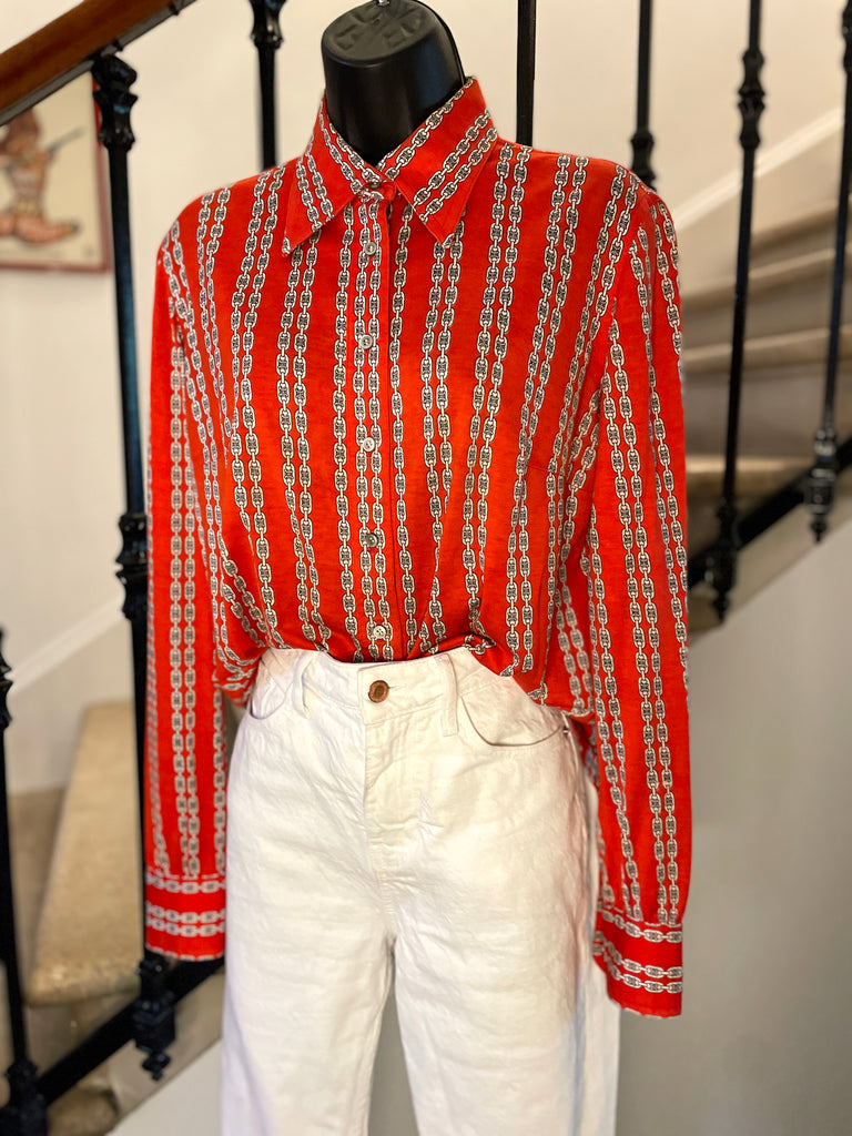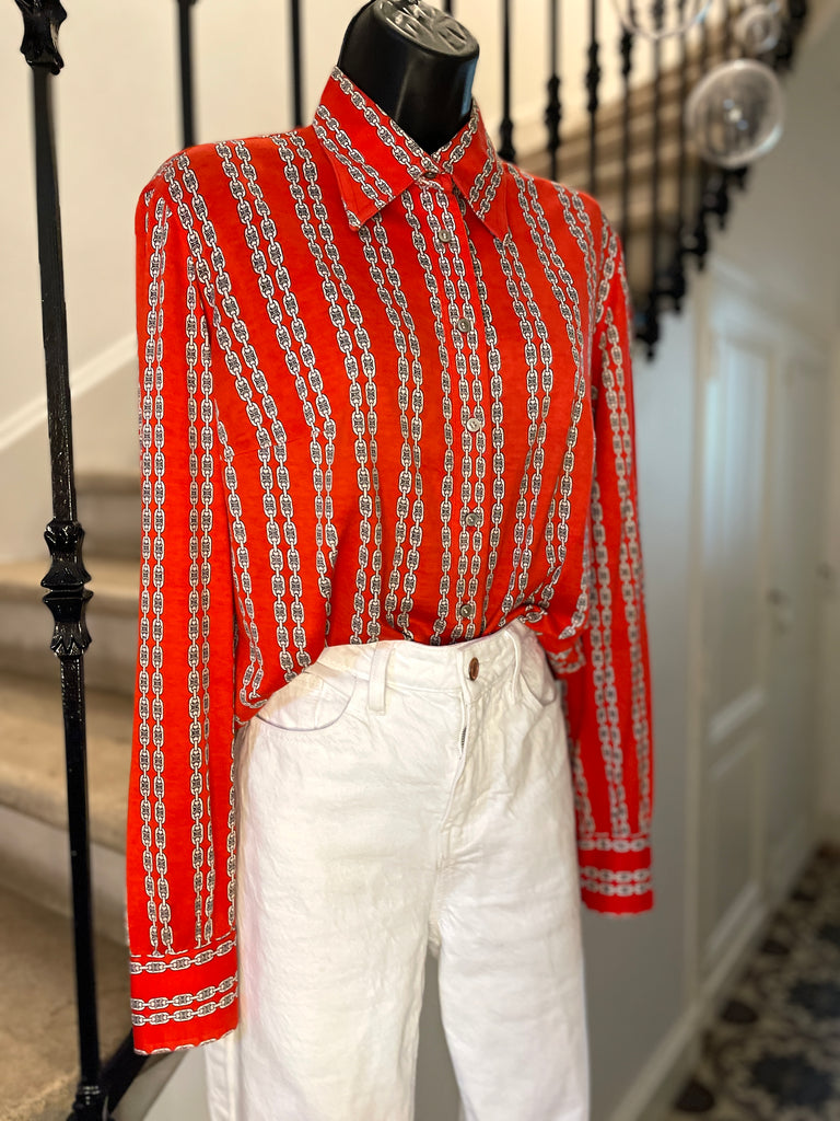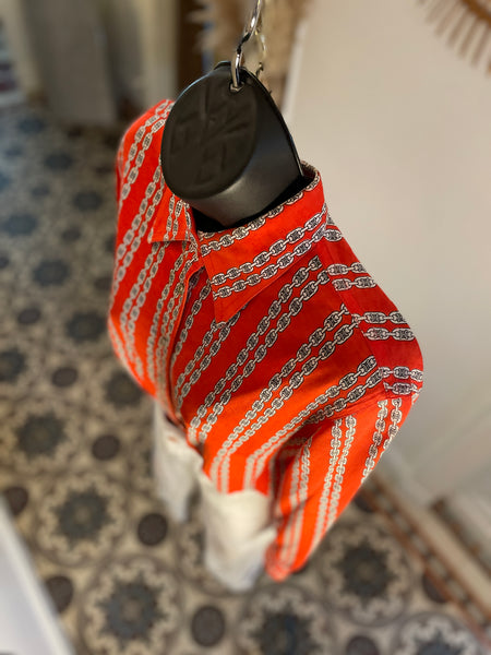 Chemisier de couleur rouge à l’imprimé chaînette monogrammé Triomphe dans des couleurs noir et blanc. Col en pointe et fermeture par simple boutonnage. Coupe droite avec coutures pour souligner la poitrine et 2 petite fentes latérales.