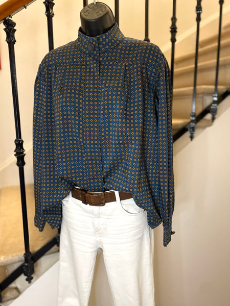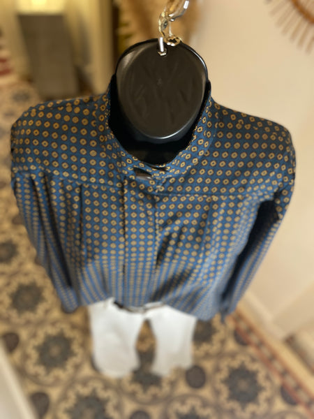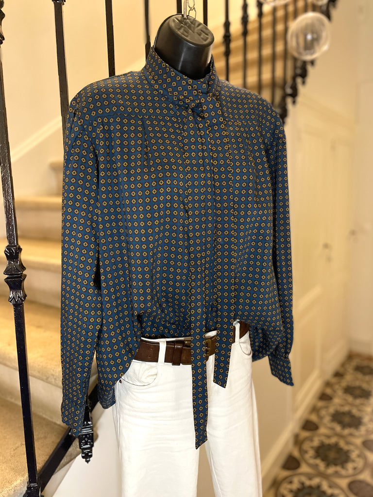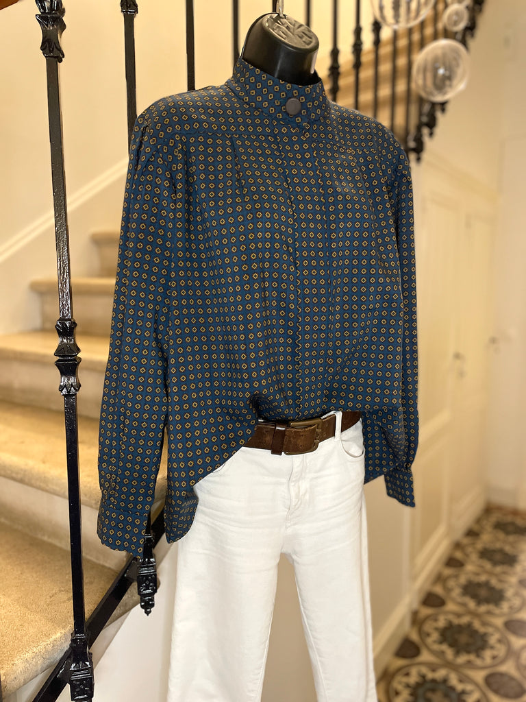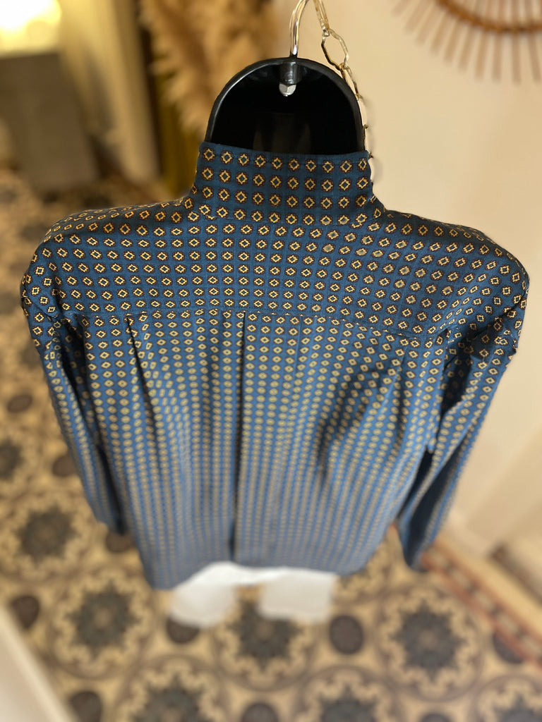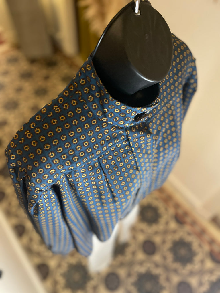Chemisier en étamine de laine à l’imprimé d’inspiration ethnique dans des couleurs bleu canard, marron et jaune. Coupe ample avec jeu de plis à l’avant et l’arrière, petit col montant, avec lavallière amovible, fermé par un bouton rond marron et fermeture masquée par une large patte. Epaules avec jeu de plis et manches larges fermées par 1 bouton façon bois marron.