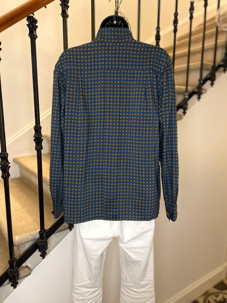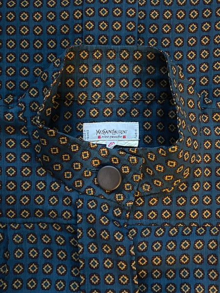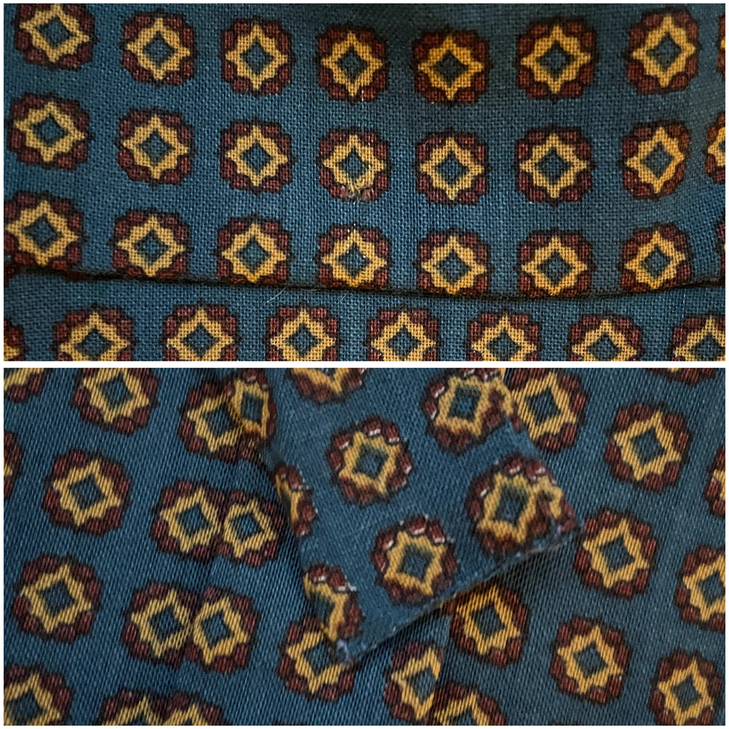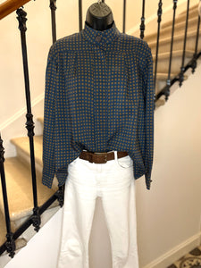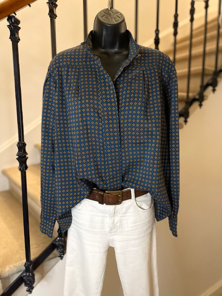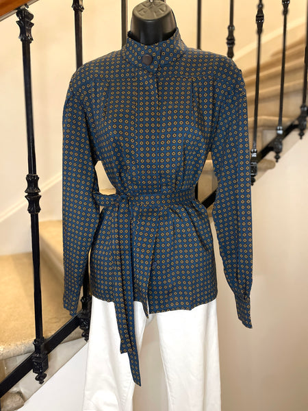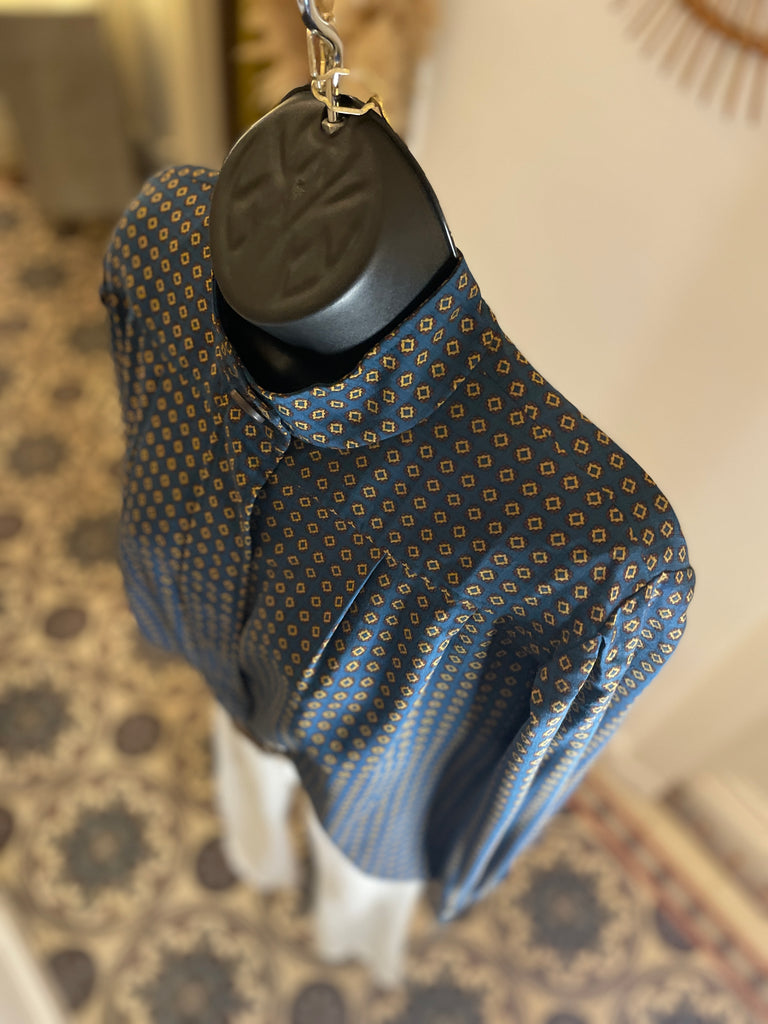 Chemisier en étamine de laine à l’imprimé d’inspiration ethnique dans des couleurs bleu canard, marron et jaune. Coupe ample avec jeu de plis à l’avant et l’arrière, petit col montant, avec lavallière amovible, fermé par un bouton rond marron et fermeture masquée par une large patte. Epaules avec jeu de plis et manches larges fermées par 1 bouton façon bois marron.