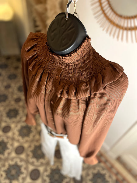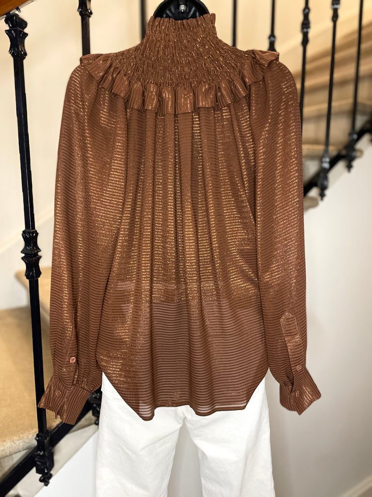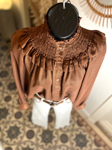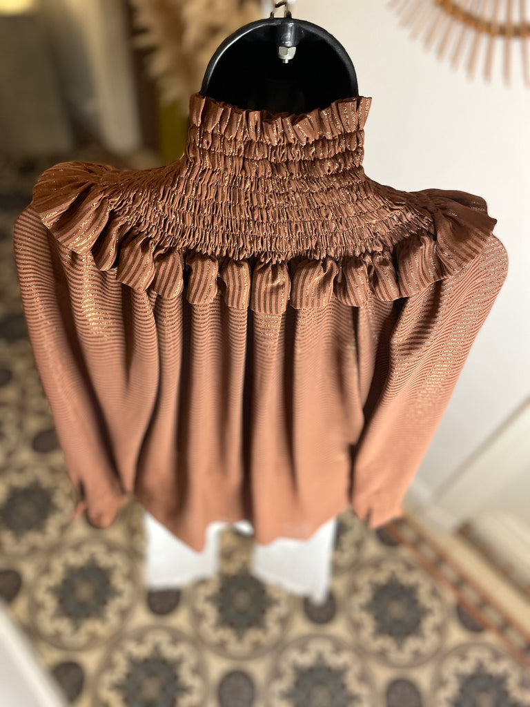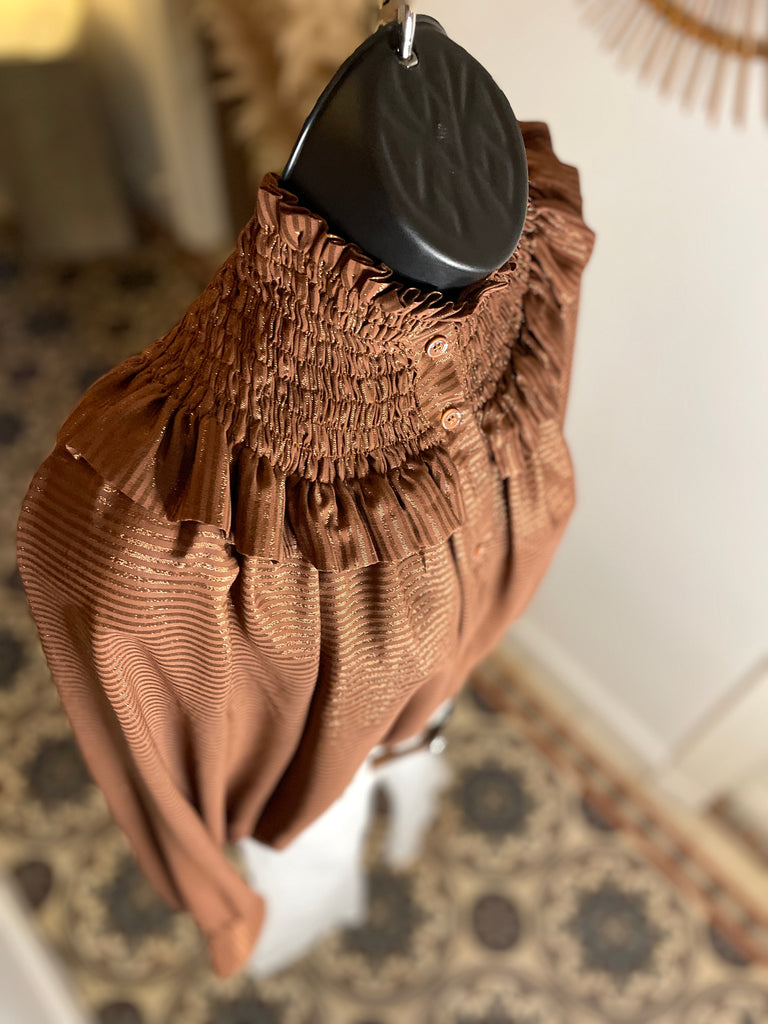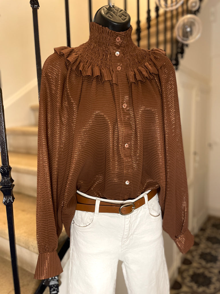 Chemisier en soie de couleur camel avec rayures en lurex doré cuivré. Coupe ample avec manches raglan et col montant avec smocks et volant. Fermeture par boutons siglés ton sur ton et une petite pression à l’extrémité du col. Larges poignets fermés par 2 boutons.