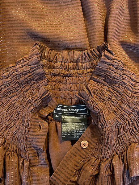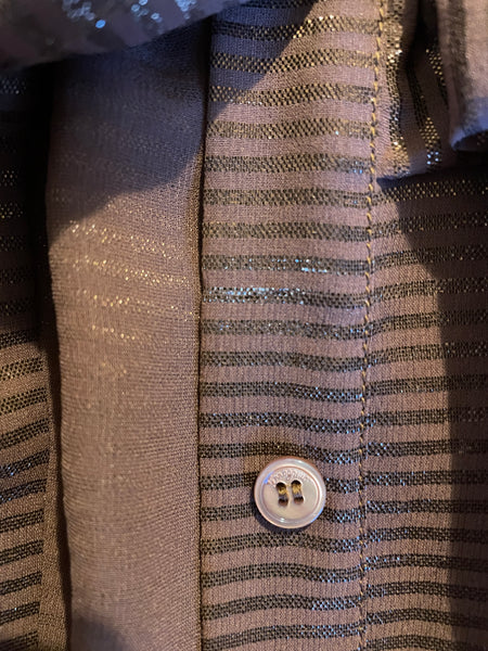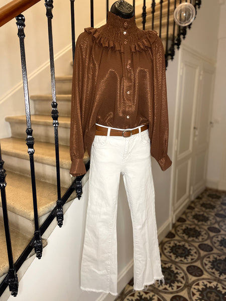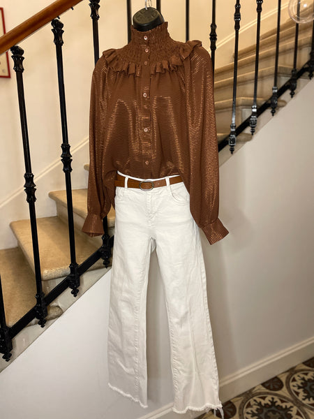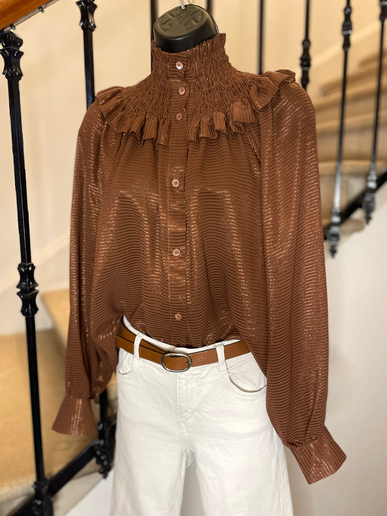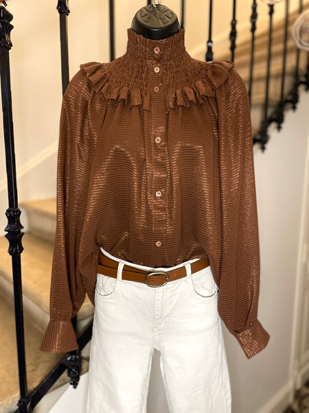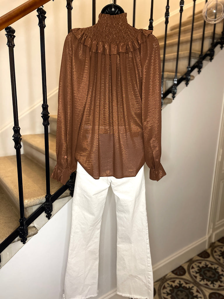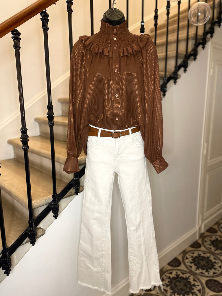 Chemisier en soie de couleur camel avec rayures en lurex doré cuivré. Coupe ample avec manches raglan et col montant avec smocks et volant. Fermeture par boutons siglés ton sur ton et une petite pression à l’extrémité du col. Larges poignets fermés par 2 boutons.
