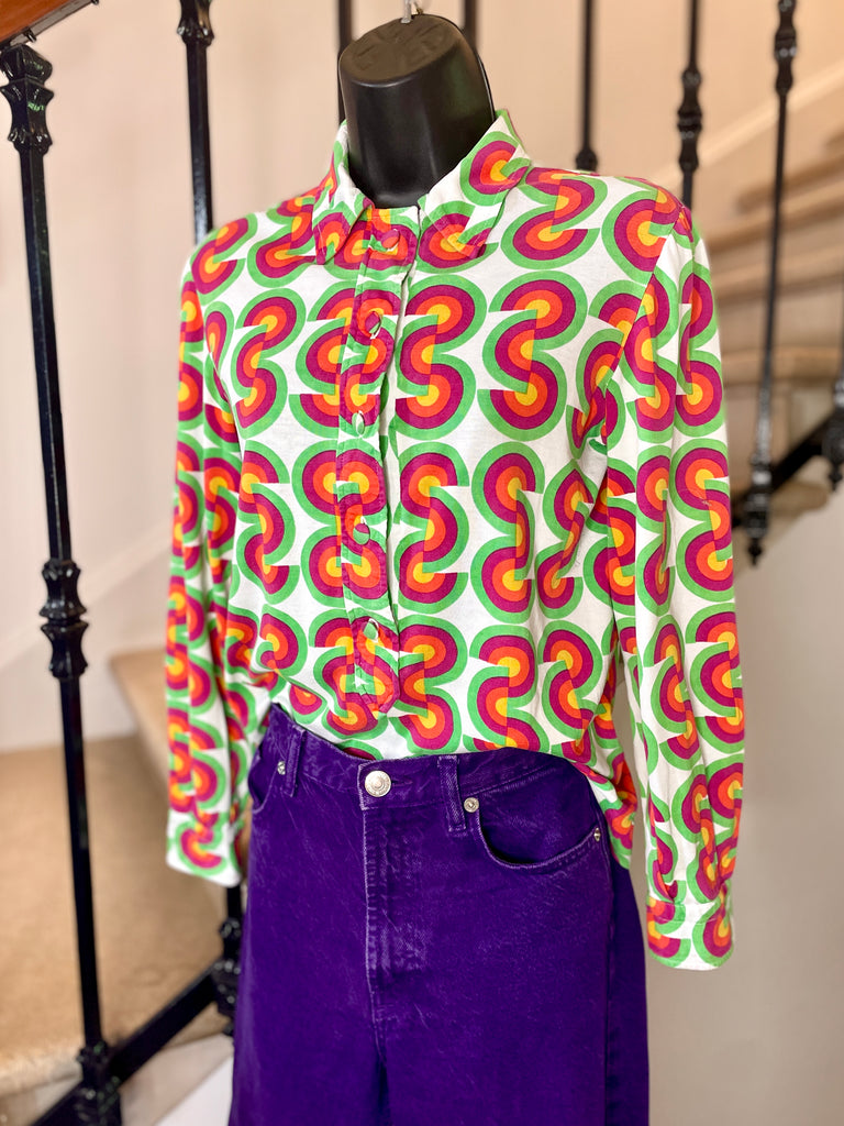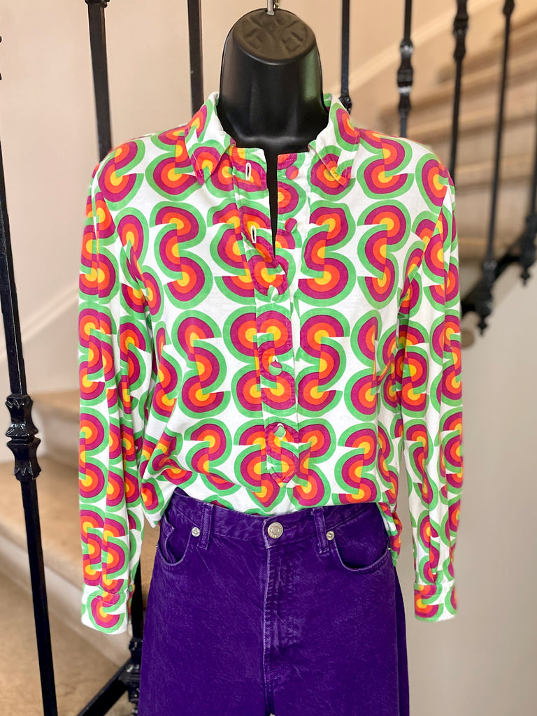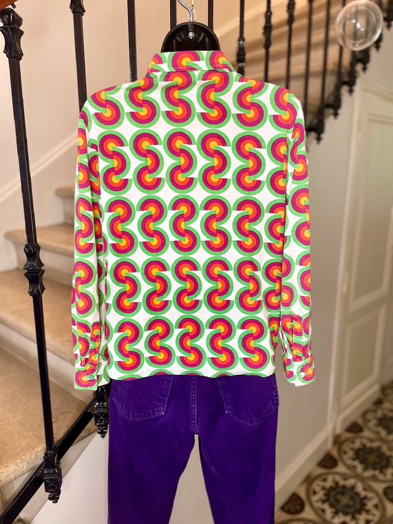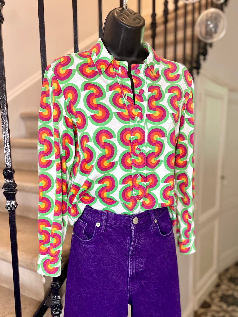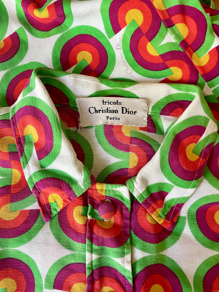 Chemisier façon polo en jersey de coton à l’imprimé CD vert, fuchsia, orange et jaune sur fond blanc avec inscriptions « Christian Dior » noires. Col chemise (pointes fixées par 1 point de couture), décolleté fermé par boutons recouverts et un crochet et coupe droite. Poignets fermés par 1 bouton recouvert.
