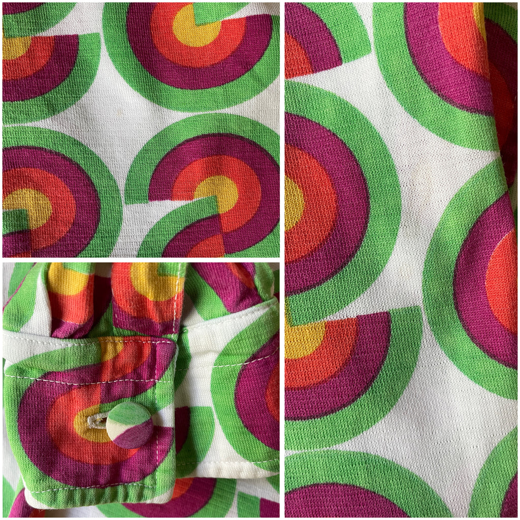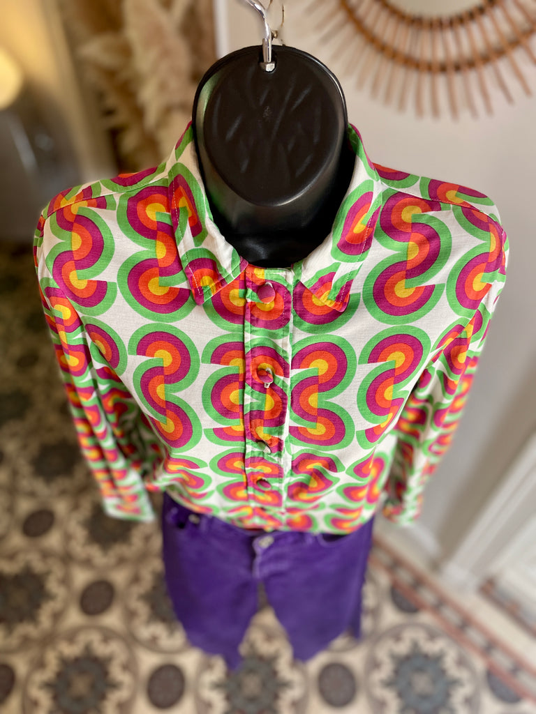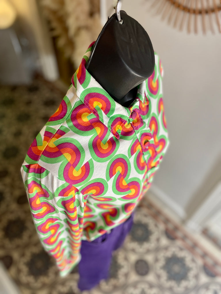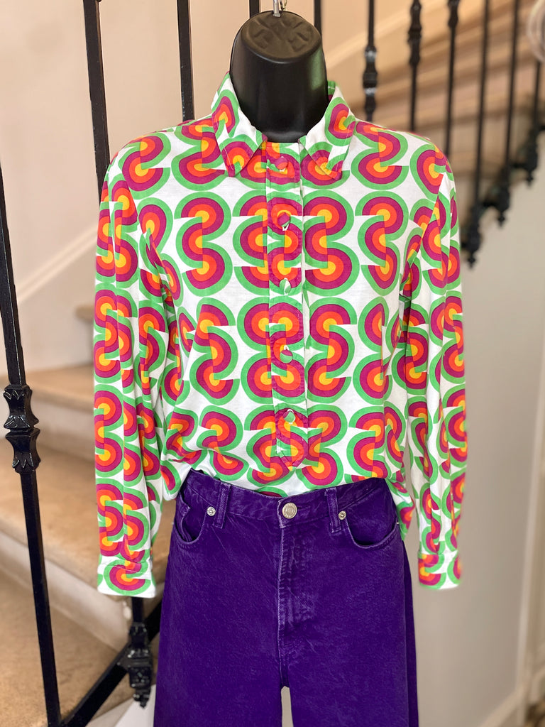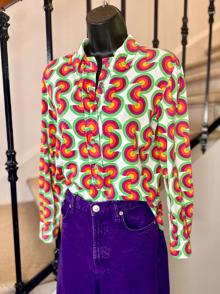 Chemisier façon polo en jersey de coton à l’imprimé CD vert, fuchsia, orange et jaune sur fond blanc avec inscriptions « Christian Dior » noires. Col chemise (pointes fixées par 1 point de couture), décolleté fermé par boutons recouverts et un crochet et coupe droite. Poignets fermés par 1 bouton recouvert.