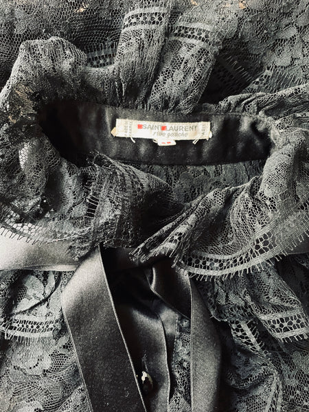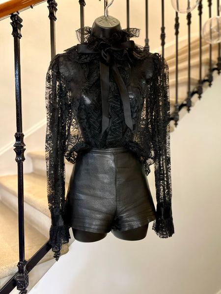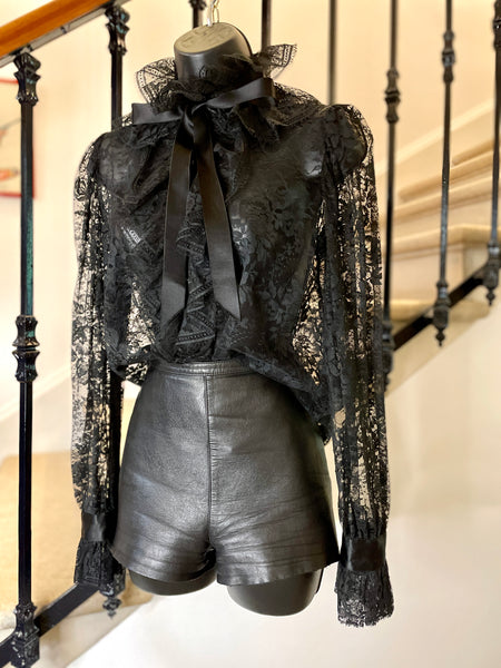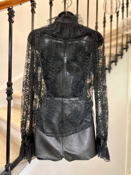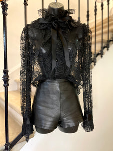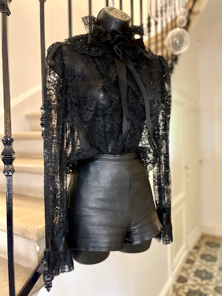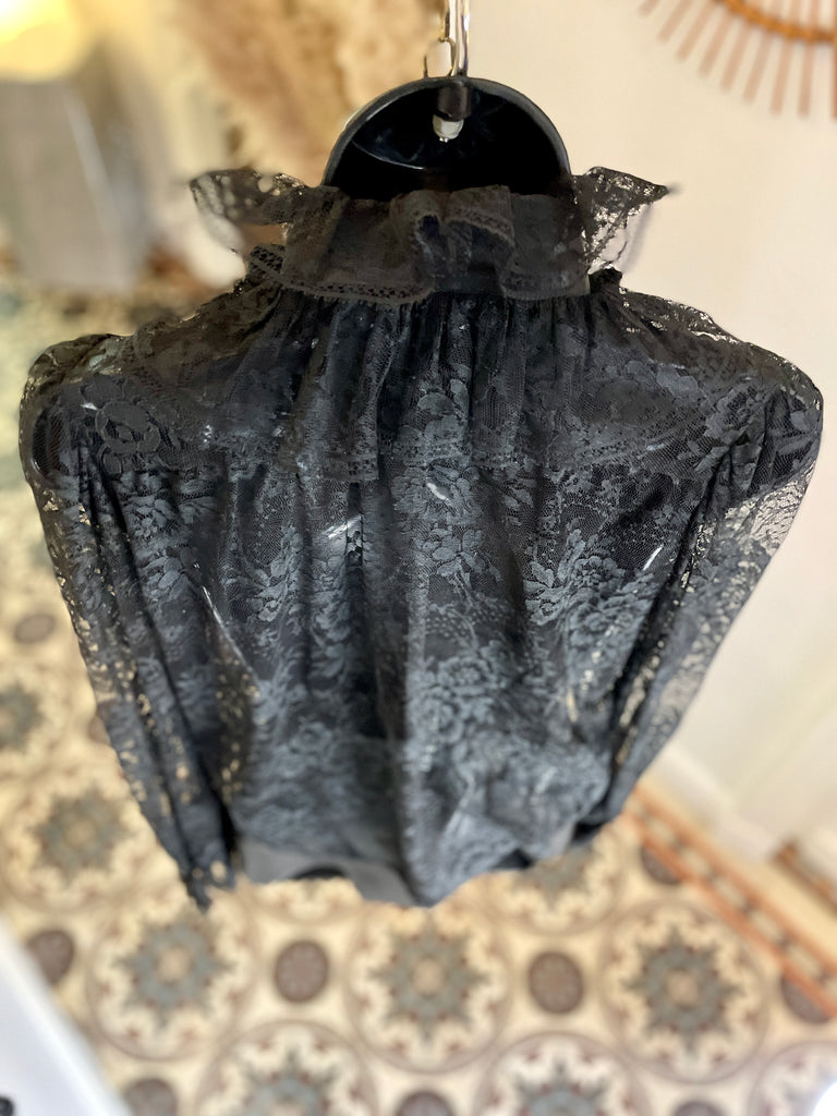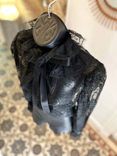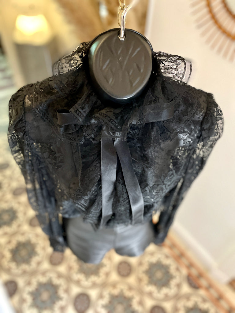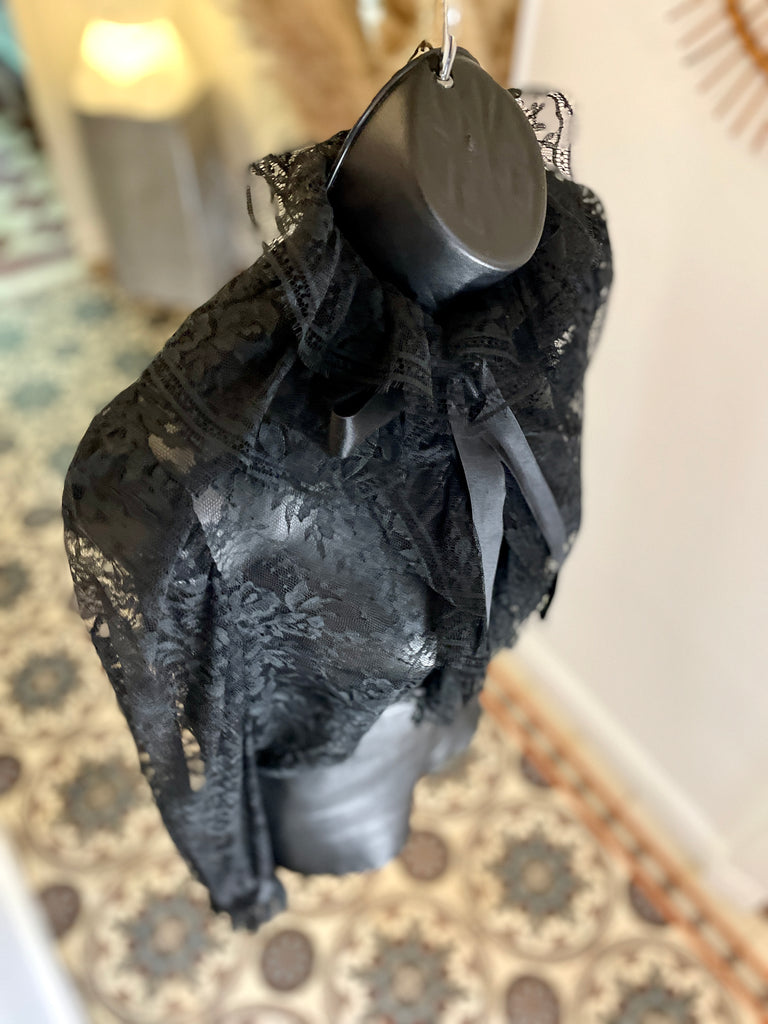 Chemisier en dentelle de coton (?) de couleur noire. Col pierrot à double volants séparés par un galon de soie noire qui se prolonge en lavallière. Fermeture par simple boutonnage avec boutons noirs à facettes bordé de soie et volanté. Poignets avec manchettes volantées fermés par 1 bouton sur un galon de soie. Évidemment transparente ;)