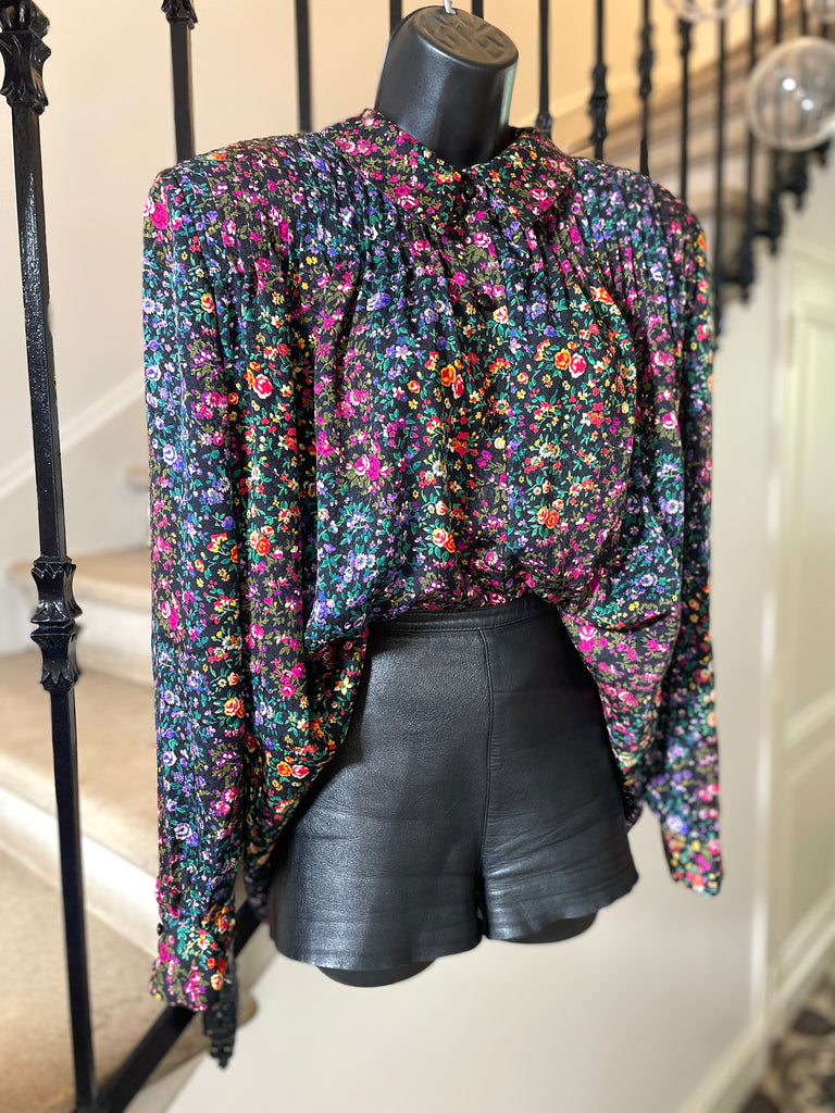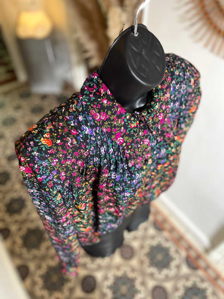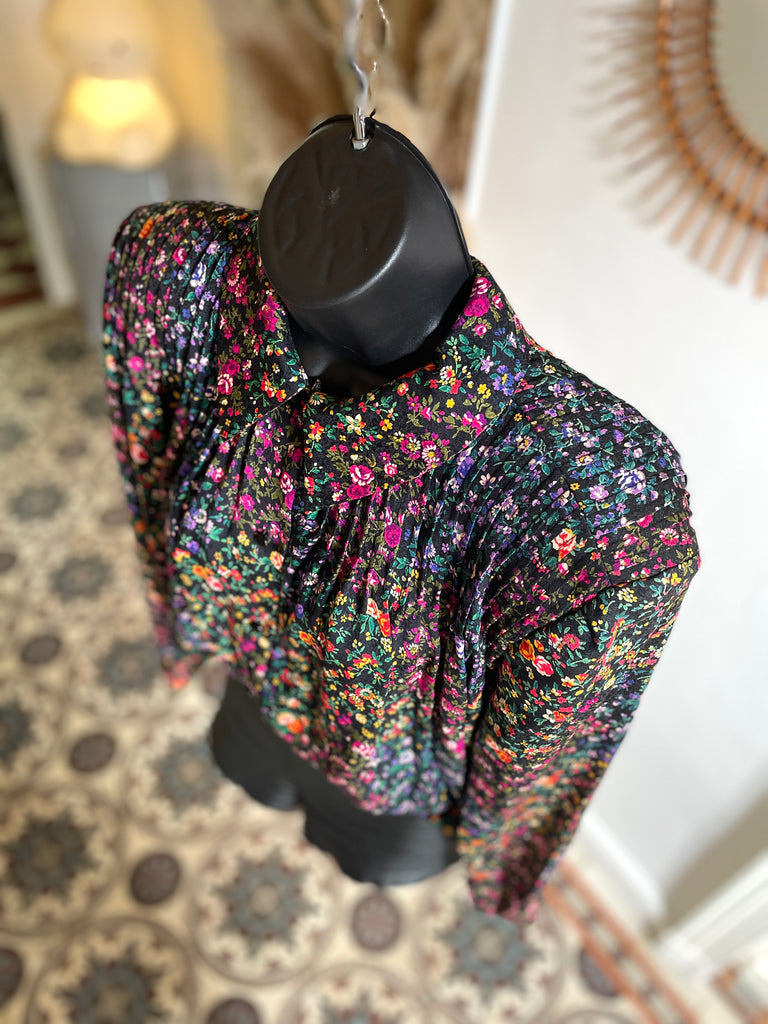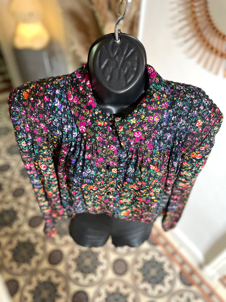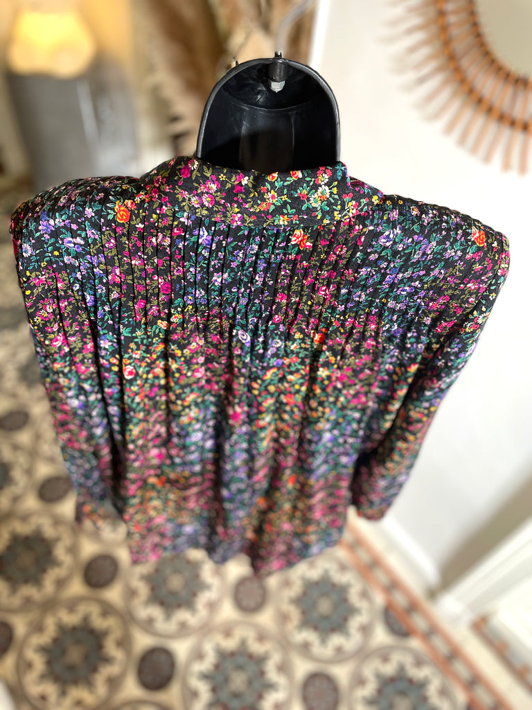 Chemisier en soie façonnée à l’imprimé fleuri multicolore sur fond noir. Col façon Claudine, jeu de petits plis plats sur les épaules à l’avant et dans le dos. Épaules marquées par des épaulettes XXL (qui peuvent être retirées). Fermeture par simple boutonnage avec petits boutons ronds et noirs et une petite pression au col. Poignets fermés par 2 boutons.