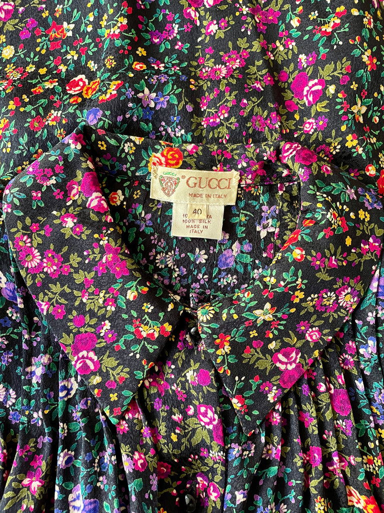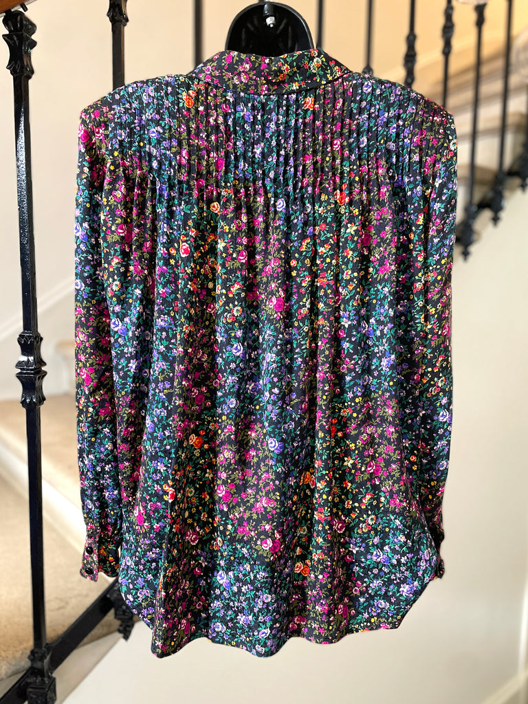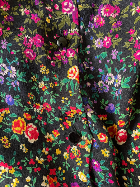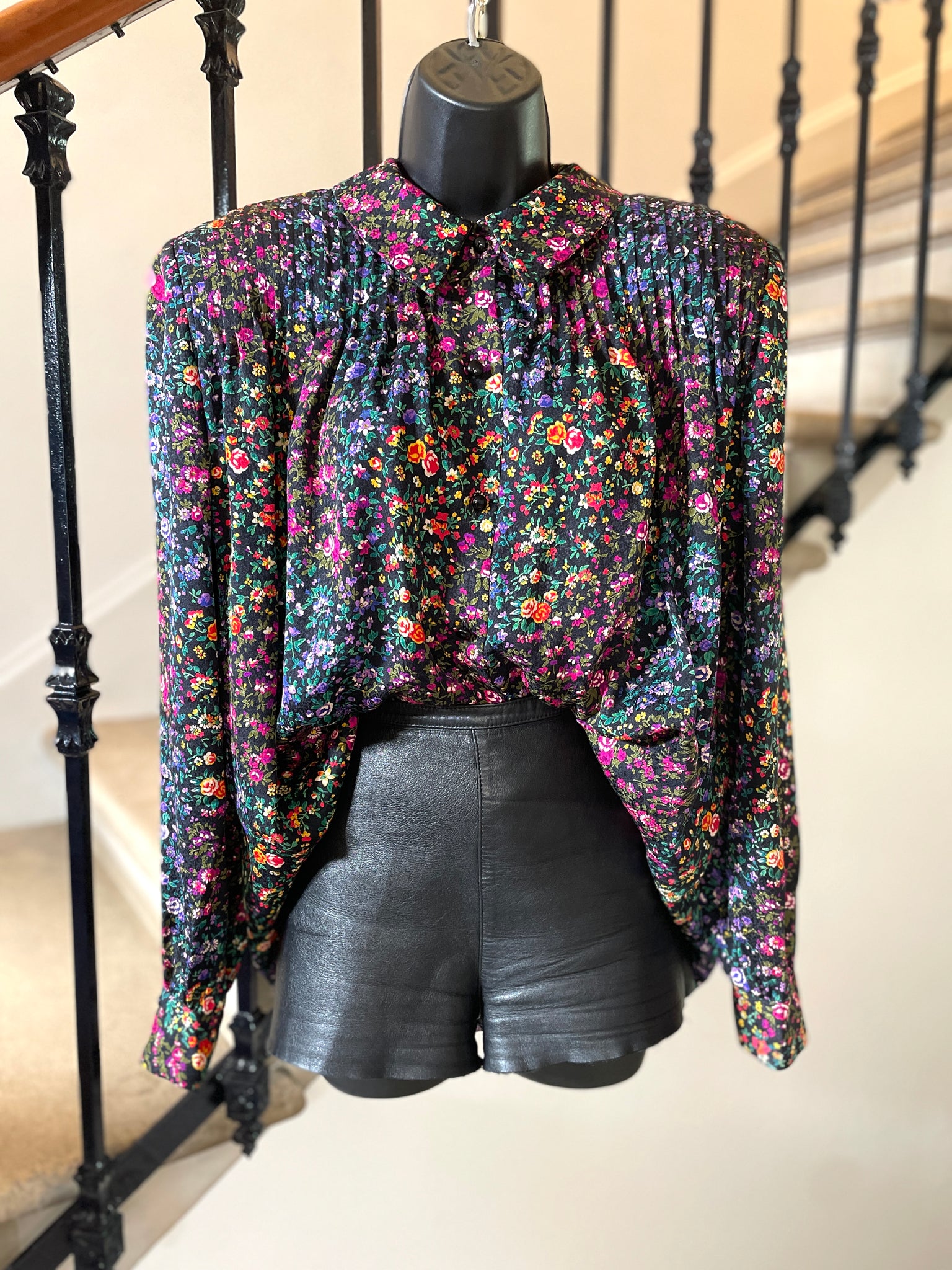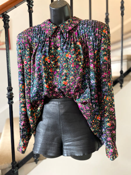Chemisier en soie façonnée à l’imprimé fleuri multicolore sur fond noir. Col façon Claudine, jeu de petits plis plats sur les épaules à l’avant et dans le dos. Épaules marquées par des épaulettes XXL (qui peuvent être retirées). Fermeture par simple boutonnage avec petits boutons ronds et noirs et une petite pression au col. Poignets fermés par 2 boutons.