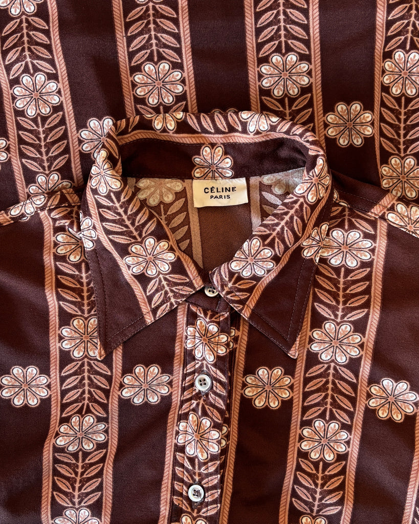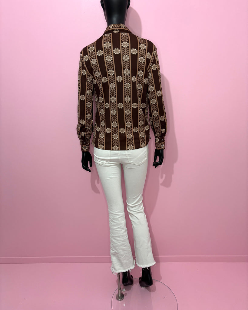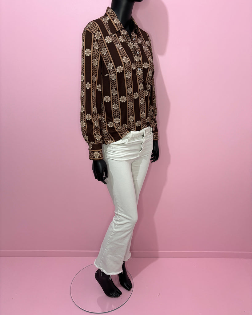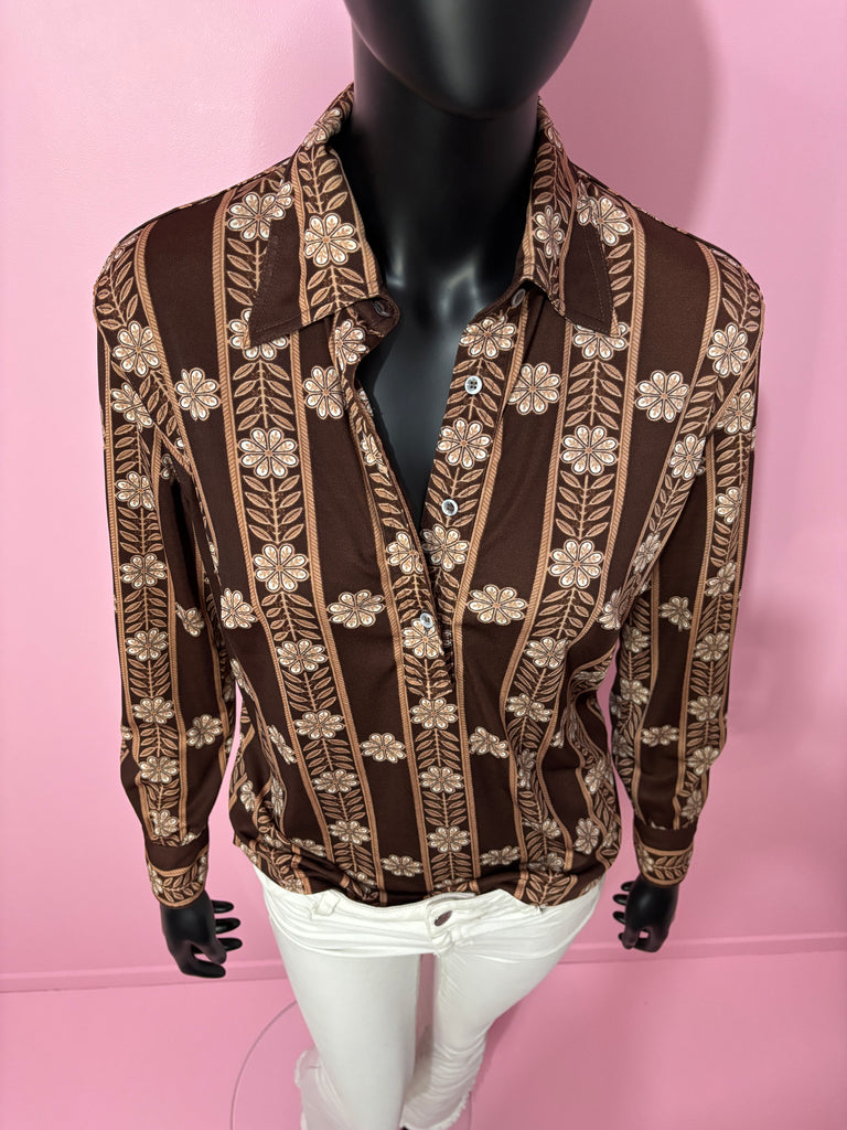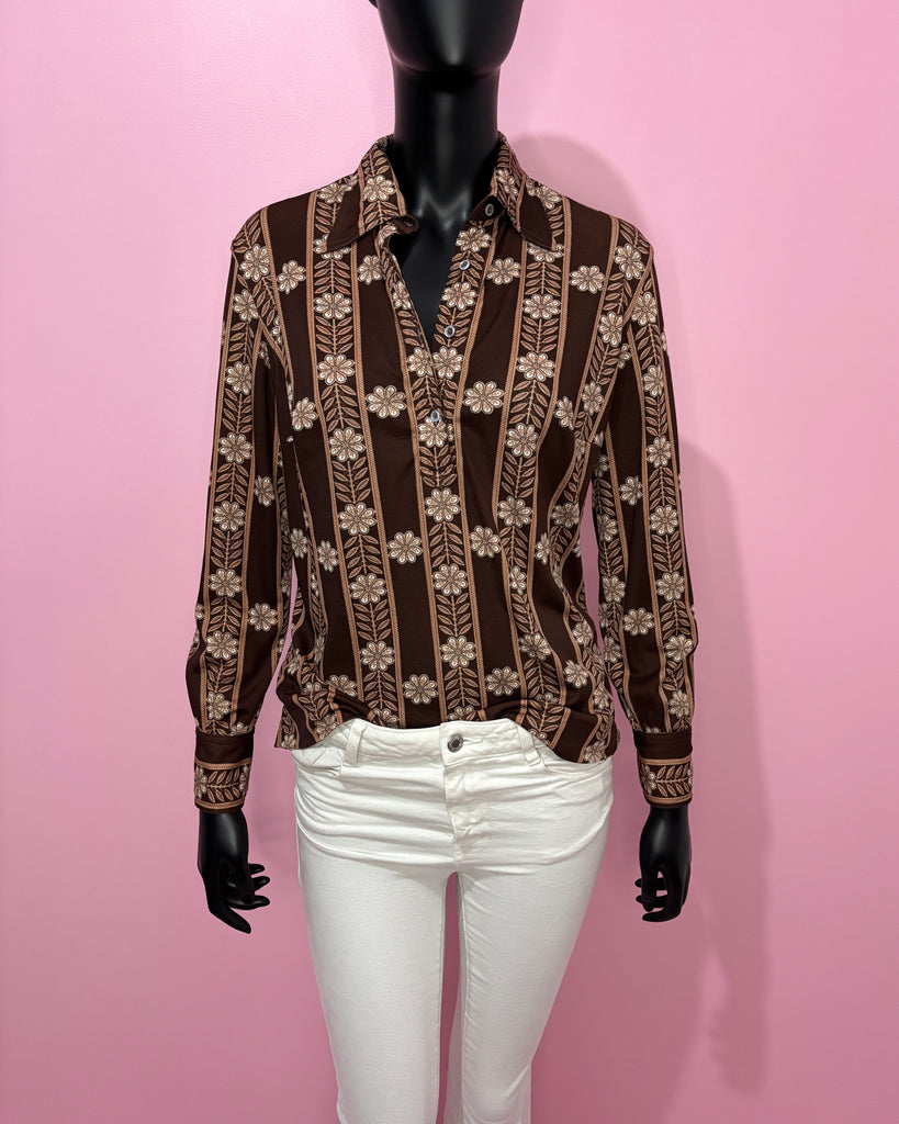 Blouse en matière synthétique façon jersey à l’imprimé floral et graphique de couleur marron tirant sur le bordeaux, beige rosé et blanc. Col chemisier plat et légèrement en pointe avec fermeture par boutons jusqu’à la poitrine. Coupe droite avec coutures à la poitrine et 2 petites fentes latérales. Larges poignets fermés par 2 boutons.
