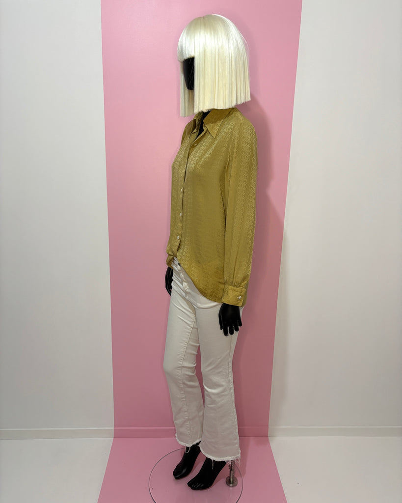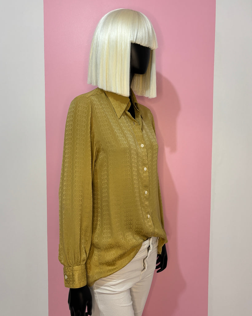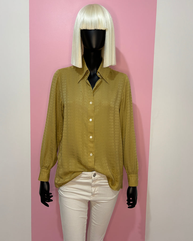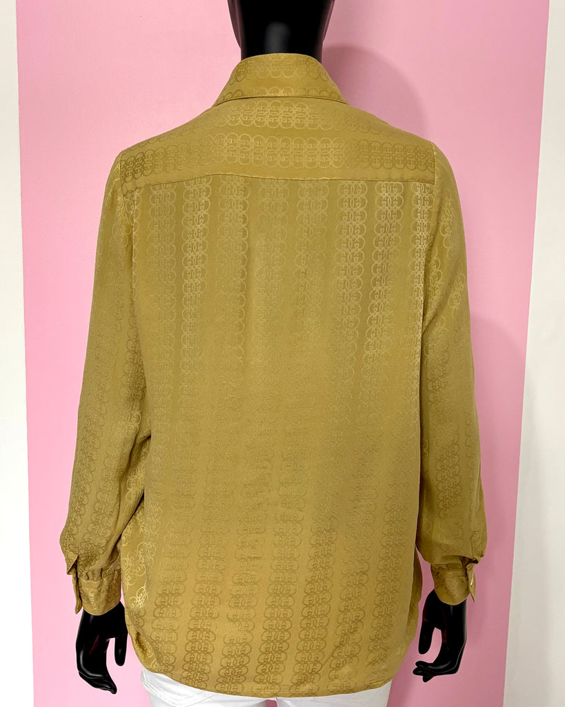 Chemisier en soie façonnée du monogramme de la maison de couleur dorée. Coupe droite, col en pointe et fermeture par simple boutonnage. Manches avec jeu de plis aux poignets fermés par 1 bouton.